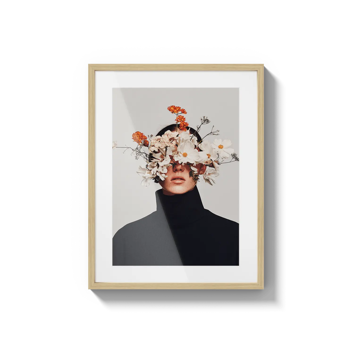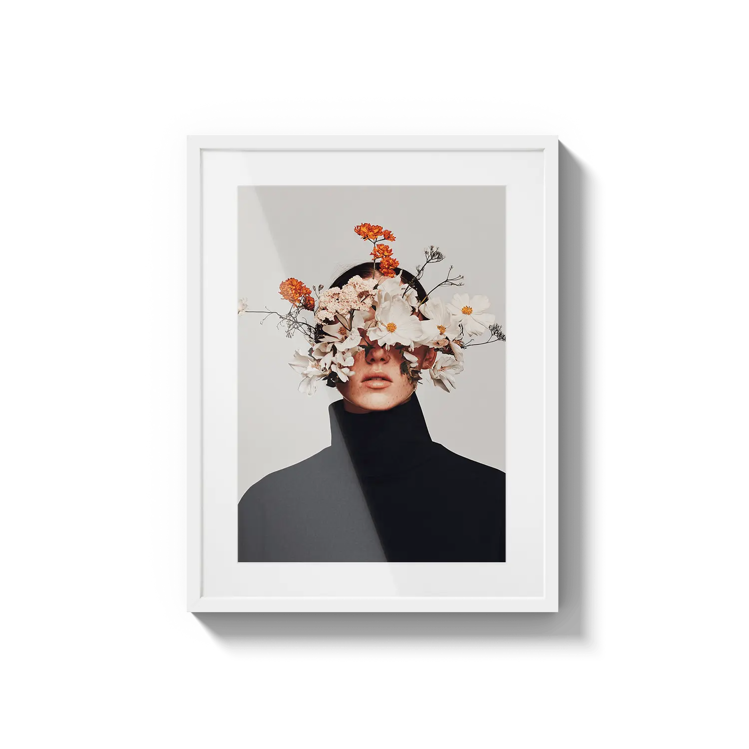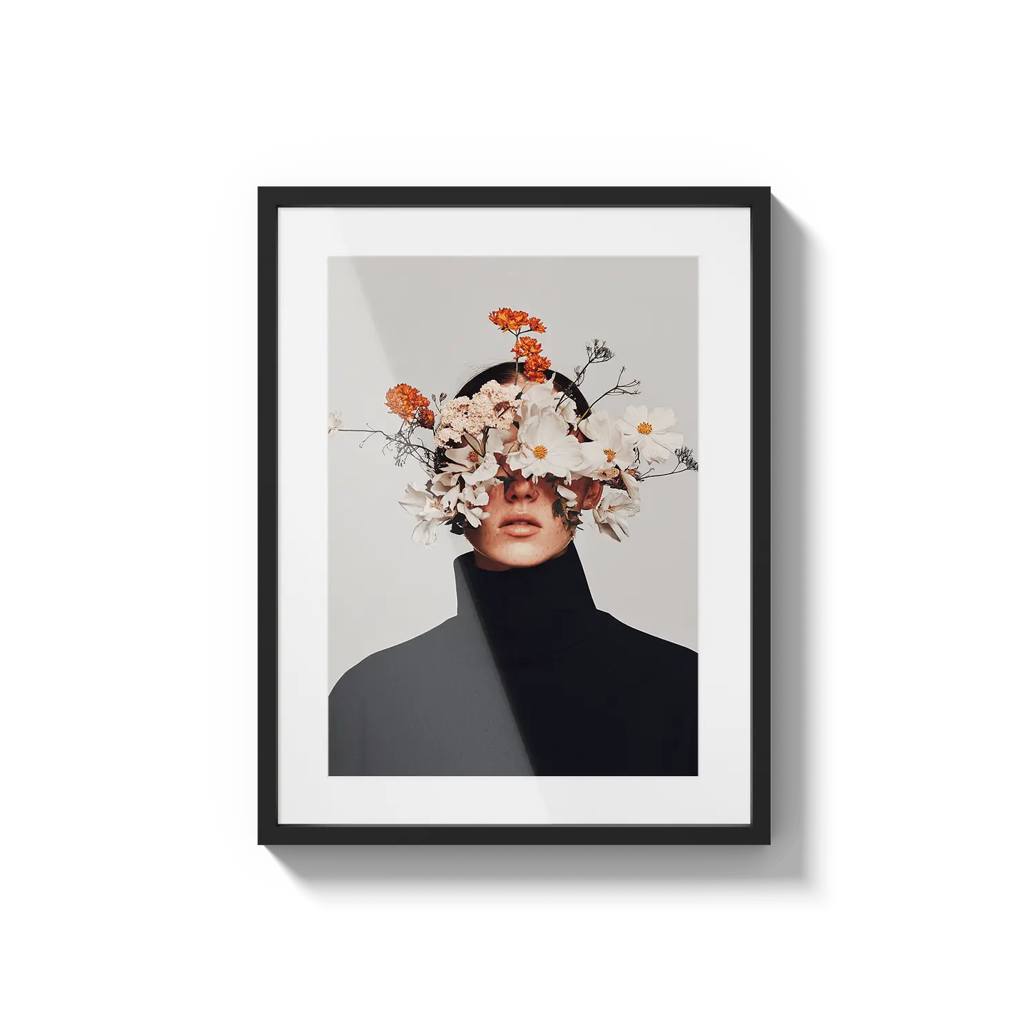 Um retrato sereno onde flores desabrocham suavemente ao redor do rosto, misturando quietude e imaginação. Um presente terno e expressivo.
