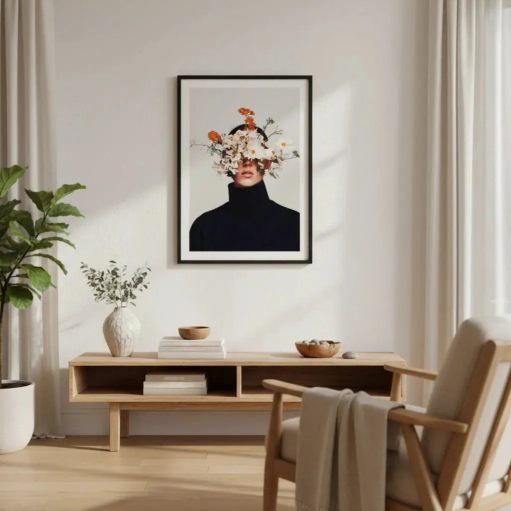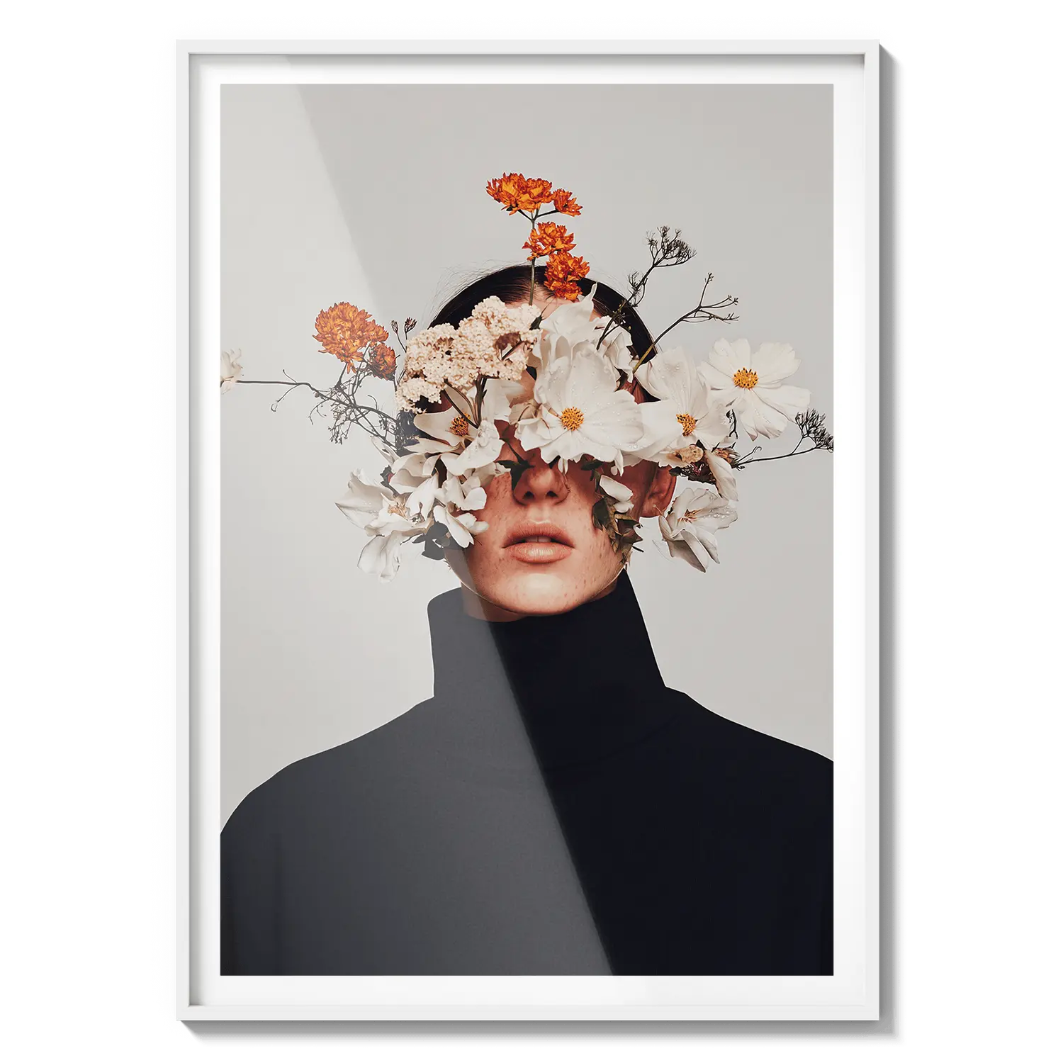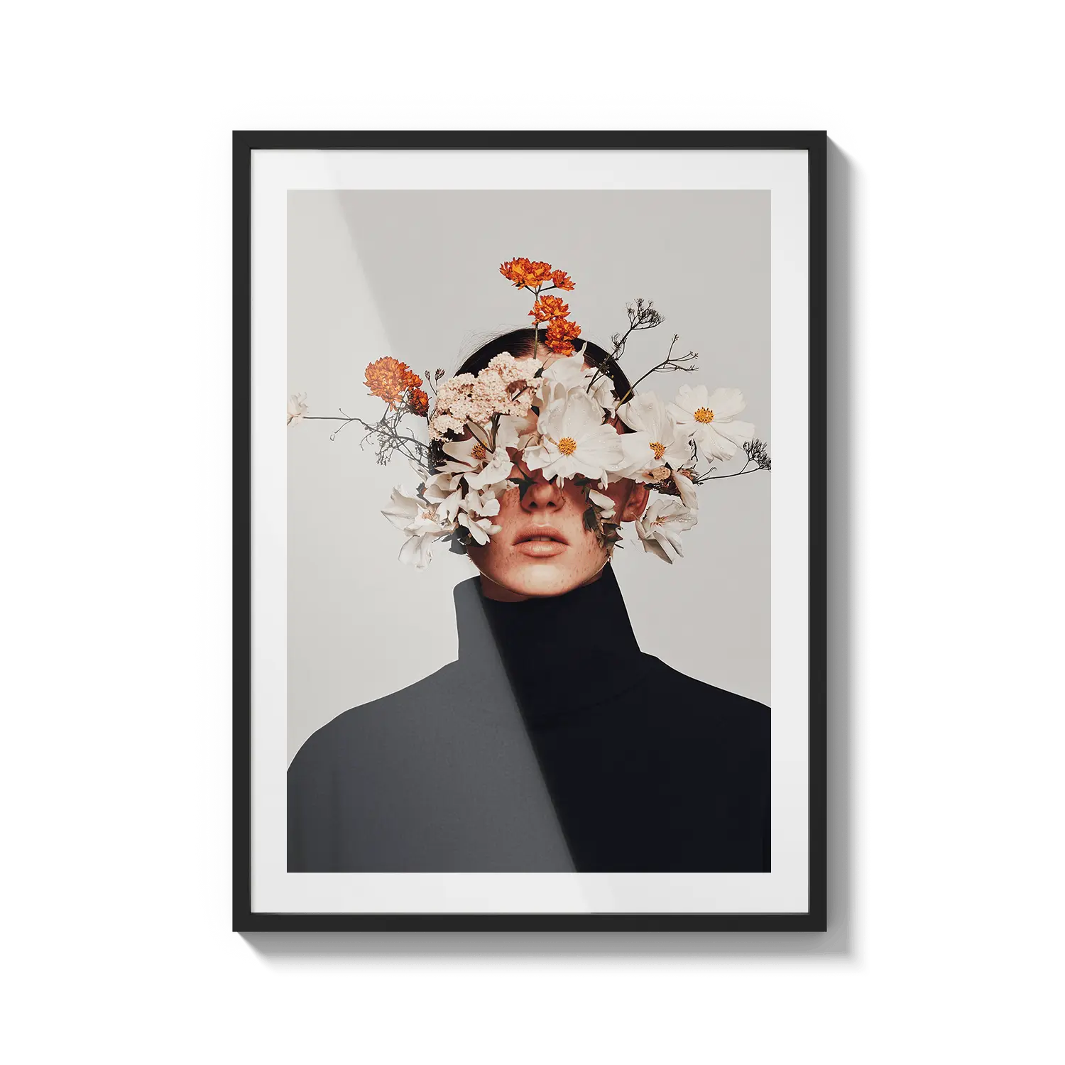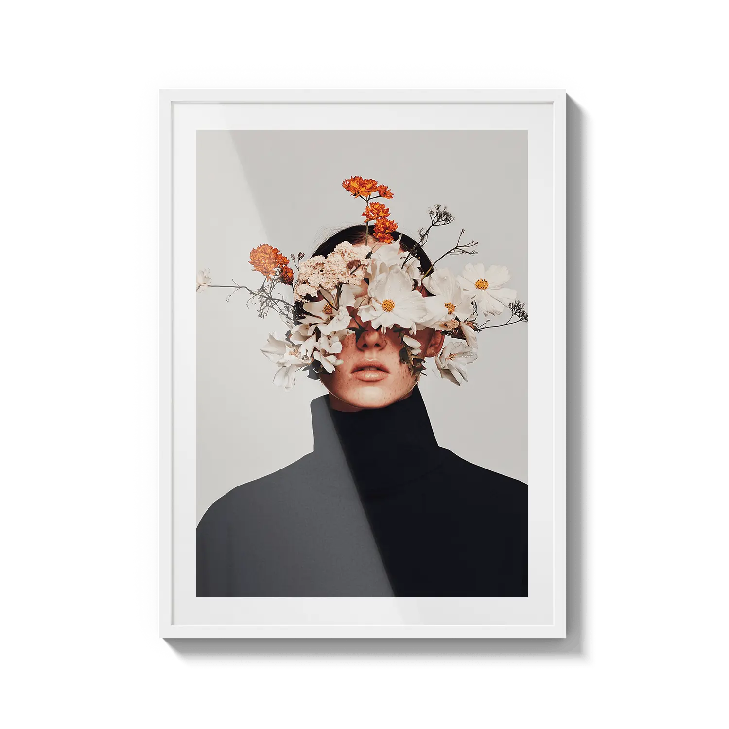 Um retrato sereno onde flores desabrocham suavemente ao redor do rosto, misturando quietude e imaginação. Um presente terno e expressivo.