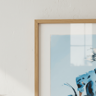 Uma ilustração suave de uma mulher caminhando por tons azuis suaves, evocando liberdade e confiança tranquila. Uma obra de arte atenciosa para oferecer a alguém que aprecia momentos de calma.