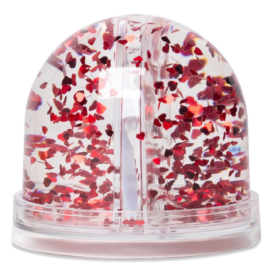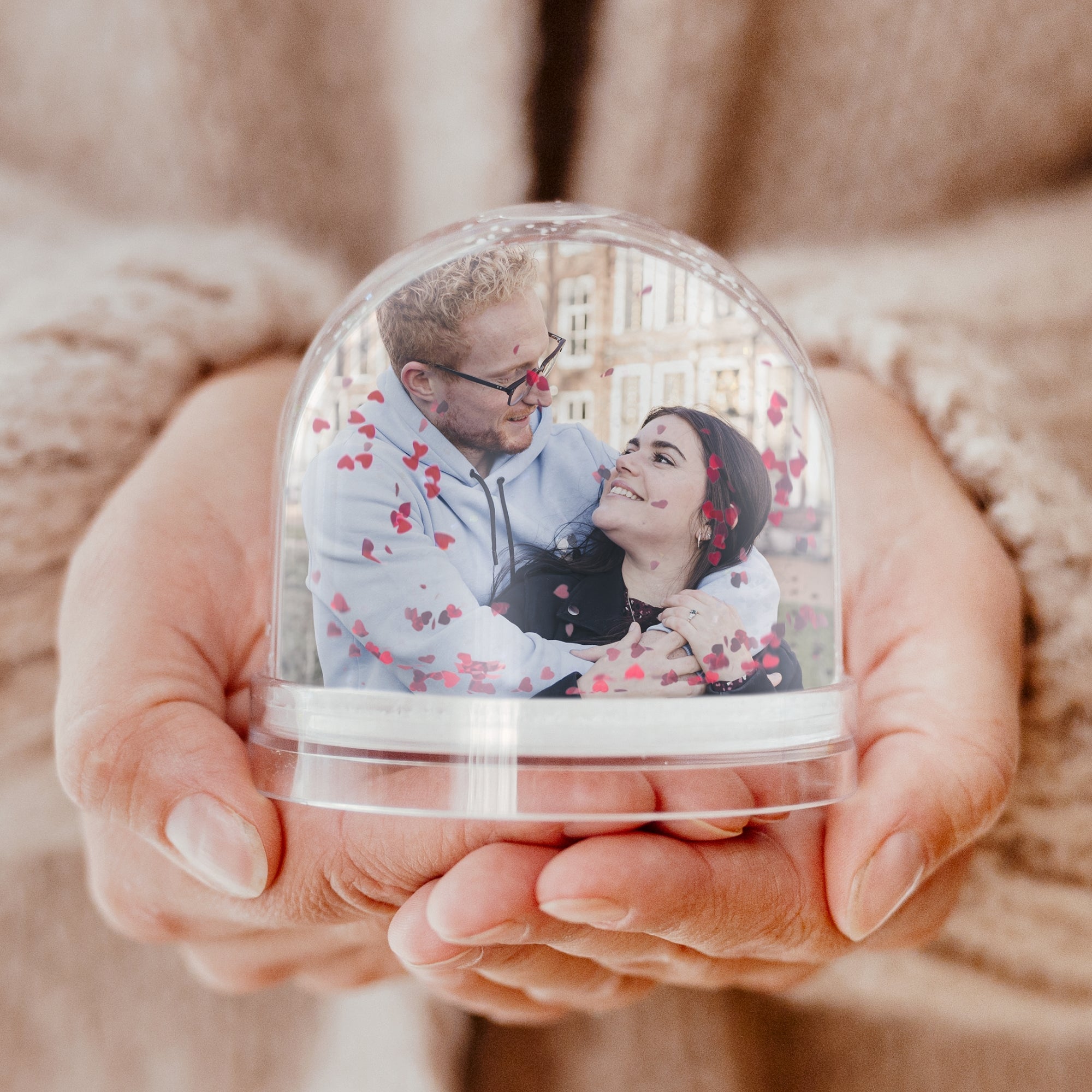 Mais informações sobre a bola de neve personalizada: Material: Plexiglas de alta qualidade Dimensões: 8,5 x 9 cm Impressão: impressão fotográfica em cores vibrantes e em ambos os lados Personalização: com foto e/ou texto Efeito: agite a bola e os corações vermelhos giram alegremente