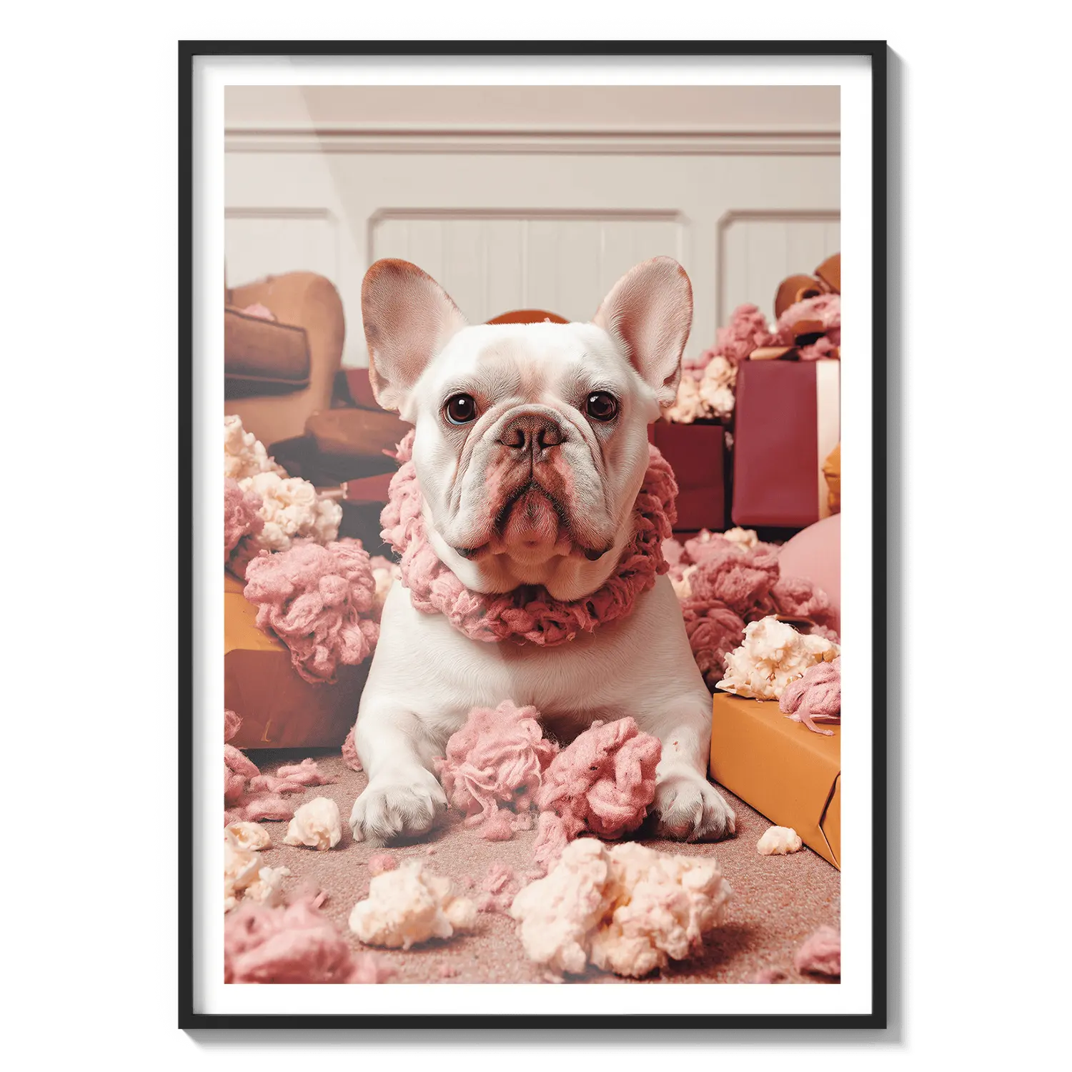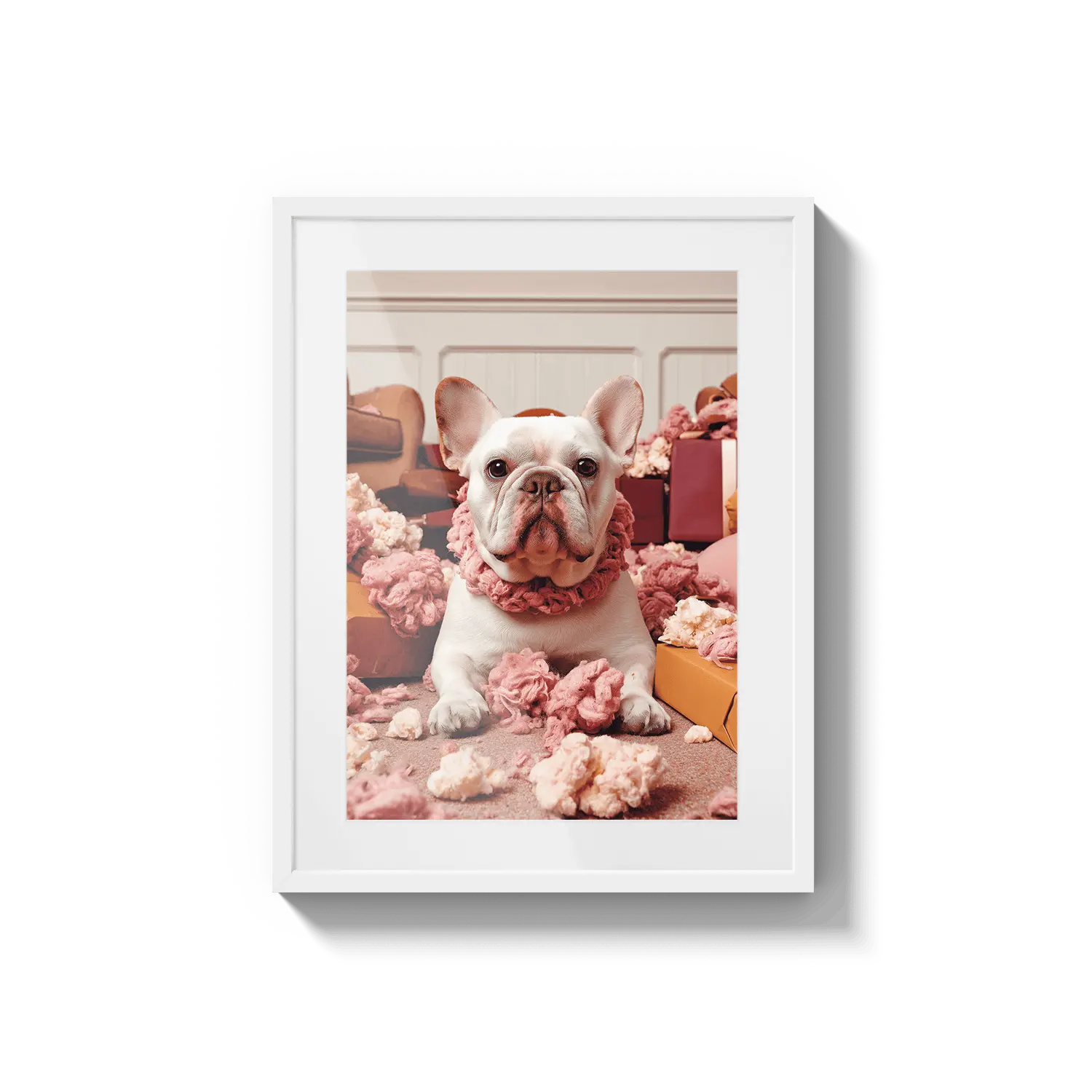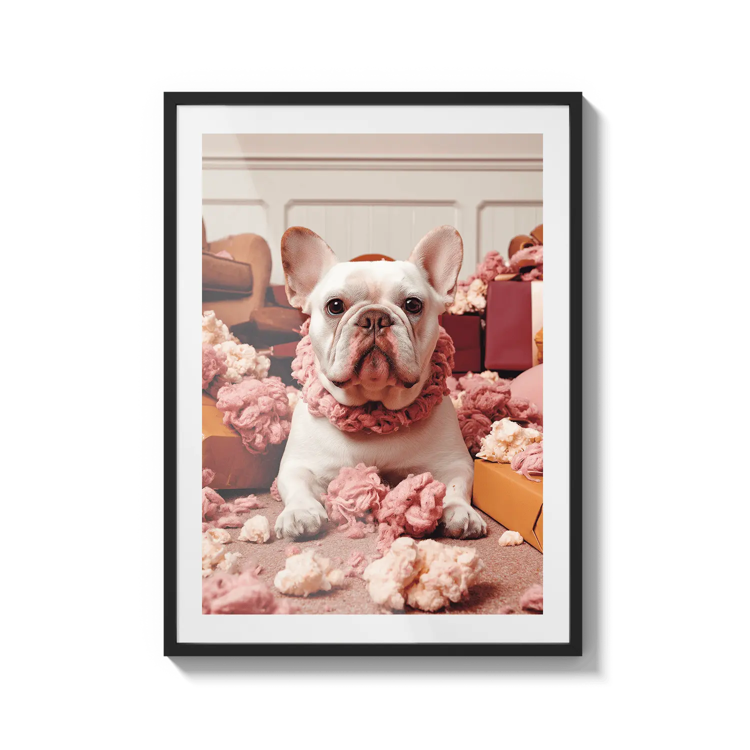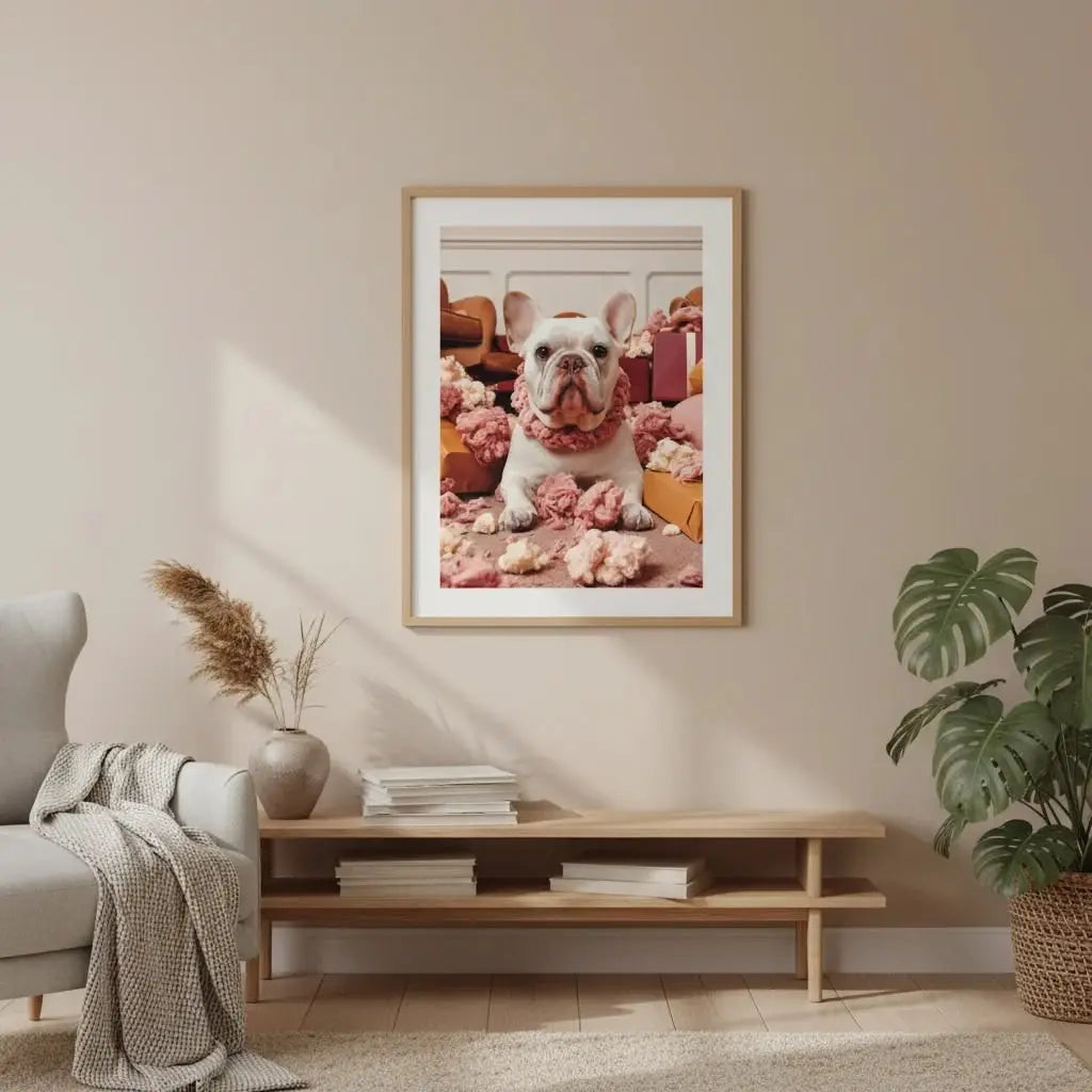 Um doce buldogue cercado por delicadas flores cor-de-rosa, oferecendo ternura com um toque de brincadeira. Um presente charmoso e caloroso.