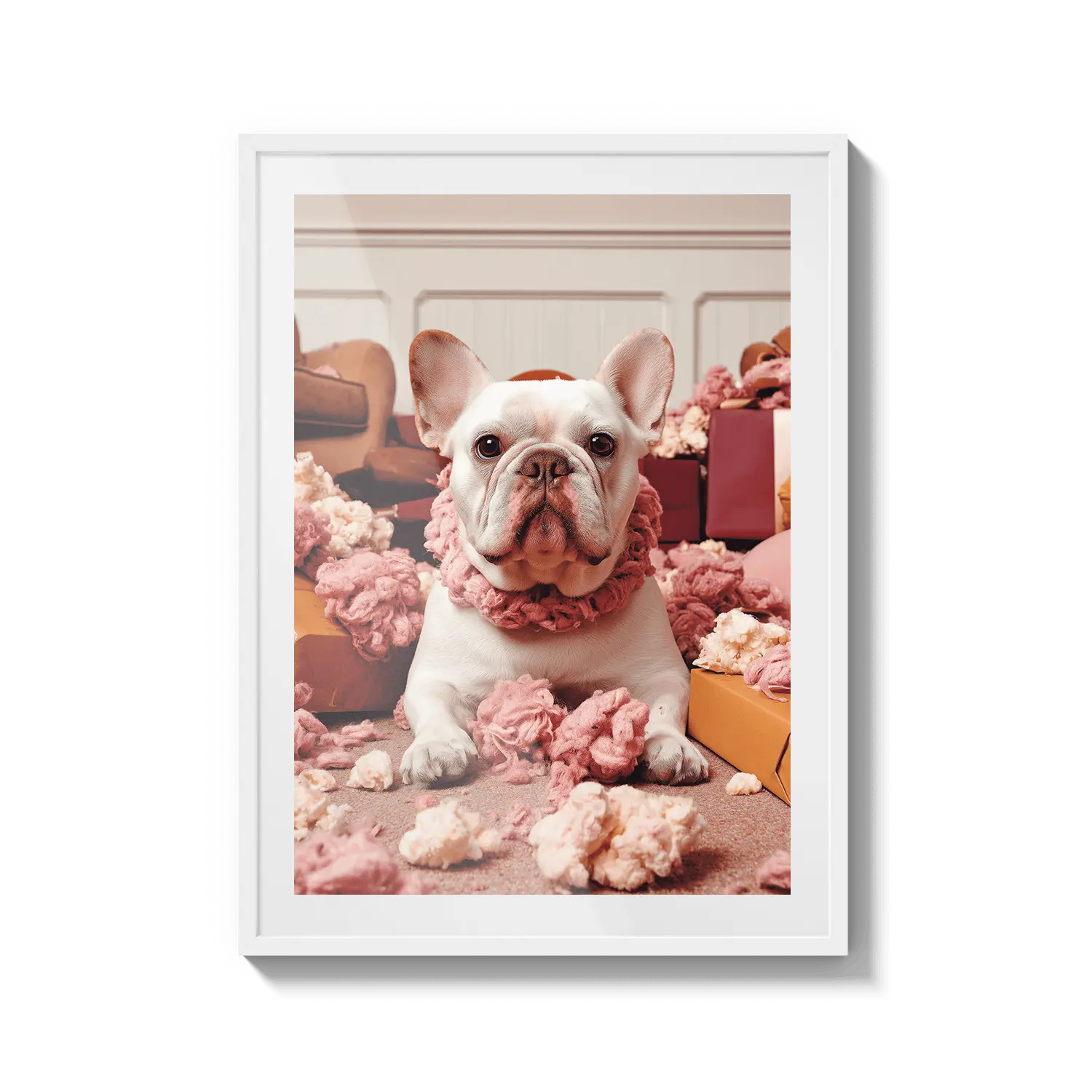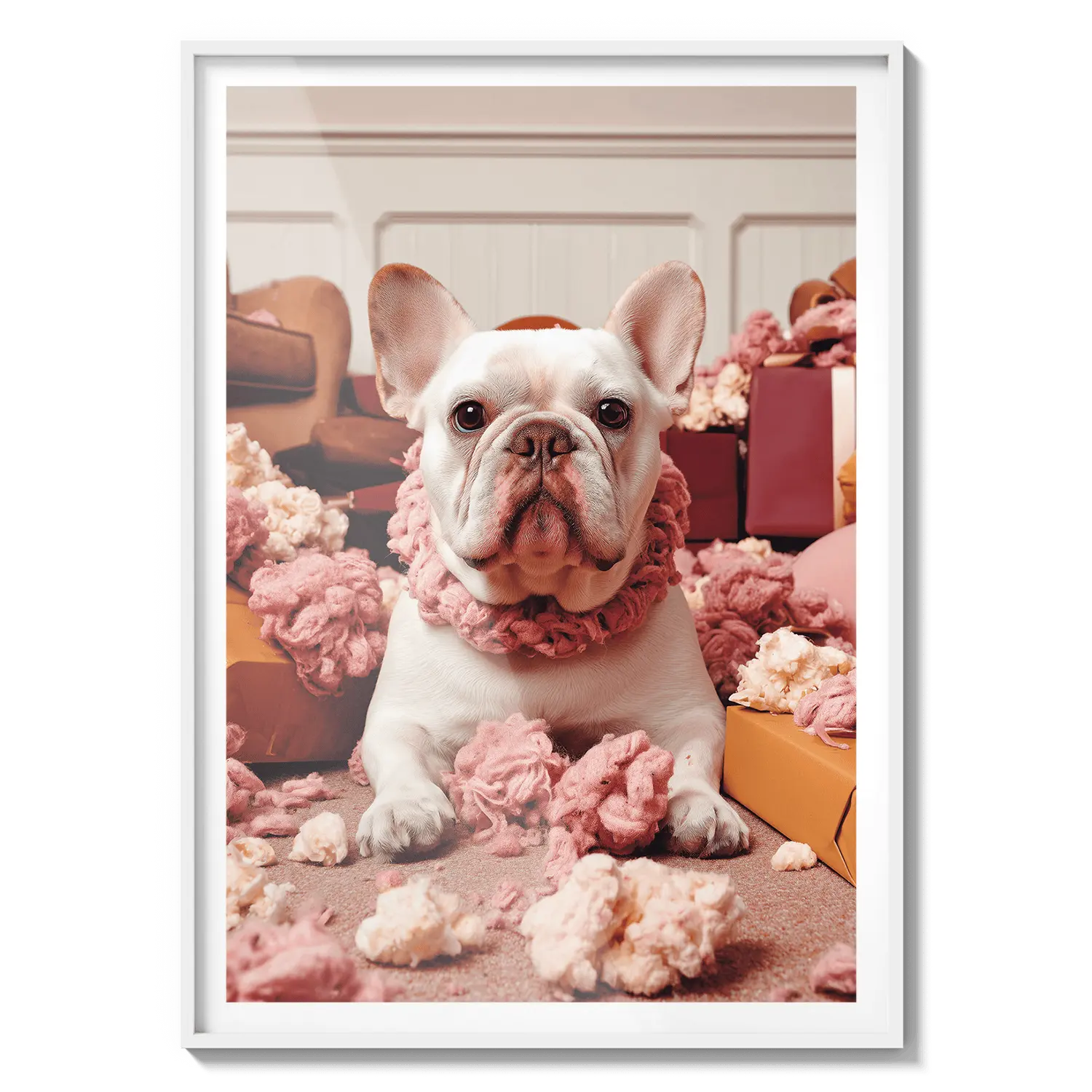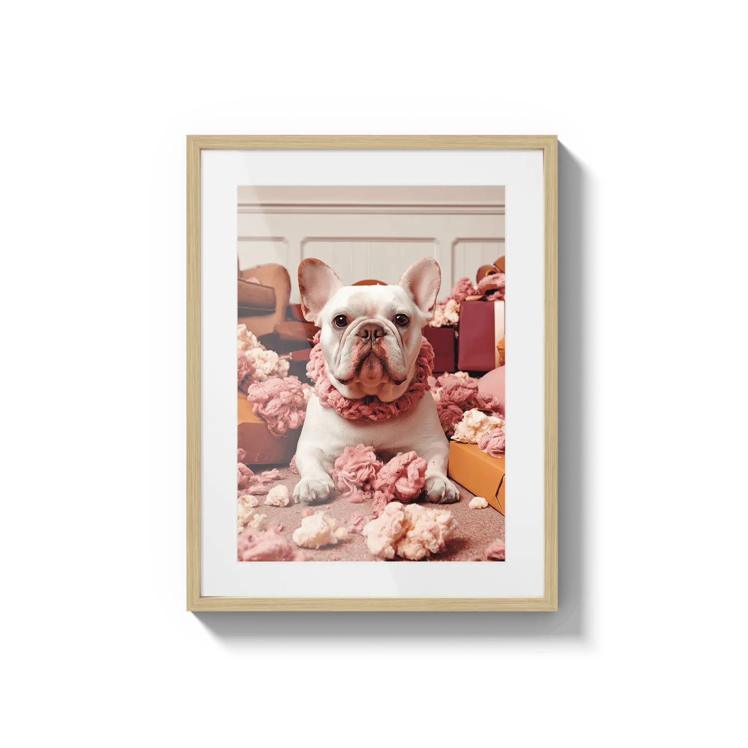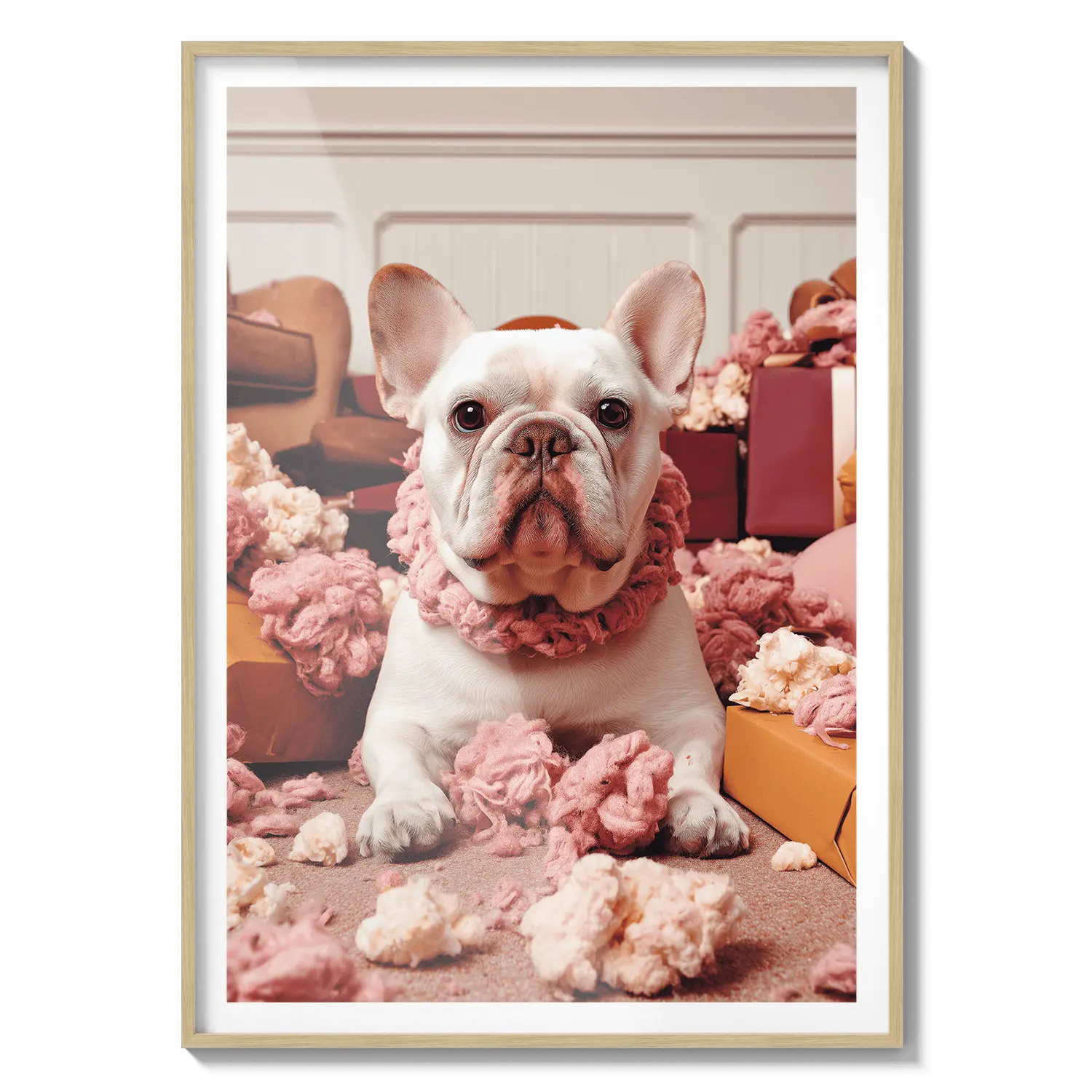 Um doce buldogue cercado por delicadas flores cor-de-rosa, oferecendo ternura com um toque de brincadeira. Um presente charmoso e caloroso.