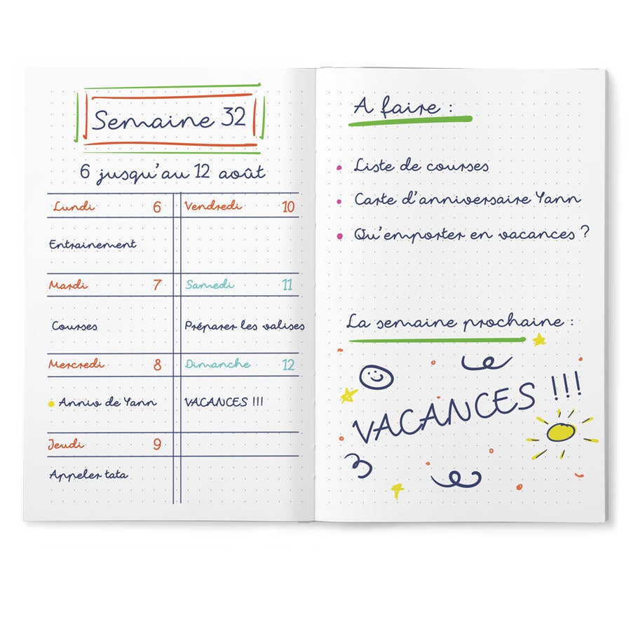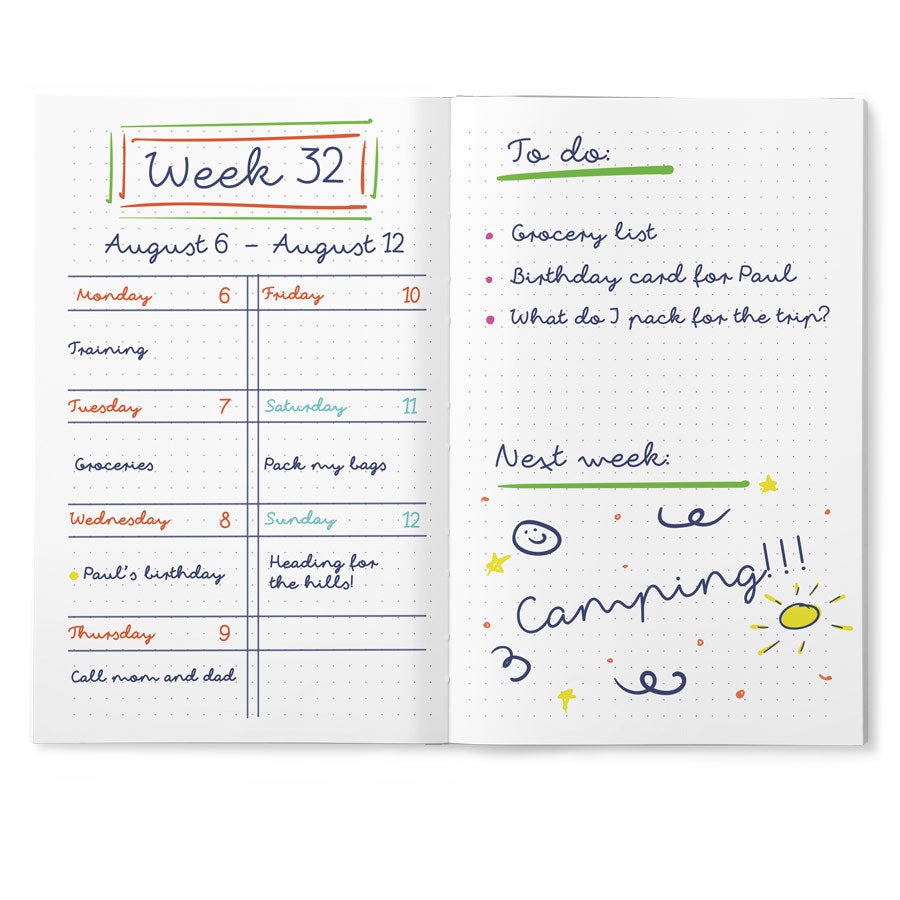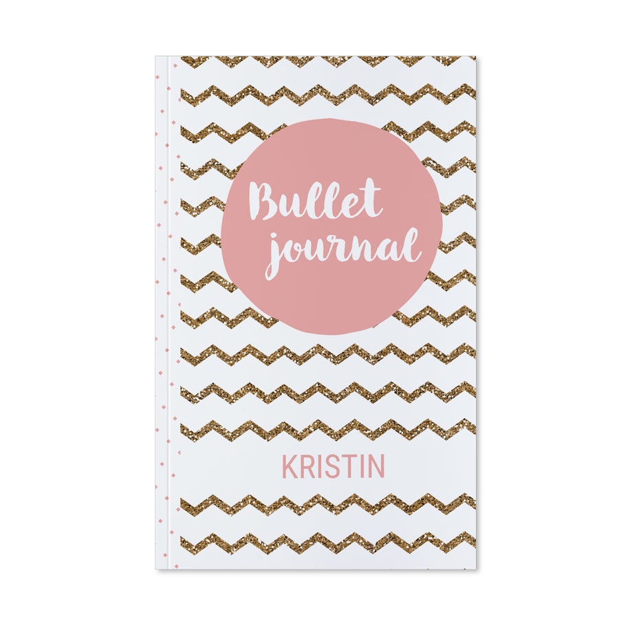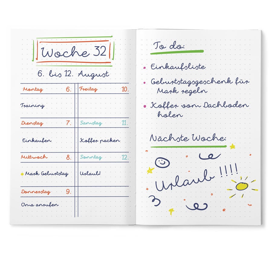 Mais informações sobre o Bullet Journal impresso: Capa: Brochura Formato: 20,5 x 13 x 1,8 cm Páginas: 120 páginas no estilo Bullet Journal Personalização: com foto, texto e/ou logo Impressão: em toda a volta, incluindo a lombada e a parte de trás! Por motivos técnicos, infelizmente não é possível processar caracteres cirílicos, turcos ou especiais.