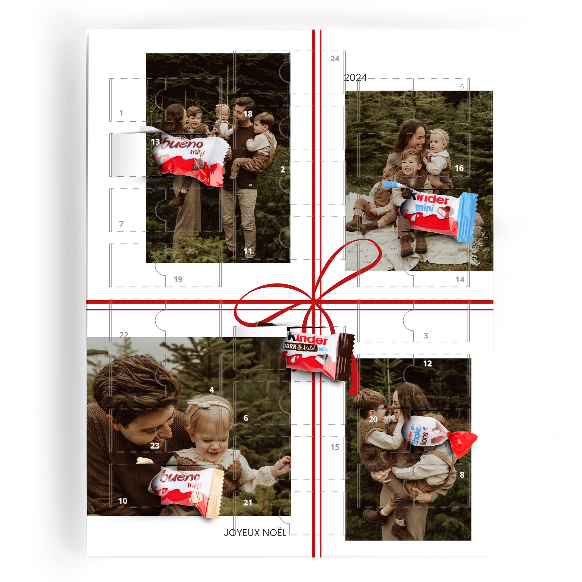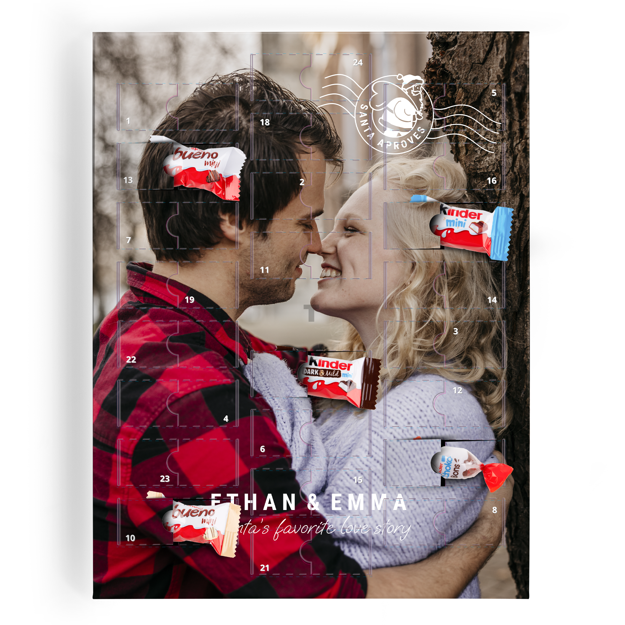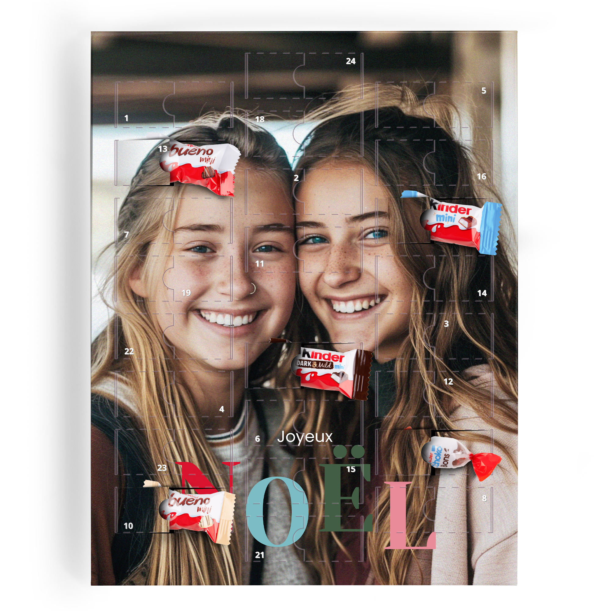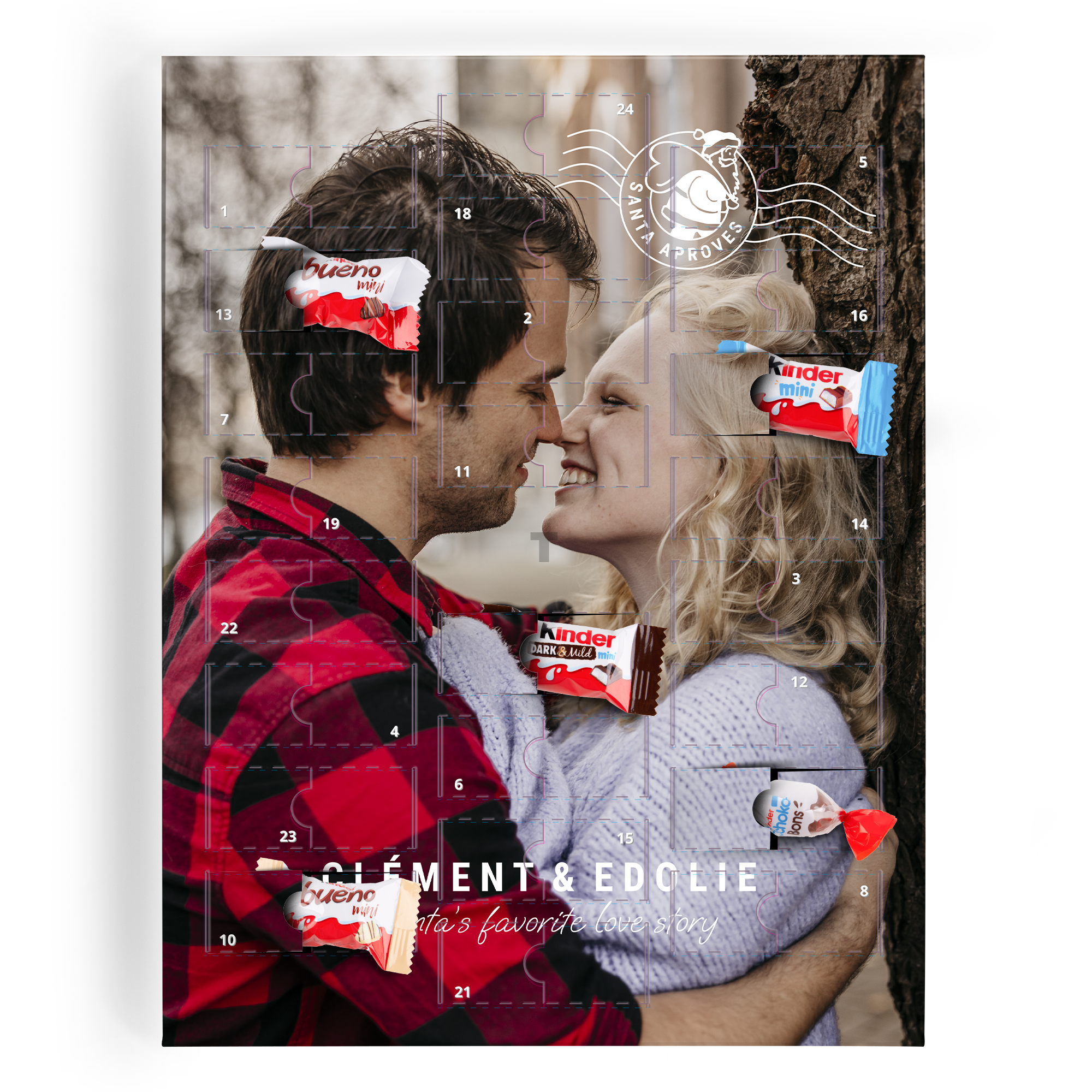 Calendário do advento personalizado com a foto, nome e/ou texto de sua escolha, acompanhado de 24 deliciosos chocolates kinder Happy Moments.