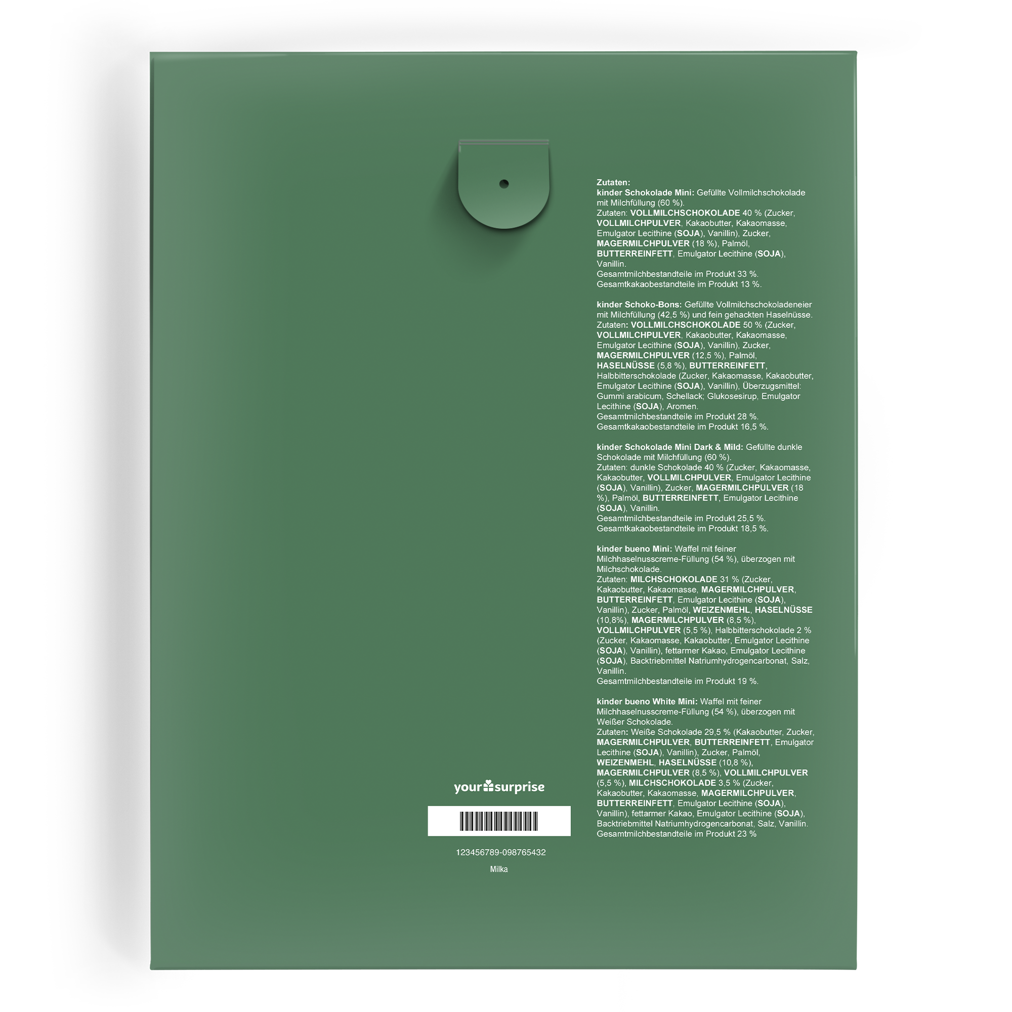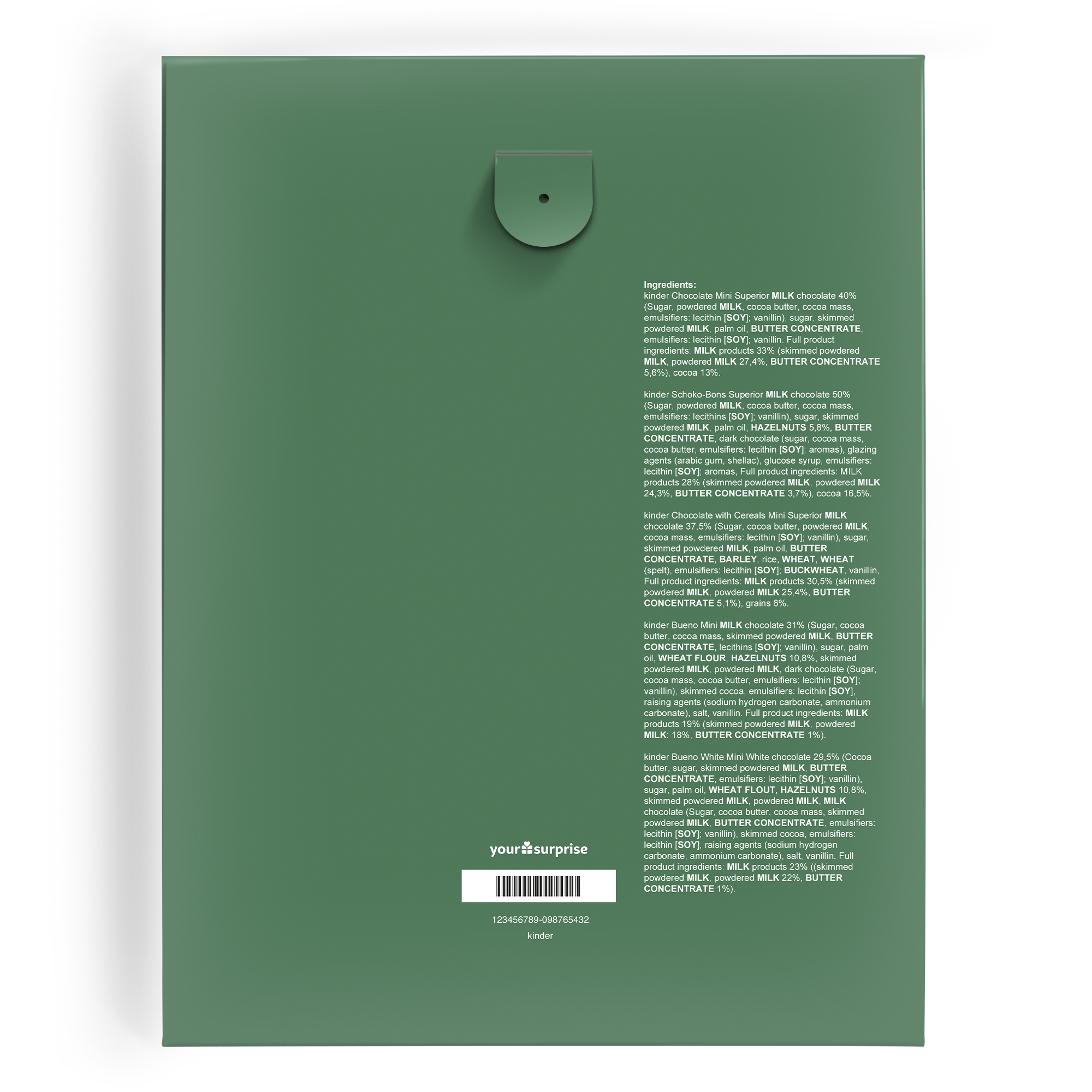 Mais informações sobre o calendário do advento personalizado kinder Happy Moments:Inclui: 24 deliciosos chocolates kinderRecheio: mini mix kinder Happy MomentsDimensões: 23,7 x 30,5 x 2,5 cmNúmero de dias: 24 (1 - 24 de dezembro)Personalização: com nome, foto e/ou logotipoImpressão: coloridoPor razões técnicas, não é possível utilizar caracteres cirílicos, árabes, asiáticos, gregos ou especiais.Ingredientes: chocolate kinder Mini Superior chocolate ao LEITE 40% (Açúcar, leite em pó, manteiga de cacau, massa de cacau, emulsificantes: lecitina [SOJA]; baunilha), açúcar, leite em pó desnatado, óleo de palma, CONCENTRADO DE MANTEIGA, emulsificantes: lecitina [SOJA]; baunilha. Ingredientes completos do produto: produtos lácteos 33% (leite em pó desnatado, leite em pó 27,4%, CONCENTRADO DE MANTEIGA 5,6%), cacau 13%. kinder Schoko-Bons Superior chocolate ao LEITE 50% (Açúcar, leite em pó, manteiga de cacau, massa de cacau, emulsificantes: lecitinas [SOJA]; baunilha), açúcar, leite em pó desnatado, óleo de palma, AVELÃS 5,8%, CONCENTRADO DE MANTEIGA, chocolate amargo (açúcar, massa de cacau, manteiga de cacau, emulsificantes: lecitina [SOJA]; aromas), agentes de cobertura (goma arábica, shellac), xarope de glicose, emulsificantes: lecitina [SOJA]; aromas, Ingredientes completos do produto: produtos lácteos 28% (leite em pó desnatado, leite em pó 24,3%, CONCENTRADO DE MANTEIGA 3,7%), cacau 16,5%. kinder Chocolate com Cereais Mini chocolate ao LEITE Superior 37,5% (Açúcar, manteiga de cacau, leite em pó, massa de cacau, emulsificantes: lecitina [SOJA]; baunilha), açúcar, leite em pó desnatado, óleo de palma, CONCENTRADO DE MANTEIGA, CEVADA, arroz, TRIGO, TRIGO (espelta), emulsificantes: lecitina [SOJA]; TRIGO SARRACENO, baunilha, Ingredientes completos do produto: produtos lácteos 30,5% (leite em pó desnatado, leite em pó 25,4%, CONCENTRADO DE MANTEIGA 5,1%), grãos 6%. kinder Bueno Mini chocolate ao LEITE 31% (Açúcar, manteiga de cacau, massa de cacau, leite em pó desnatado, CONCENTRADO DE MANTEIGA, lecitinas [SOJA]; baunilha), açúcar, óleo de palma, FARINHA DE TRIGO, AVELÃS 10,8%, leite em pó desnatado, leite em pó, chocolate amargo (açúcar, massa de cacau, manteiga de cacau, emulsificantes: lecitina [SOJA]; baunilha), cacau desnatado, emulsificantes: lecitina [SOJA], agentes de fermentação (bicarbonato de sódio, carbonato de amônio), sal, baunilha. Ingredientes completos do produto: produtos lácteos 19% (leite em pó desnatado, leite em pó: 18%, CONCENTRADO DE MANTEIGA 1%). kinder Bueno White Mini chocolate branco 29,5% (Manteiga de cacau, açúcar, leite em pó desnatado, CONCENTRADO DE MANTEIGA, emulsificantes: lecitina [SOJA]; baunilha), açúcar, óleo de palma, FARINHA DE TRIGO, AVELÃS 10,8%, leite em pó desnatado, leite em pó, chocolate ao LEITE (açúcar, manteiga de cacau, massa de cacau, leite em pó desnatado, CONCENTRADO DE MANTEIGA, emulsificantes: lecitina [SOJA]; baunilha), cacau desnatado, emulsificantes: lecitina [SOJA], agentes de fermentação (bicarbonato de sódio, carbonato de amônio), sal, baunilha. Ingredientes completos do produto: produtos lácteos 23% (leite em pó desnatado, leite em pó 22%, CONCENTRADO DE MANTEIGA 1%).