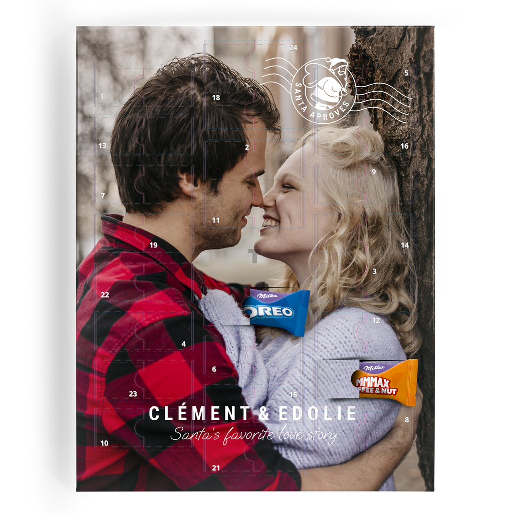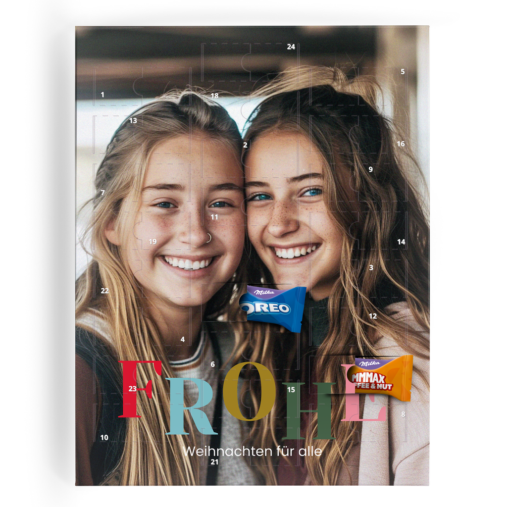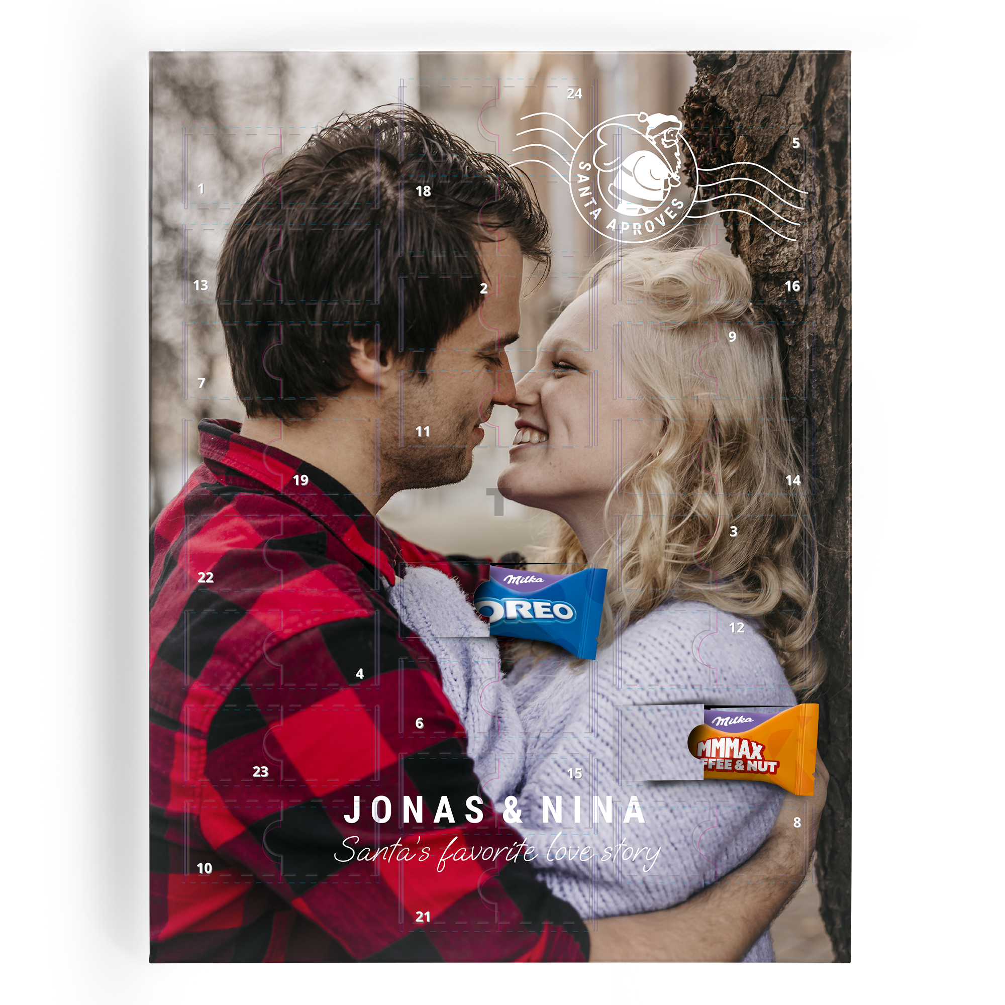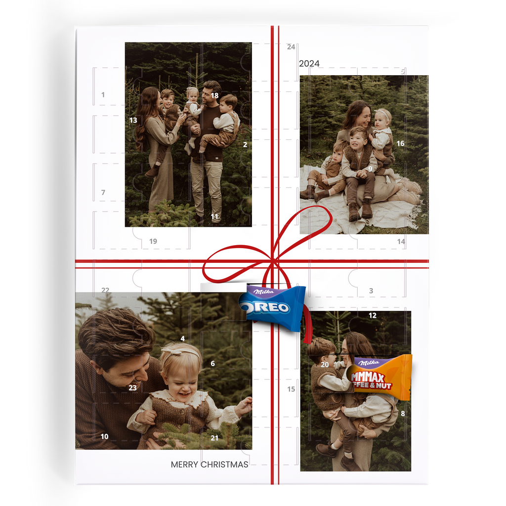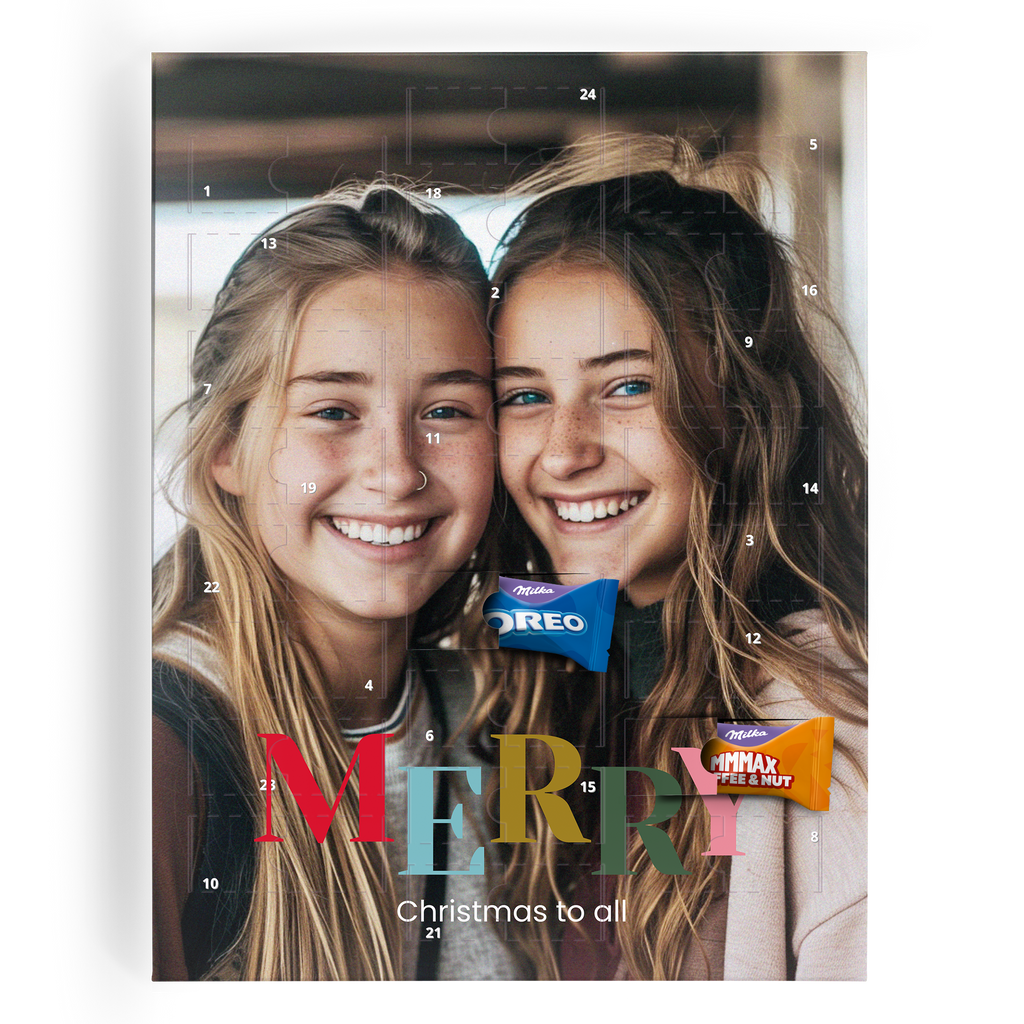 Calendário do Advento com foto, nome e/ou texto. Repleto de 24 deliciosos chocolates Milka. Uma contagem regressiva deliciosa para o Natal!
