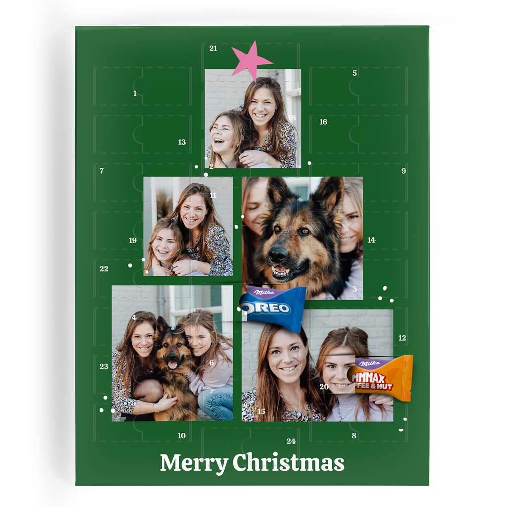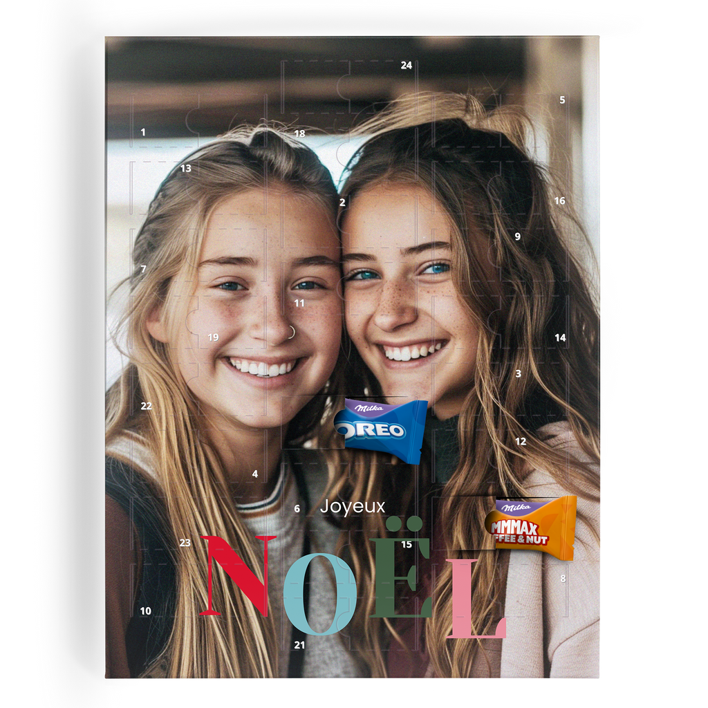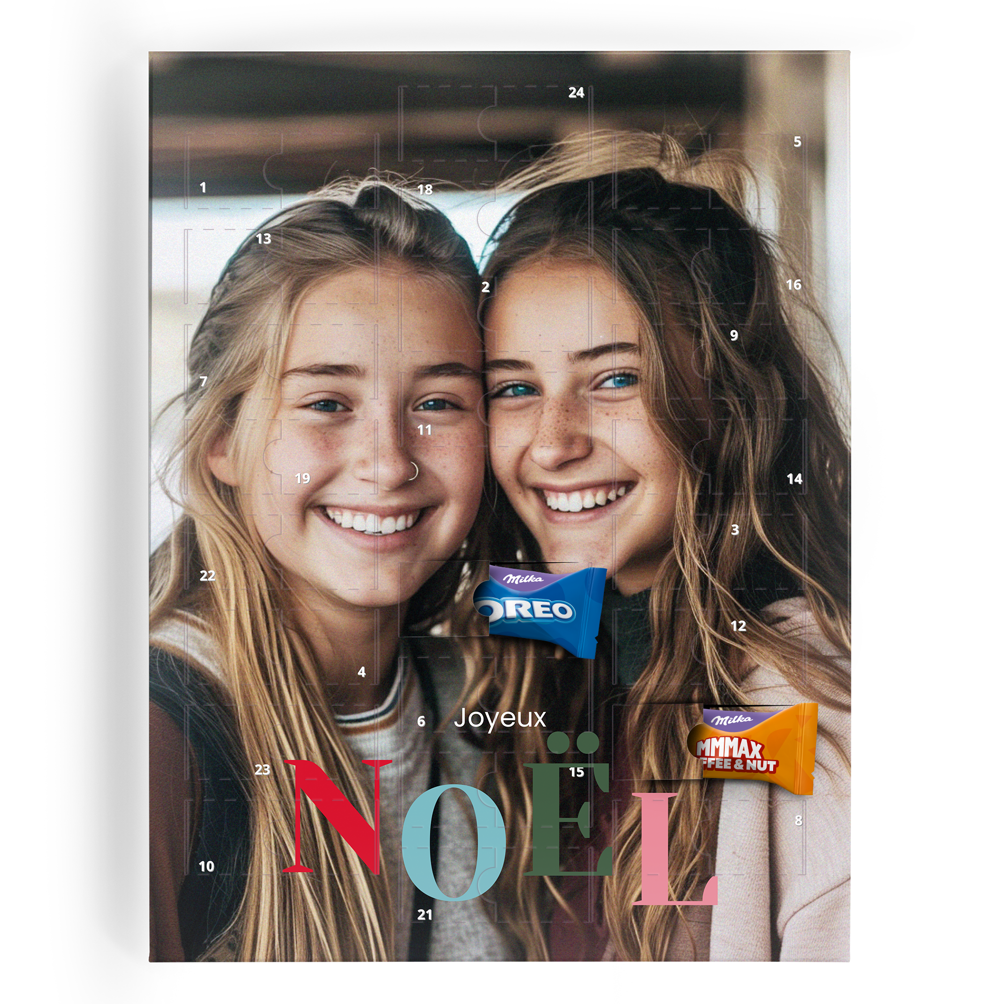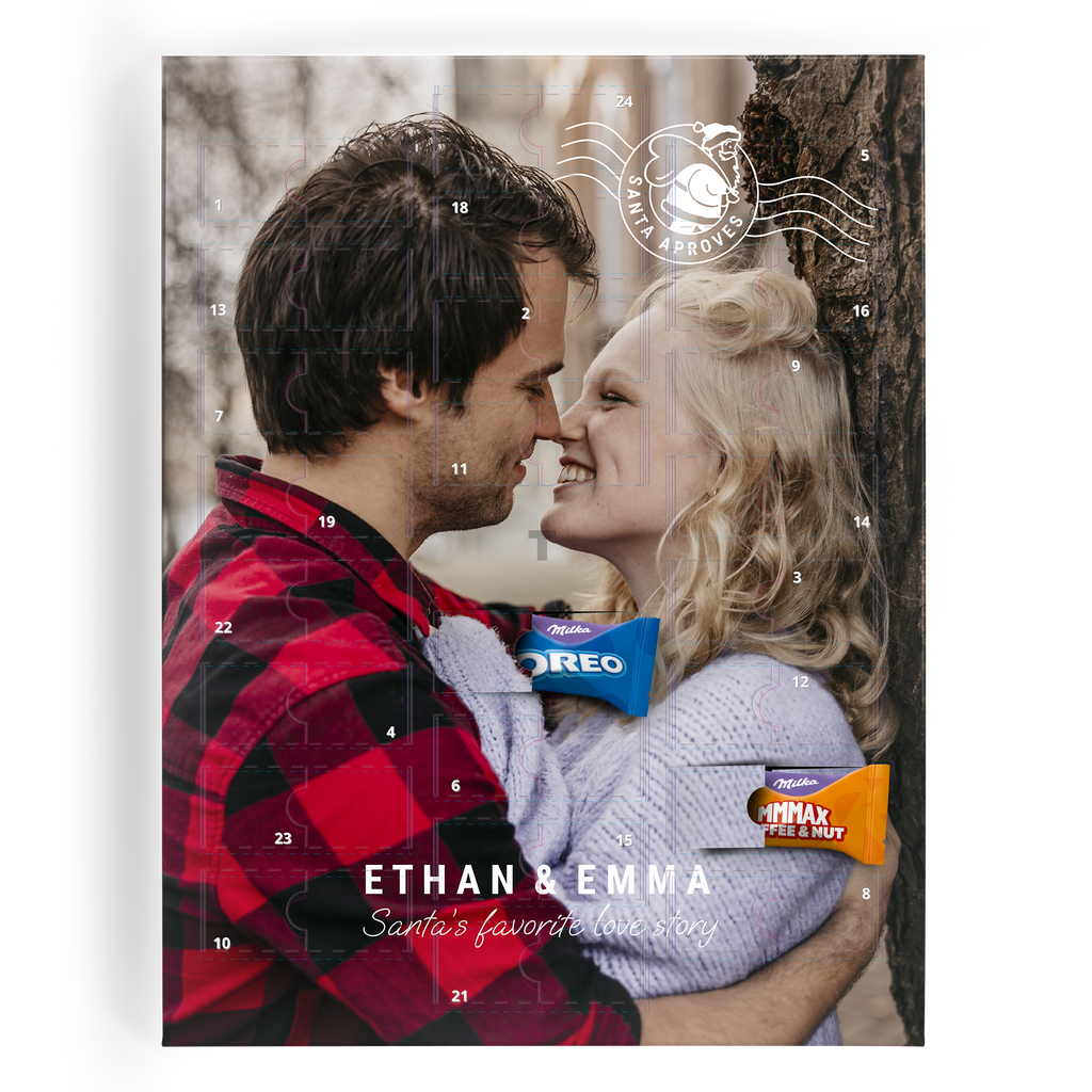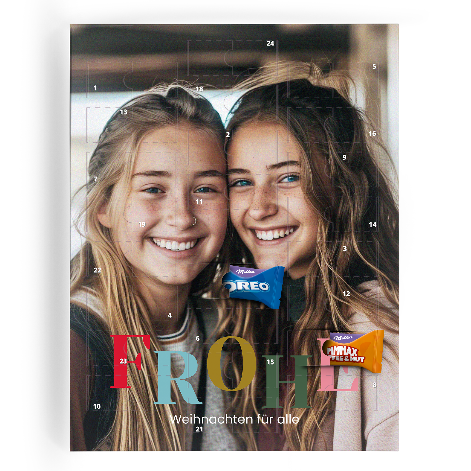 Calendário do Advento com foto, nome e/ou texto. Repleto de 24 deliciosos chocolates Milka. Uma contagem regressiva deliciosa para o Natal!