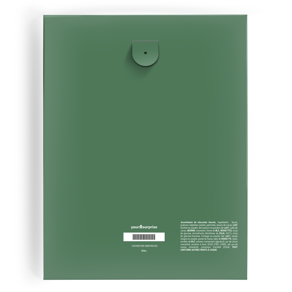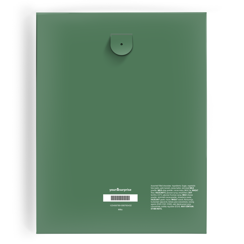 Mais informações sobre o Calendário do Advento Milka:Chocolate: 24 deliciosos chocolates Favoritos MilkaDimensões: 23,7 x 30,5 x 2,5 cmNúmero de dias: 24 (de 1 a 24 de dezembro)Personalização: com nome, foto e/ou logotipoImpressão: coloridoIngredientes: açúcar, gorduras vegetais (palma, palmiste), manteiga de cacau, leite em pó desnatado, massa de cacau, soro de leite, gordura de leite, farinha de TRIGO, AVELÃS, xarope de glicose, emulsificantes (lecitina de SOJA, E471), xarope de glicose-frutose, pó de queijo (de LEITE), cacau em pó desnatado, purê de morango, pasta de AVELÃ, milho, amido de TRIGO, aromas, umectante (glicerol), concentrado de suco de limão, agentes de fermentação (E503, E501, E500), sal, concentrado de suco de groselha preta, regulador de acidez (E524)Alérgenos: Pode conter outras NOZESInfelizmente, por razões técnicas, não é possível processar caracteres cirílicos, árabes, asiáticos, gregos ou especiais.
