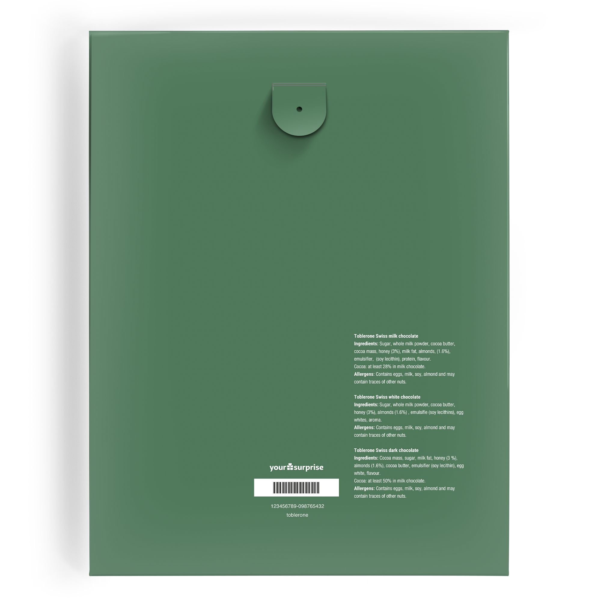 Mais informações sobre o Calendário do Advento Toblerone: Inclui: 24 deliciosos chocolates Toblerone ao leite, puro e branco. Recheio: leite alpino, morango, avelã, creme de cacau. Dimensões: 23,7 x 30,5 x 2,5 cm. Número de dias: 24 (de 1 a 24 de dezembro). Personalização: com nome, foto e/ou logotipo. Impressão: colorida. Chocolate ao leite suíço Toblerone. Ingredientes: Açúcar, leite em pó integral, manteiga de cacau, massa de cacau, mel (3%), gordura do leite, amêndoas (1,6%), emulsificante (lecitina de soja), proteína, aromatizante. Cacau: pelo menos 28% no chocolate ao leite. Alérgenos: Contém ovo, leite, soja, amêndoa e pode conter traços de outras nozes. Chocolate branco suíço Toblerone. Ingredientes: Açúcar, leite em pó integral, manteiga de cacau, mel (3%), amêndoas (1,6%), emulsificante (lecitina de soja), claras de ovo, aromatizante. Alérgenos: Contém ovo, leite, soja, amêndoa e pode conter traços de outras nozes. Chocolate amargo suíço Toblerone. Ingredientes: Pasta de cacau, açúcar, gordura do leite, mel (3%), amêndoas (1,6%), manteiga de cacau, emulsificante (lecitina de soja), clara de ovo, aromatizante. Cacau: pelo menos 50% no chocolate ao leite. Alérgenos: Contém ovo, leite, soja, amêndoa e pode conter traços de outras nozes. Infelizmente, por razões técnicas, não é possível processar caracteres cirílicos, árabes, asiáticos, gregos ou especiais.