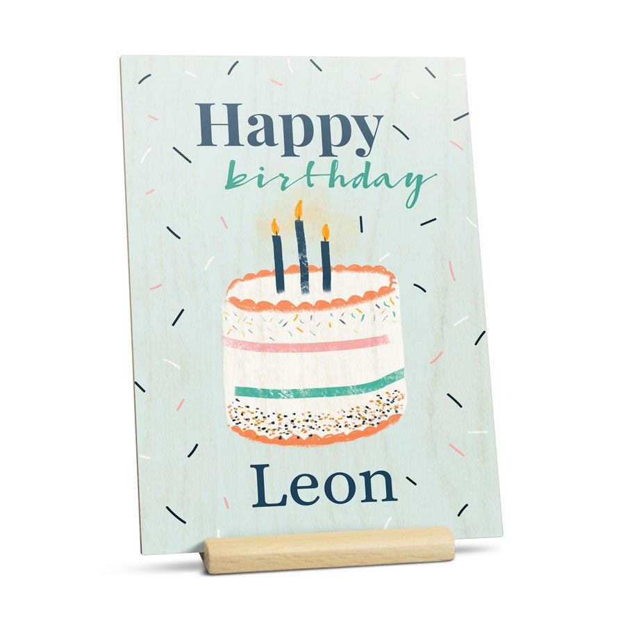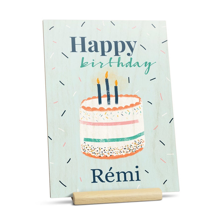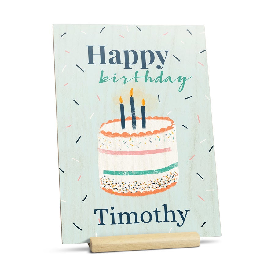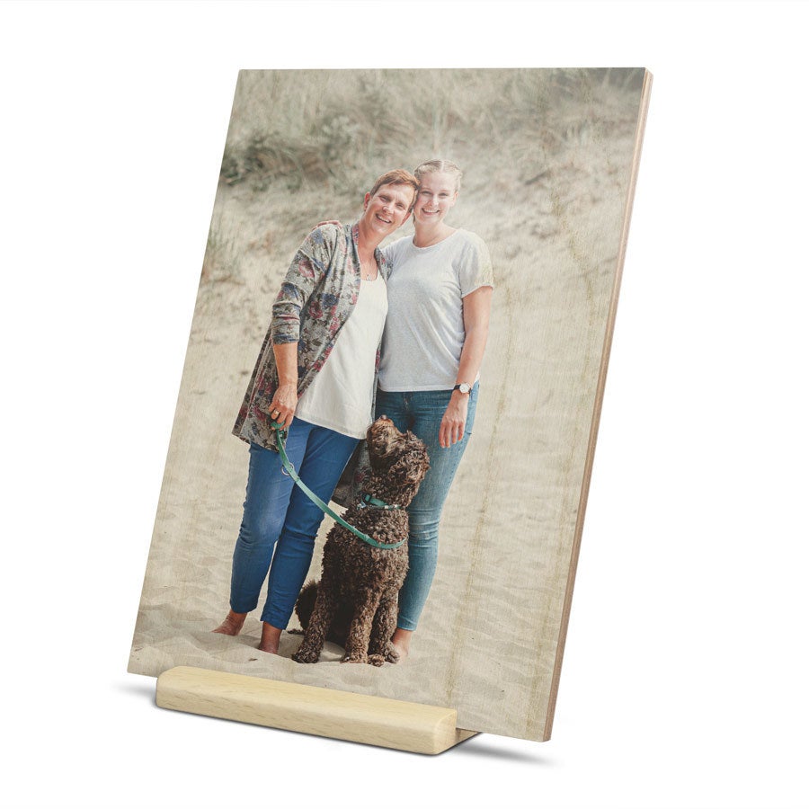 Mais informações sobre o cartão de madeira personalizado:Material: madeira de alta qualidade com acabamento natural Tamanho: 16,7 x 12 cmImpressão: impressão UV em cores perfeitas Personalização: com nome, foto e/ou texto Extra: incluindo suporte de madeira prático Bom saber: A estrutura natural da madeira será visível através da sua foto, criando um efeito único. Portanto, esteja ciente de que seu presente pode diferir ligeiramente das imagens no site.