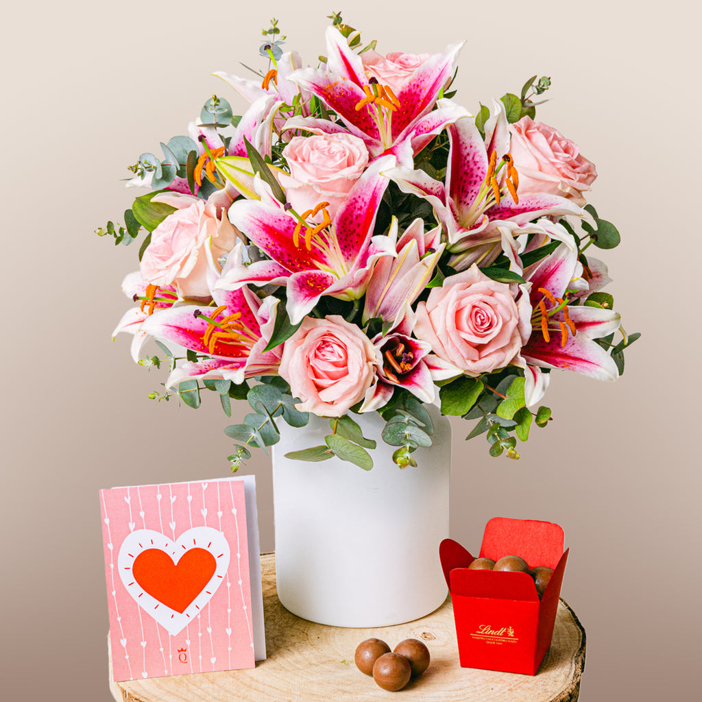 Este adorável arranjo vem em diferentes tons de rosas e lírios cor-de-rosa. O rosa é conhecido como a cor da serenidade, energia positiva, inspiração e esperança. Uma beleza única e mais vendida que conhece o verdadeiro significado do poder das flores.