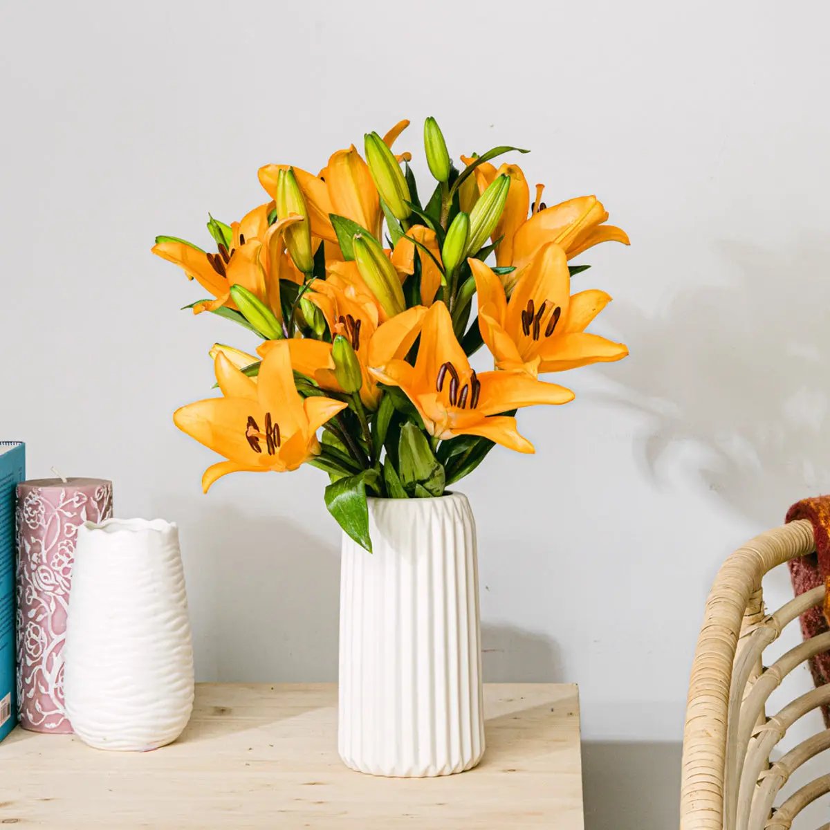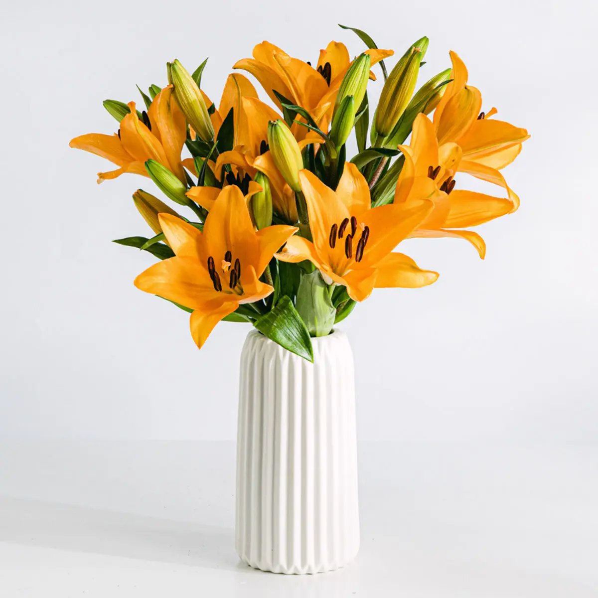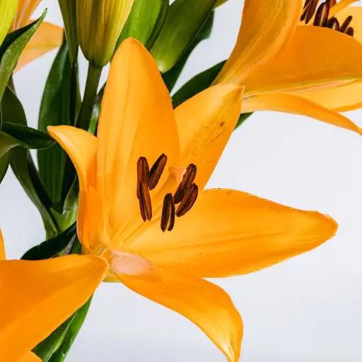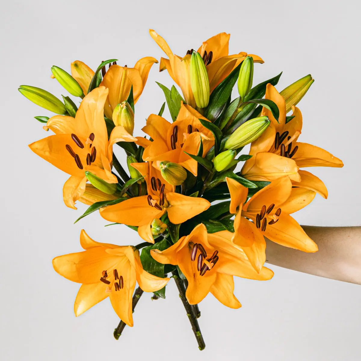 Comemore qualquer grande momento da sua vida com seus entes queridos e na companhia das grandes flores do lírio asiático laranja, cujas pétalas largas falam de amor, compromisso e da intensidade que usamos para enfrentar qualquer tarefa. Perfeito para... Reconhecer o esforço realizado.