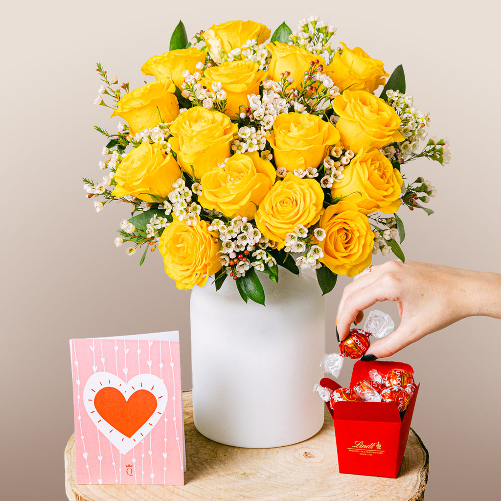 Assim como aquela pessoa que instantaneamente faz tudo ficar bem, este buquê vai iluminar até os dias mais cinzentos. Um arranjo radiante com rosas amarelas salpicadas de flor de cera branca, com ruscus e lentisco contrastantes para adicionar um toque de frescor.