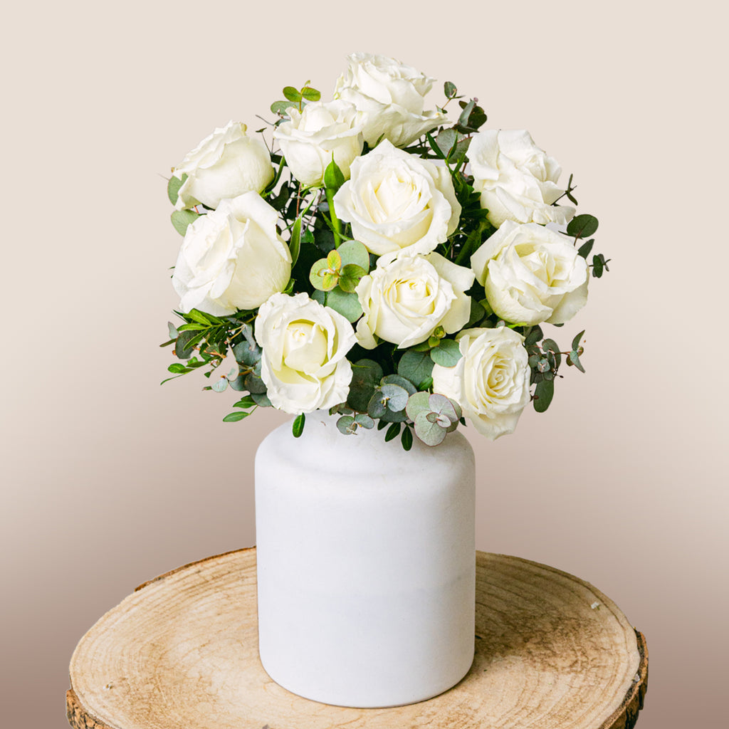 As rosas brancas simbolizam pureza, respeito e novos começos. O eucalipto adiciona um toque refrescante e um aroma calmante, promovendo clareza e bem-estar. Juntos, eles criam uma atmosfera de tranquilidade e esperança.