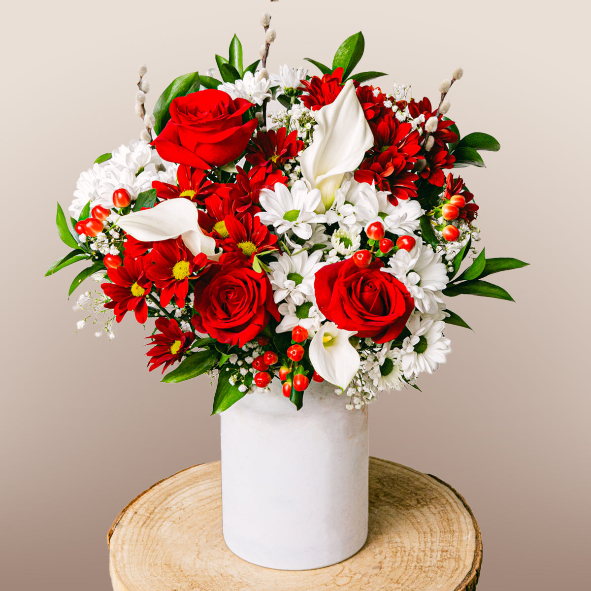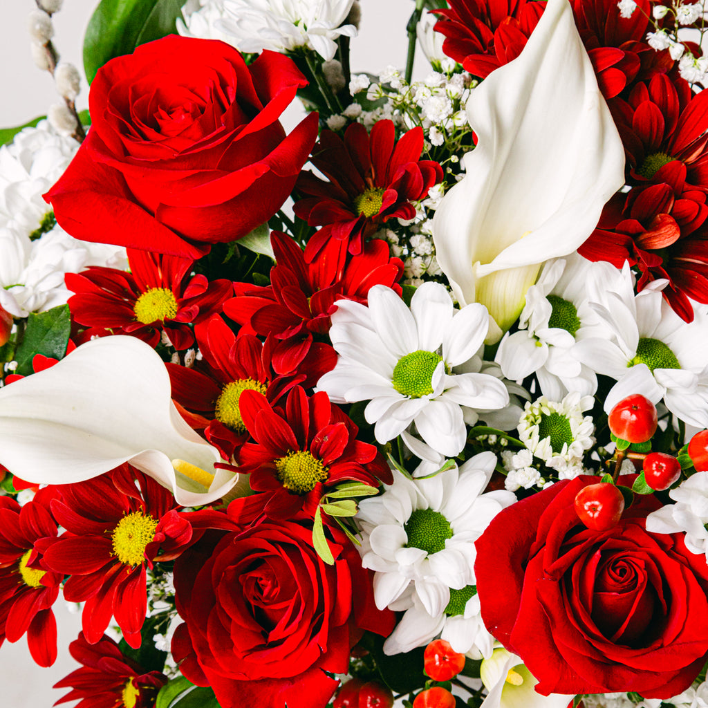 As lírios Calla receberam o nome da palavra grega para belo - Calla. Dizem que são um amuleto de boa sorte para ter felicidade o ano todo. Sua santidade e pureza são complementadas por rosas vermelhas clássicas e apaixonadas, tornando este um deslumbrante buquê yin-yang.