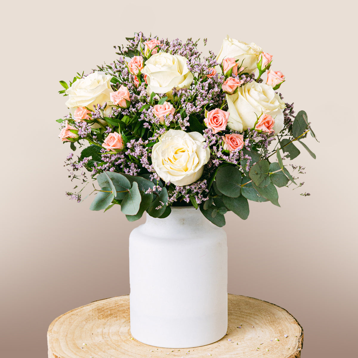 Rosas brancas e pêssego combinadas no Rose Delight para criar um lindo buquê repleto de cores quentes. O lírio rosa adiciona um toque selvagem à composição, tornando-o o buquê ideal para decorar qualquer ambiente. Deixe-se encantar pelo doce aroma das rosas. Não deixe para amanhã o que você pode enviar hoje. Ideal para… Celebrar a chegada de um novo bebê.