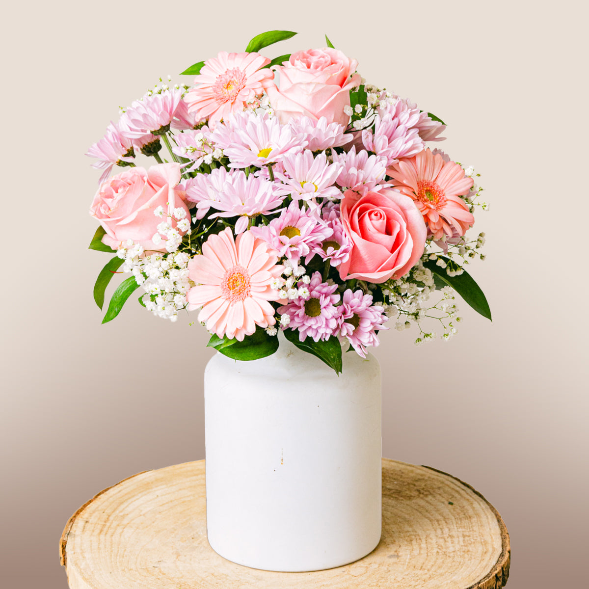 Este buquê, composto por rosas, gerberas e crisântemos em tons de rosa, é caracterizado por sua aparência suave e delicada. É o presente ideal para alegrar qualquer ambiente e trazer os pequenos prazeres da vida para dentro de casa.