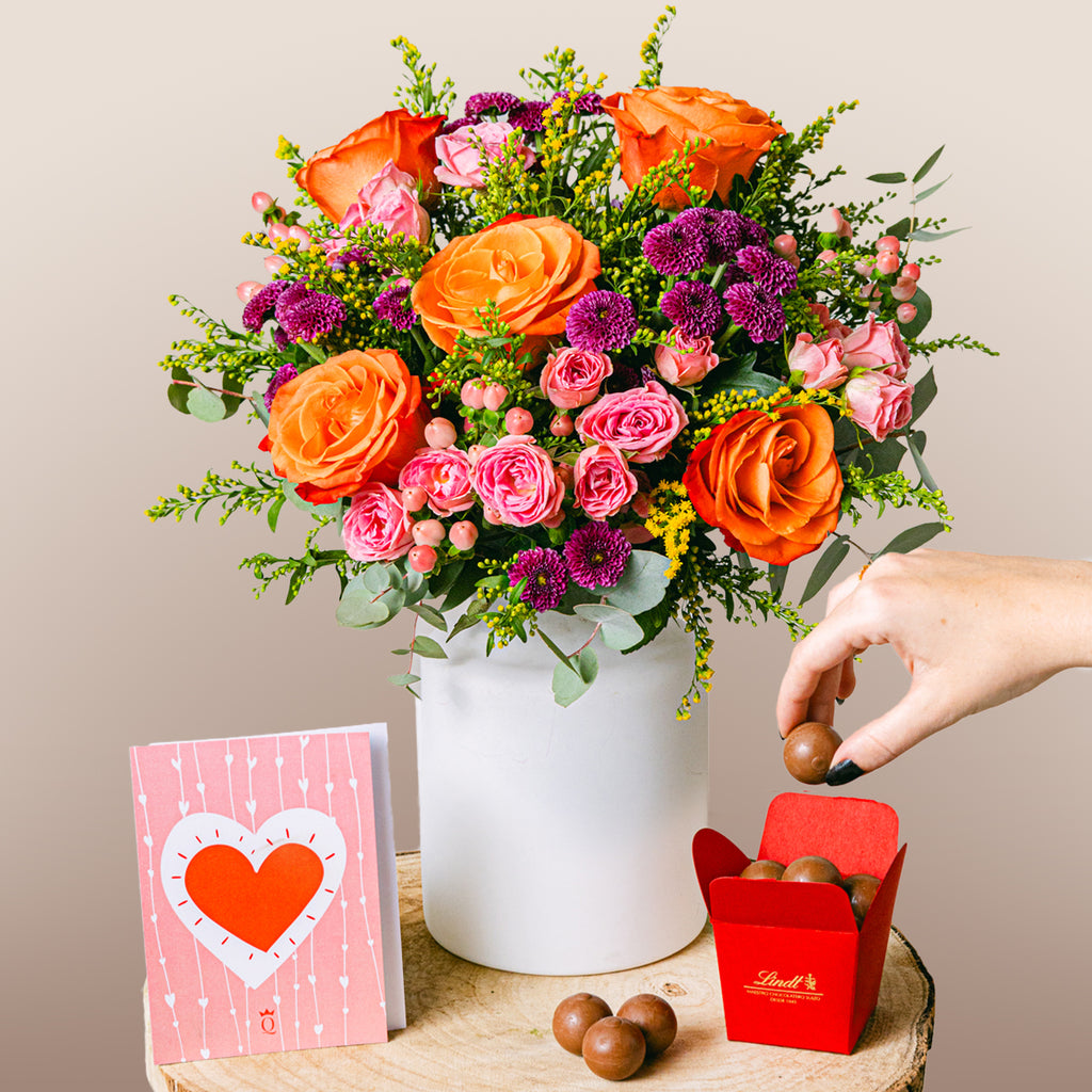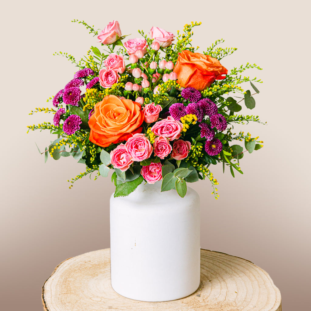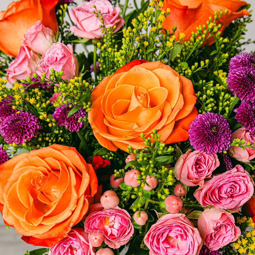 Este buquê é uma linda combinação de rosas laranjas, crisântemos santini e rosas bola de neve. Um presente perfeito para a pessoa mais especial.
