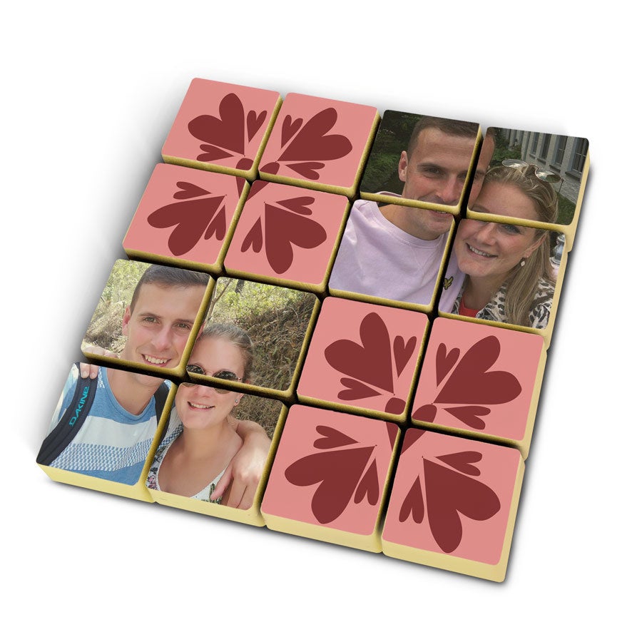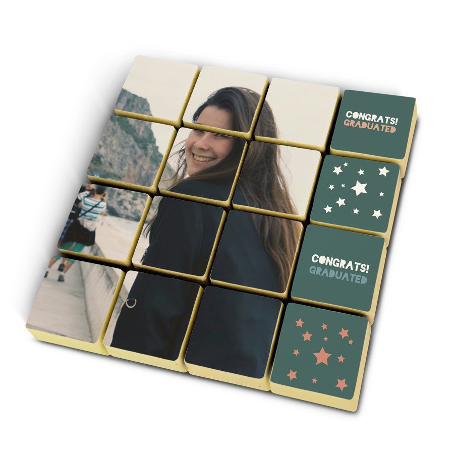 Mais informações sobre a foto dos bombons de chocolate:Quantidade: 16 chocolatesChocolate: chocolate ao leite com uma camada de chocolate branco por cimaRecheio: pralineDimensões por chocolate: 2,6 x 2,6 x 1,2 cmDimensões por conjunto: 23 x 18 x 2,5 cmPersonalização: impresso com foto ou logotipoImpressão: impressão comestível em cores completasQuando a temperatura externa estiver acima de 25 graus Celsius, não poderemos garantir a qualidade do chocolate.Dicas de armazenamento: Pode ser armazenado por até 10 semanas em um local fresco e escuro, entre 14-18°C. Informações sobre alergias: contém soja, leite e pode conter traços de nozes e glúten.Ingredientes:Bombons de chocolate com recheio de avelã e impressão comestível: açúcar, avelãs, massa de cacau, manteiga de cacau, leite em pó integral, emulsificante (lecitina de soja), aroma natural de baunilha.Impressão comestível: amido de milho, amido modificado: E1422, amido de batata, água, proteína de frango em pó, leite em pó desnatado, azeite, sal, umectante E422, emulsificante: E433, corante: E102, E110, E122: pode afetar negativamente a atividade ou concentração em crianças, E133, E151Cobertura: E904