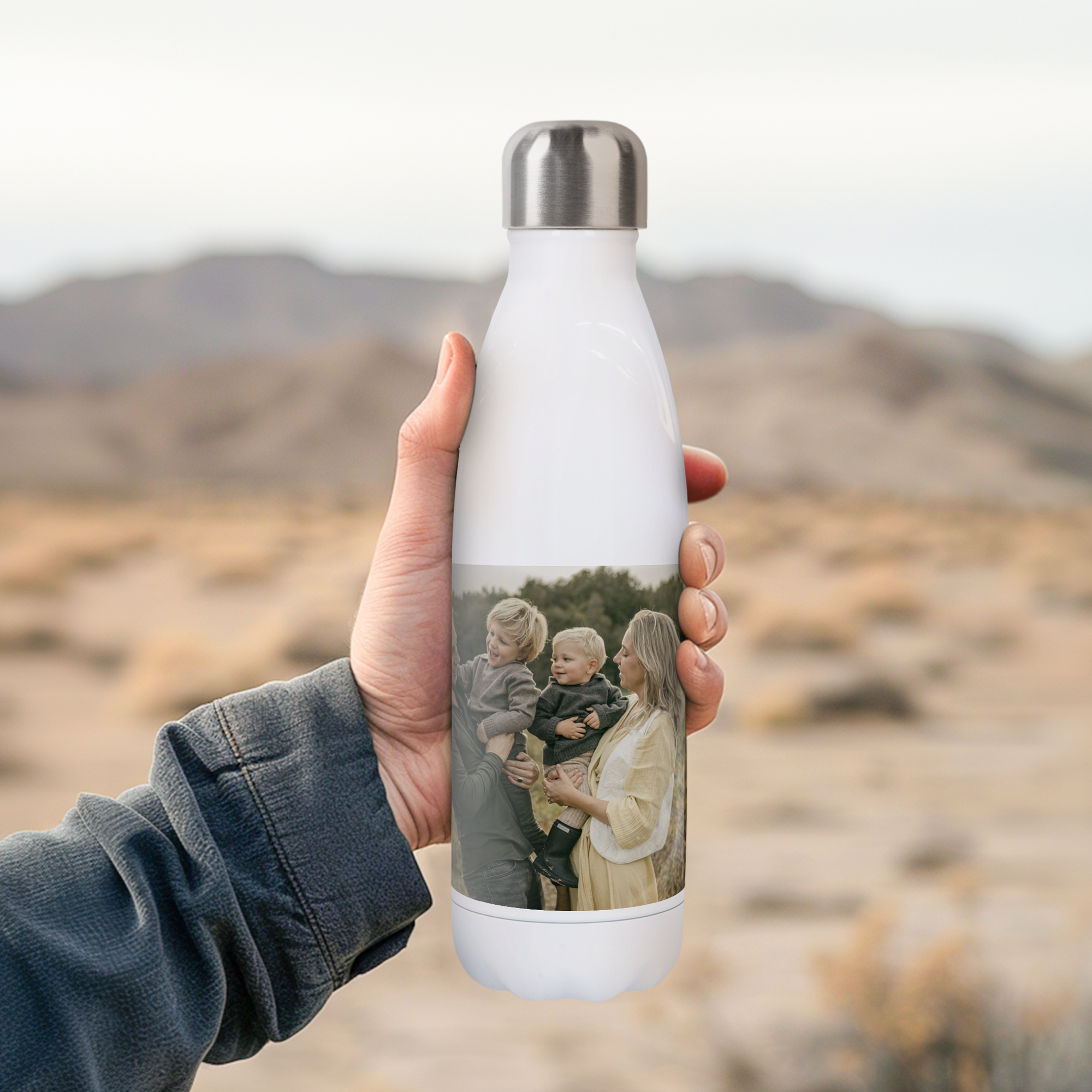 Tenha uma garrafa de água em aço inoxidável personalizada com a foto, texto ou logotipo de sua escolha. Crie a sua agora!