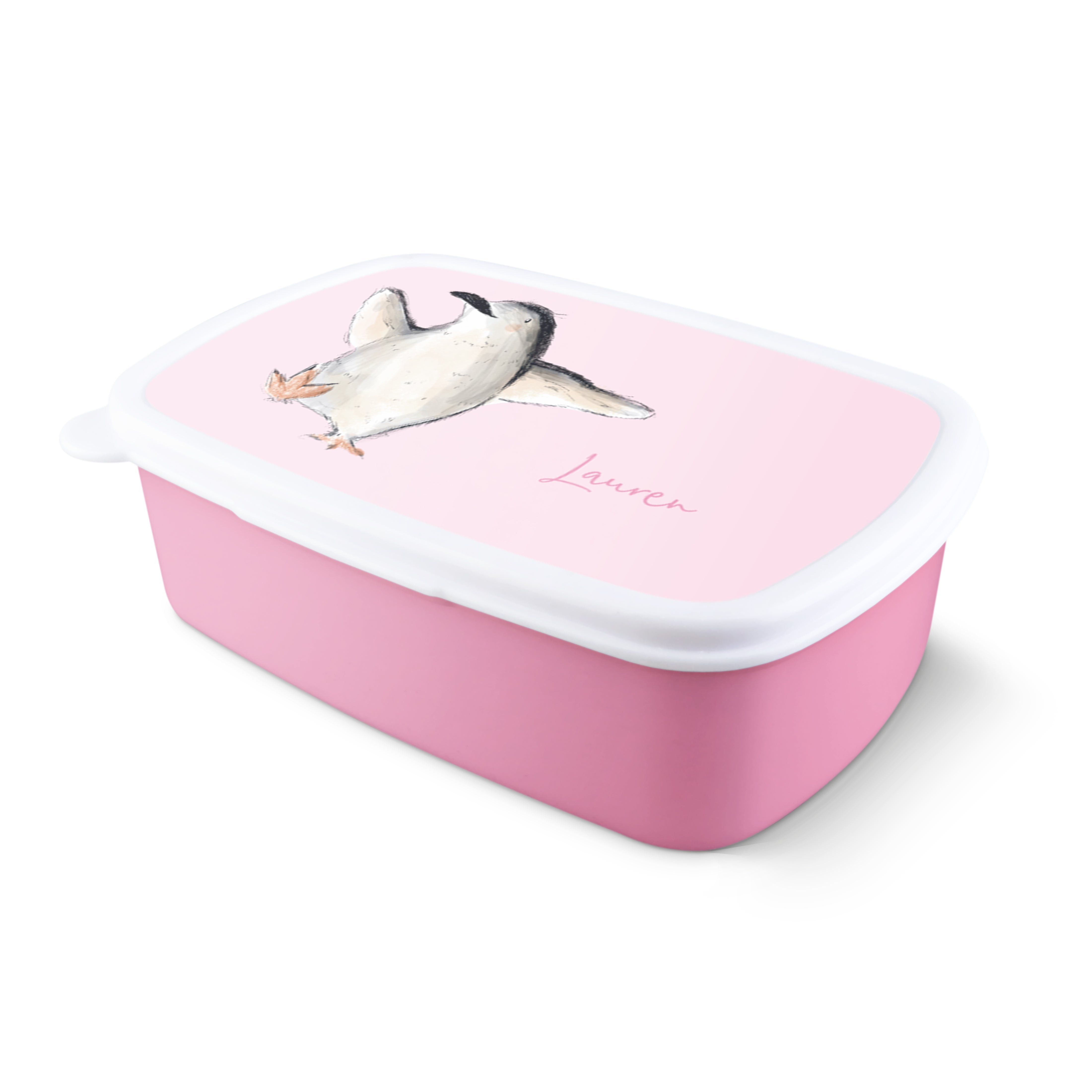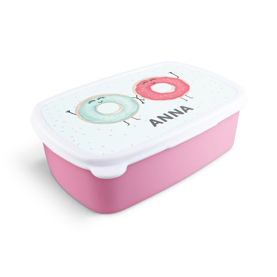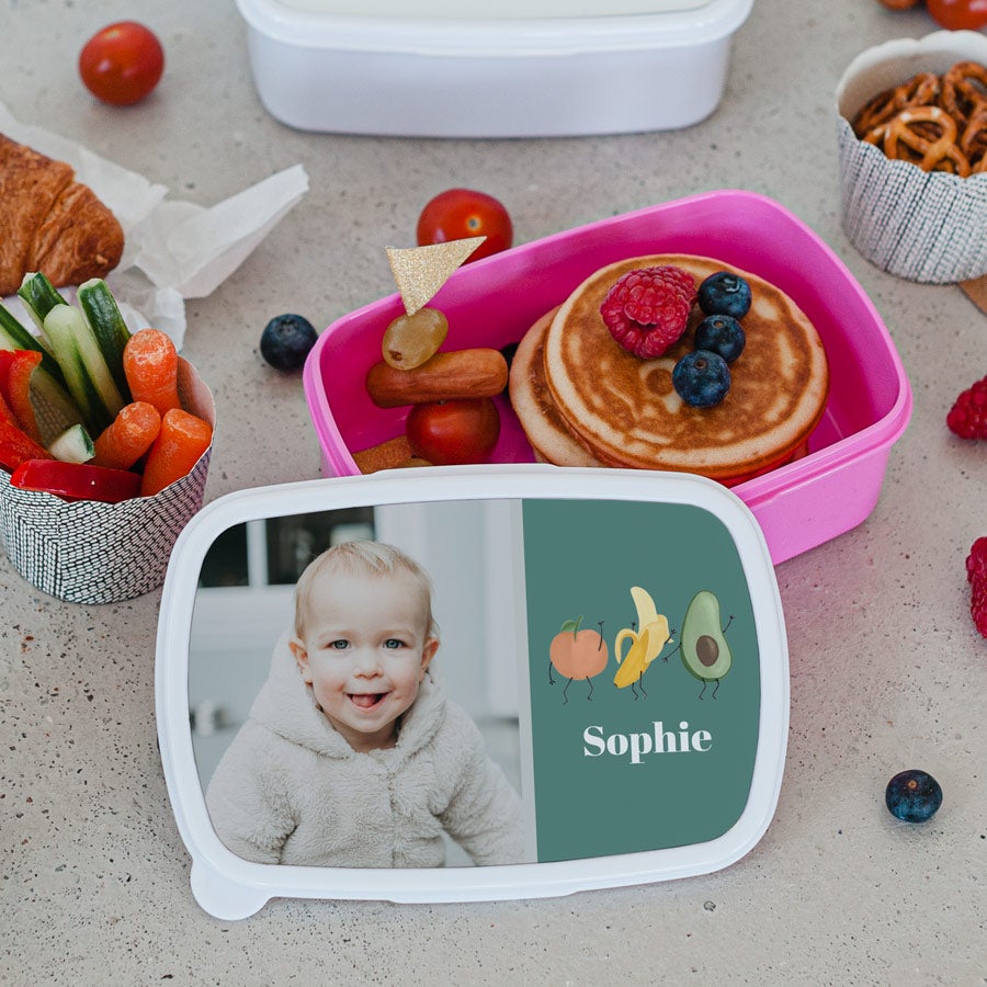 Uma lancheira personalizada com nome, foto ou texto. Disponível em diferentes cores.