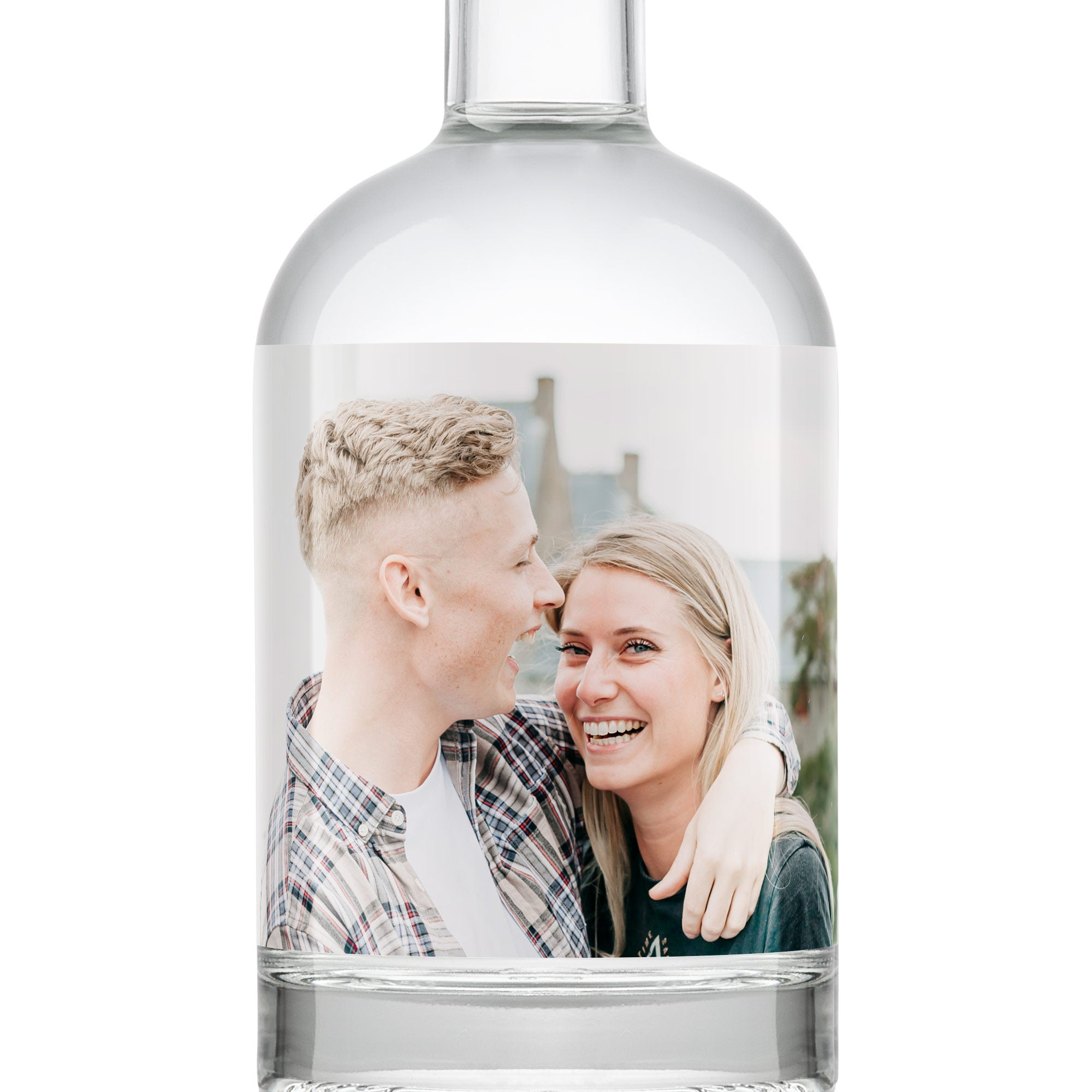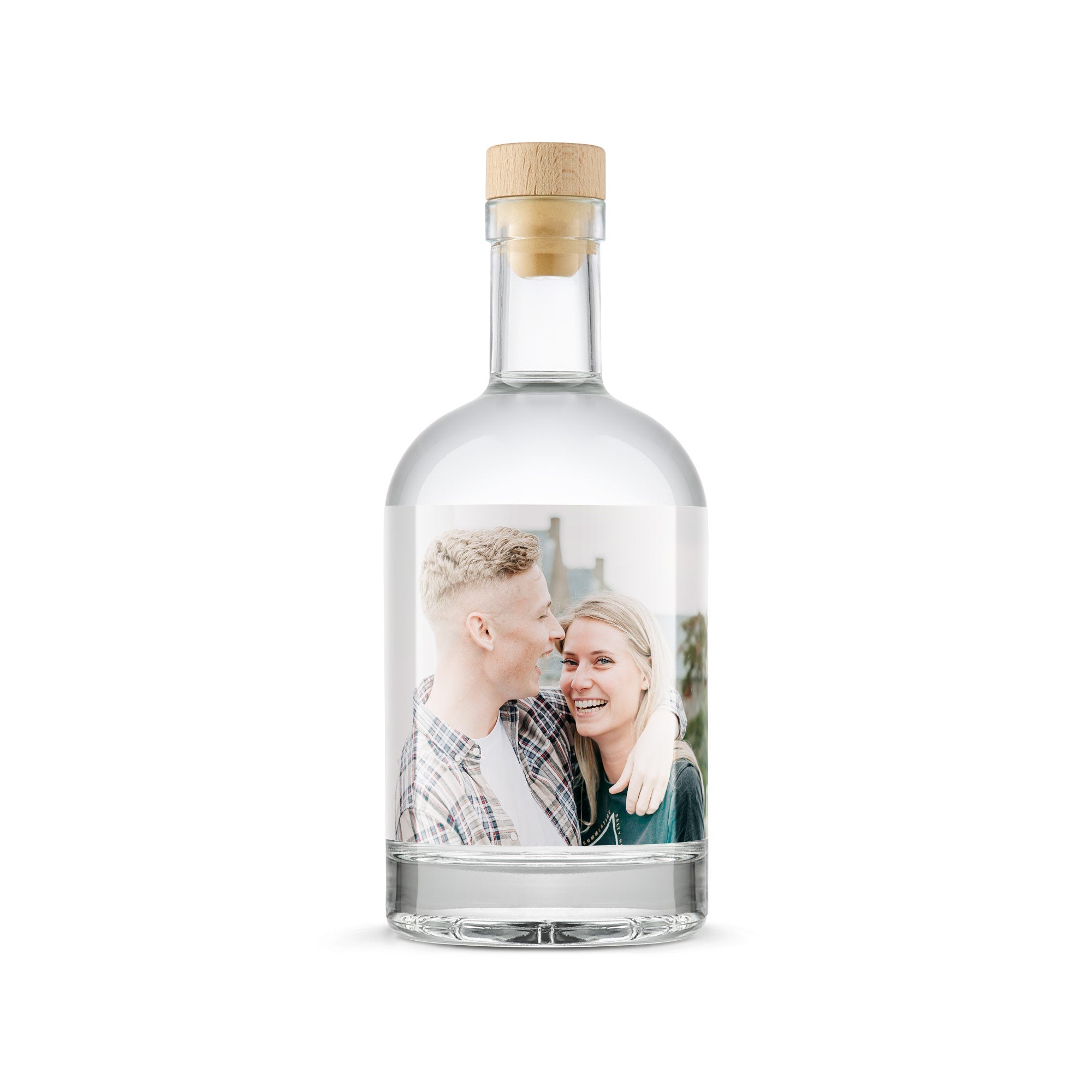Gin da marca própria YourSurprise com rótulo impresso. Seu design pessoal com foto, nome, logotipo ou colagem. Para verdadeiros amantes de gin!