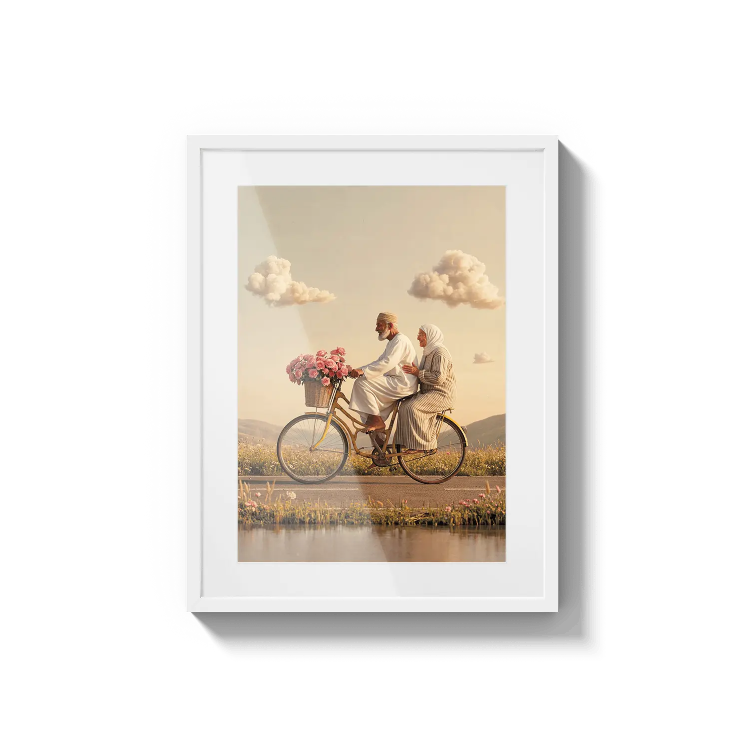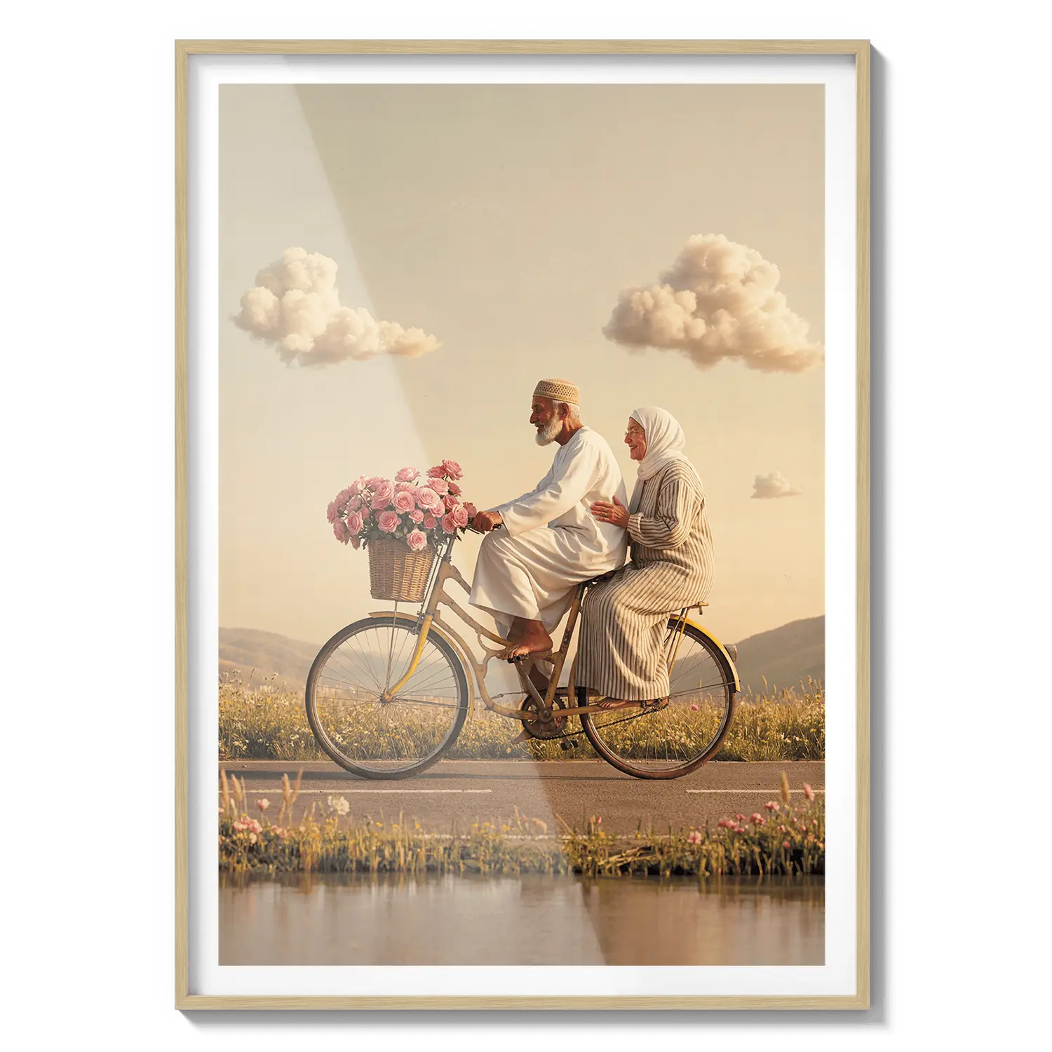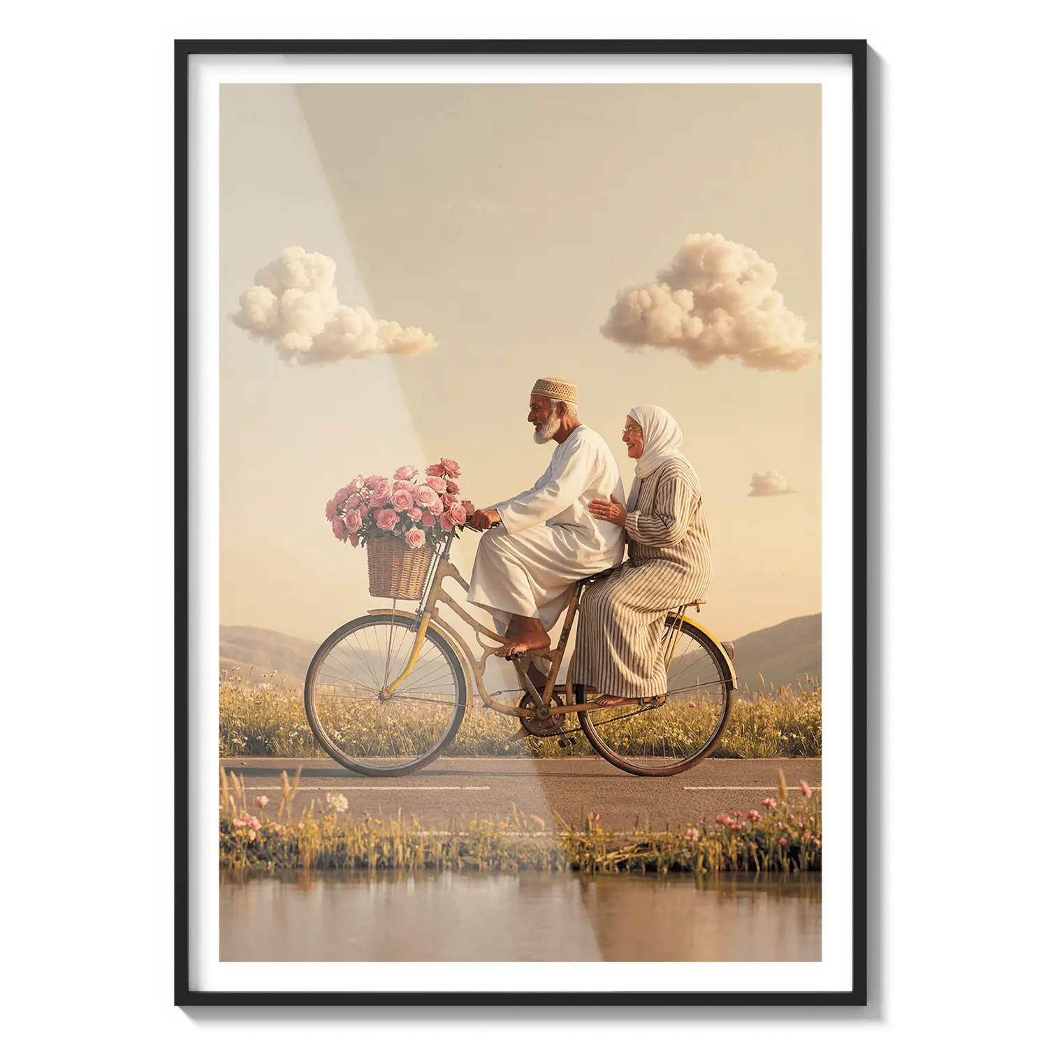 Um casal andando de bicicleta sob uma luz dourada, evocando companheirismo e alegria. Uma doce obra de arte para celebrar momentos compartilhados.
