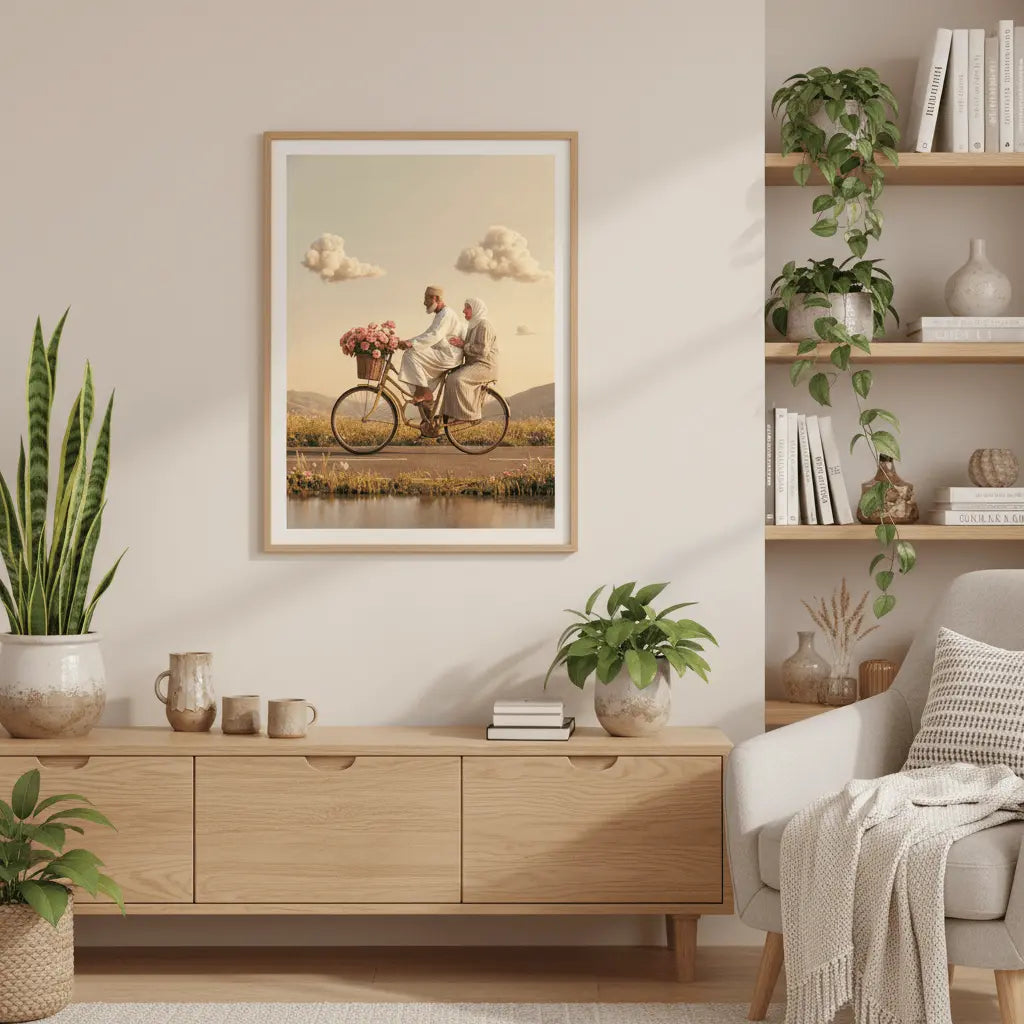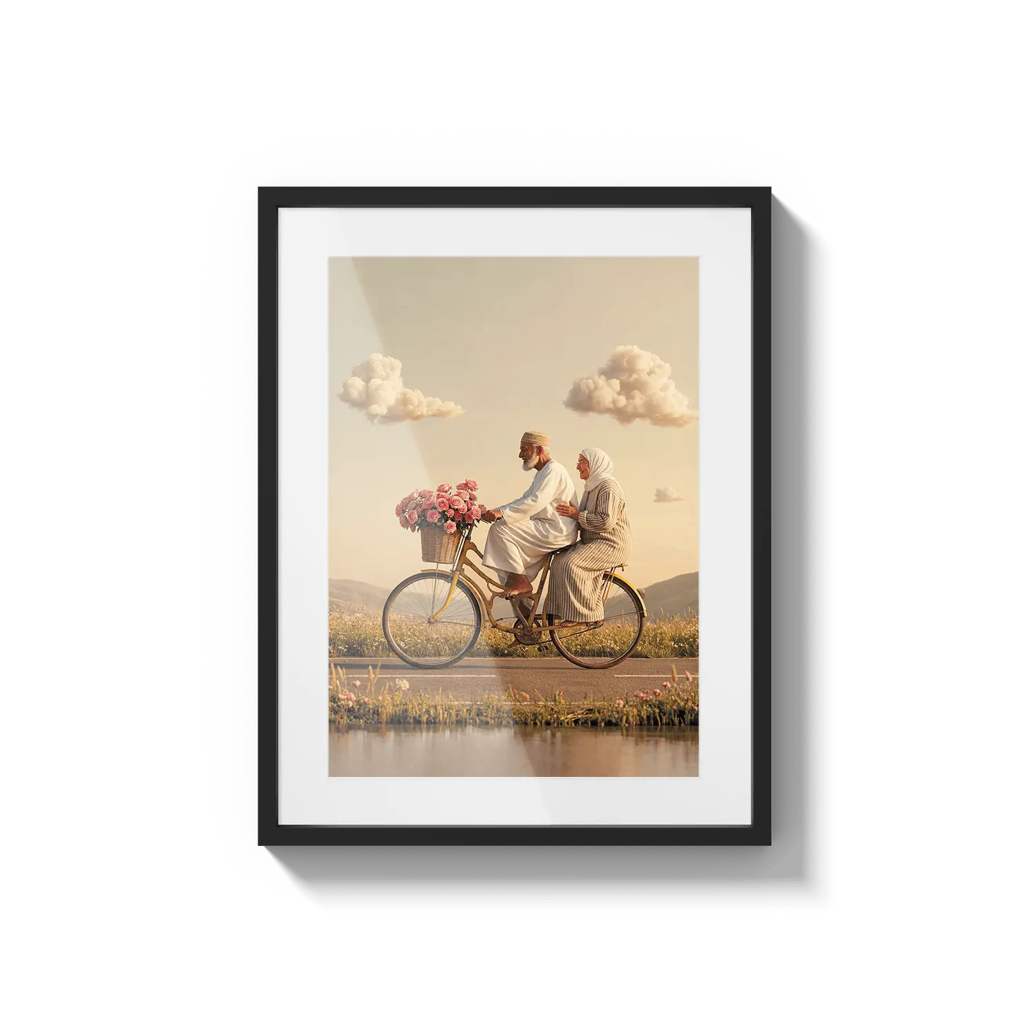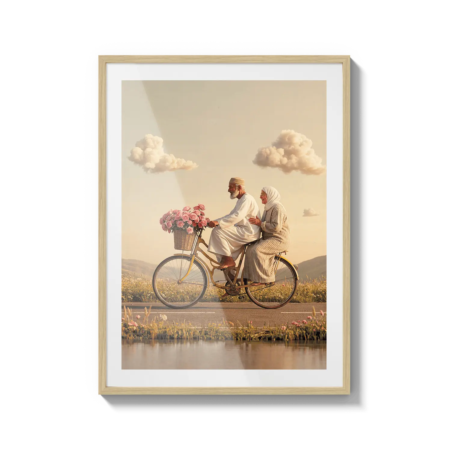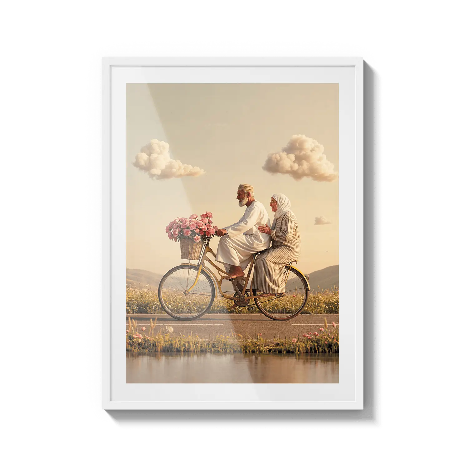 Um casal andando de bicicleta sob uma luz dourada, evocando companheirismo e alegria. Uma doce obra de arte para celebrar momentos compartilhados.