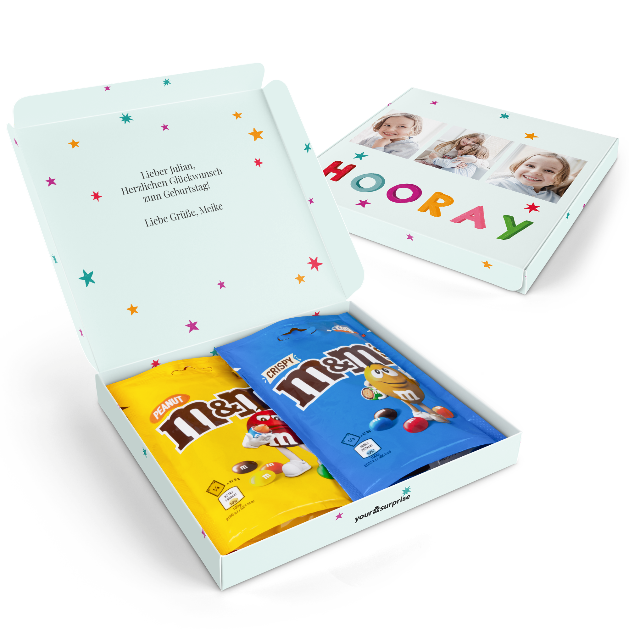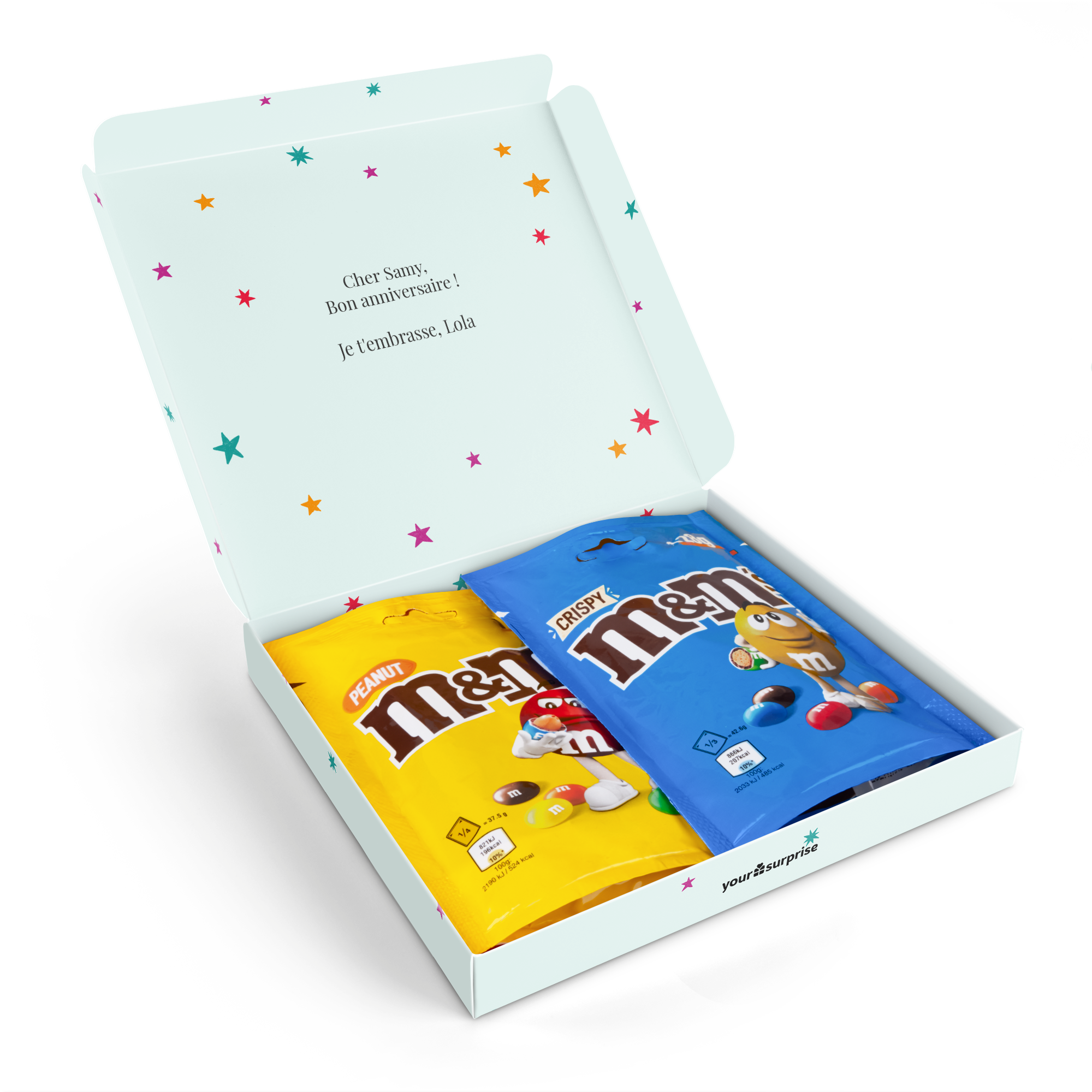Mais informações sobre as sacolas da caixa de presente M&M's:Conteúdo: 2 sacolasSabores: M&M'S Amendoim (125 g) e M&M'S Crocante (107 g)Dimensões: 19,50 x 18 x 2 cmPersonalização: com nome, foto ou logotipo e mensagemImpressão: clara e em cores vivasIngredientes do M&M'S Chocolate Crocante 107 g: açúcar, massa de cacau, farinha de arroz (9,3%), LEITE EM PÓ, manteiga de cacau, gordura de palmiste, LACTOSE, gordura de palma, amido, gordura do leite (do LEITE), xarope de glicose, EXTRATO DE MALTE DE CEVADA, manteiga de karité, estabilizante (goma arábica), sal, emulsificante (LECITINA DE SOJA), dextrina, dextrose, corantes (E100, E120, E133, E160a, E160e, E170), agente de brilho (cera de carnaúba), aromatizantes, óleo de palmiste.Informações sobre alergias: contém cevada, cereais que contêm glúten, lactose, leite e soja. Pode conter traços de amendoim, avelã e amêndoa.Ingredientes do M&M'S Chocolate Amendoim 125 g: açúcar, AMENDOINS, massa de cacau, LEITE EM PÓ INTEGRAL, manteiga de cacau, amido, gordura de palma, xarope de glicose, LEITE EM PÓ DESNATADO, emulsificante (LECITINA DE SOJA), LACTOSE, estabilizante (goma arábica), manteiga de karité, gordura do leite (do LEITE), dextrina, corantes (E100, E120, E133, E160a, E160e, E170), agente de cobertura (cera de carnaúba), óleo de palmiste, aromatizantes, sal.Informações sobre alergias: contém lactose, leite, amendoim e soja. Pode conter traços de avelã e amêndoa.Informações úteis: Em temperaturas acima de 25 graus, infelizmente não podemos garantir que você receberá seu presente de chocolate em perfeitas condições. Dúvidas? Por razões técnicas, não é possível processar caracteres cirílicos, turcos ou especiais.