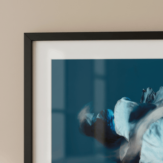 Uma figura floral azul rodopiante inspirada em movimento e frescor. Um gesto vibrante e edificante.