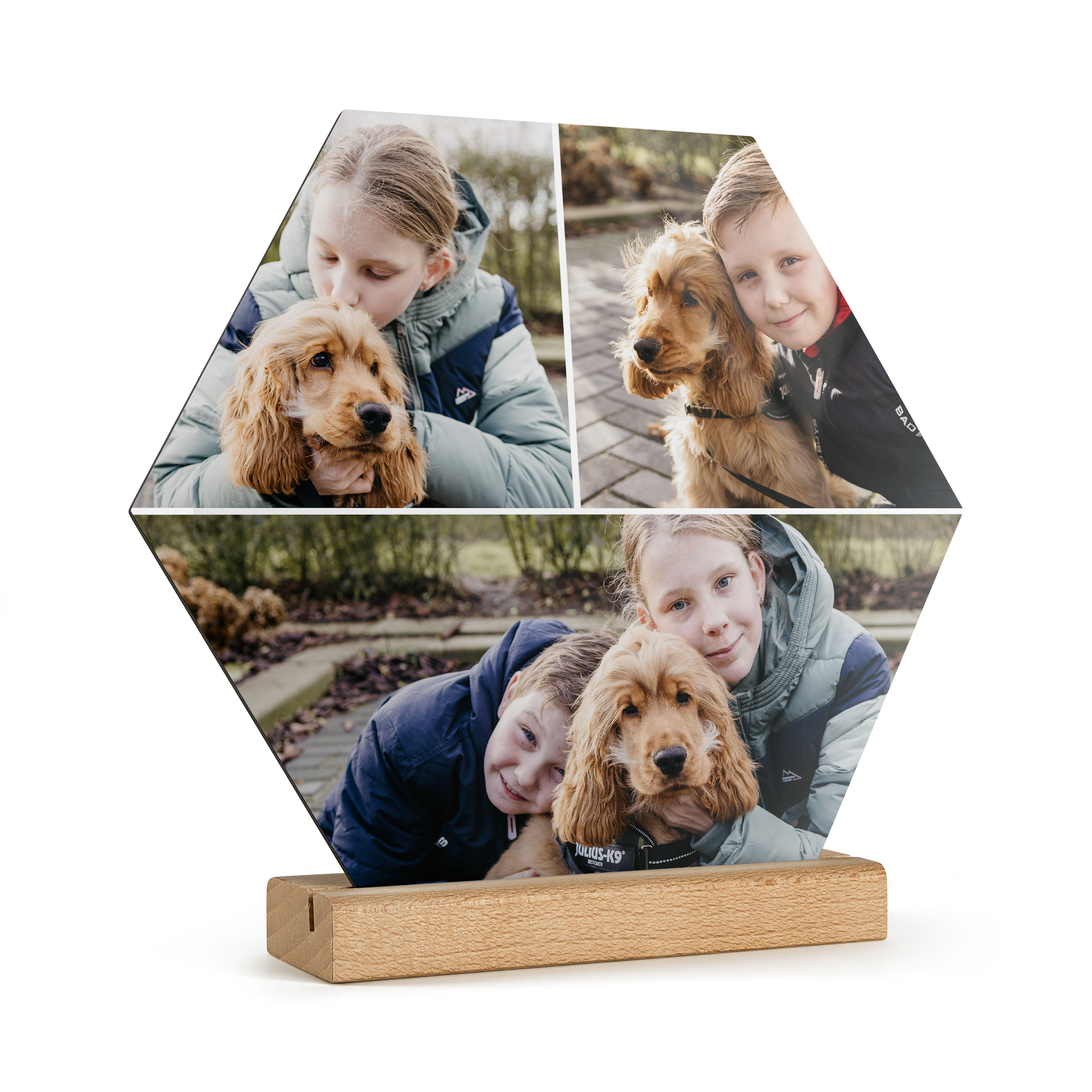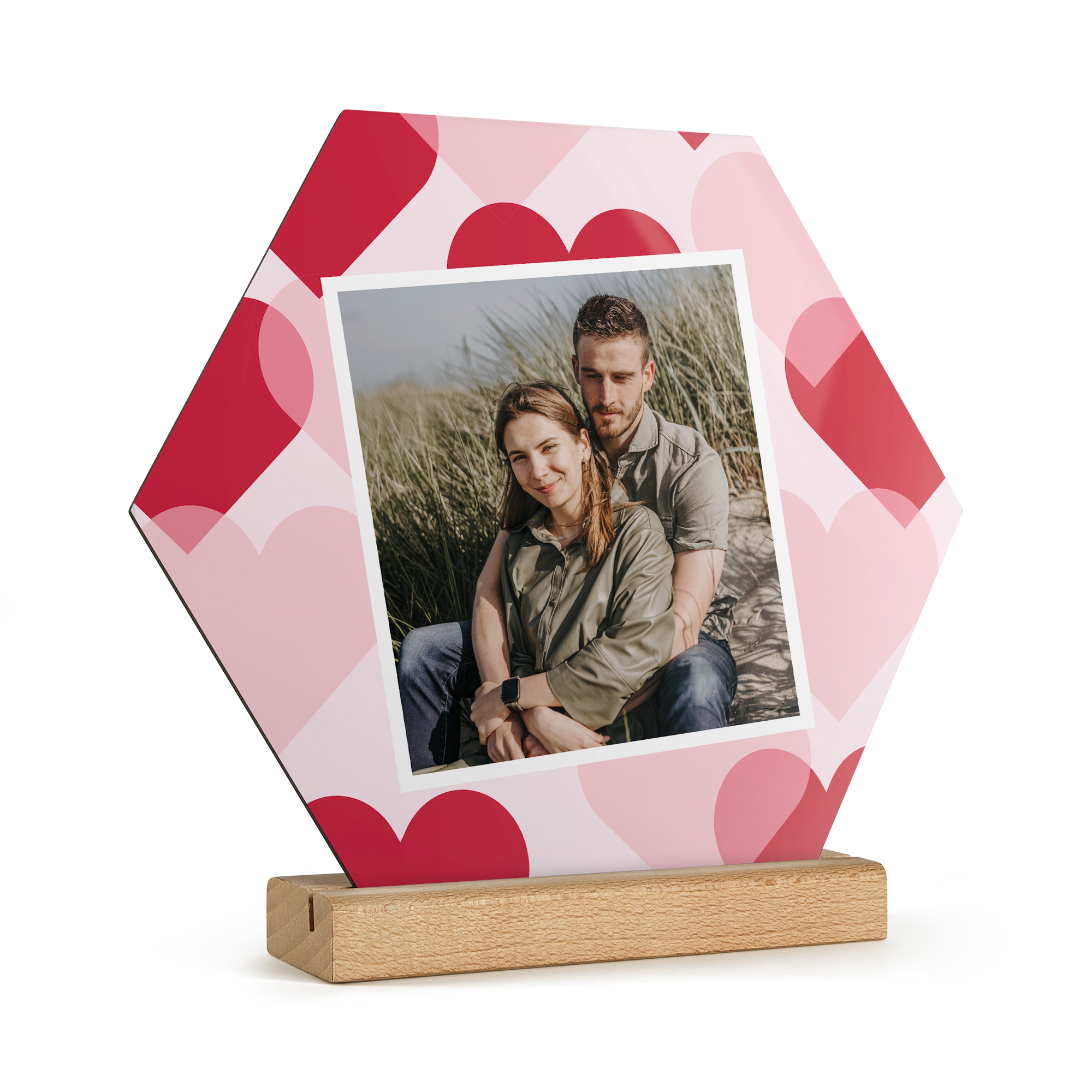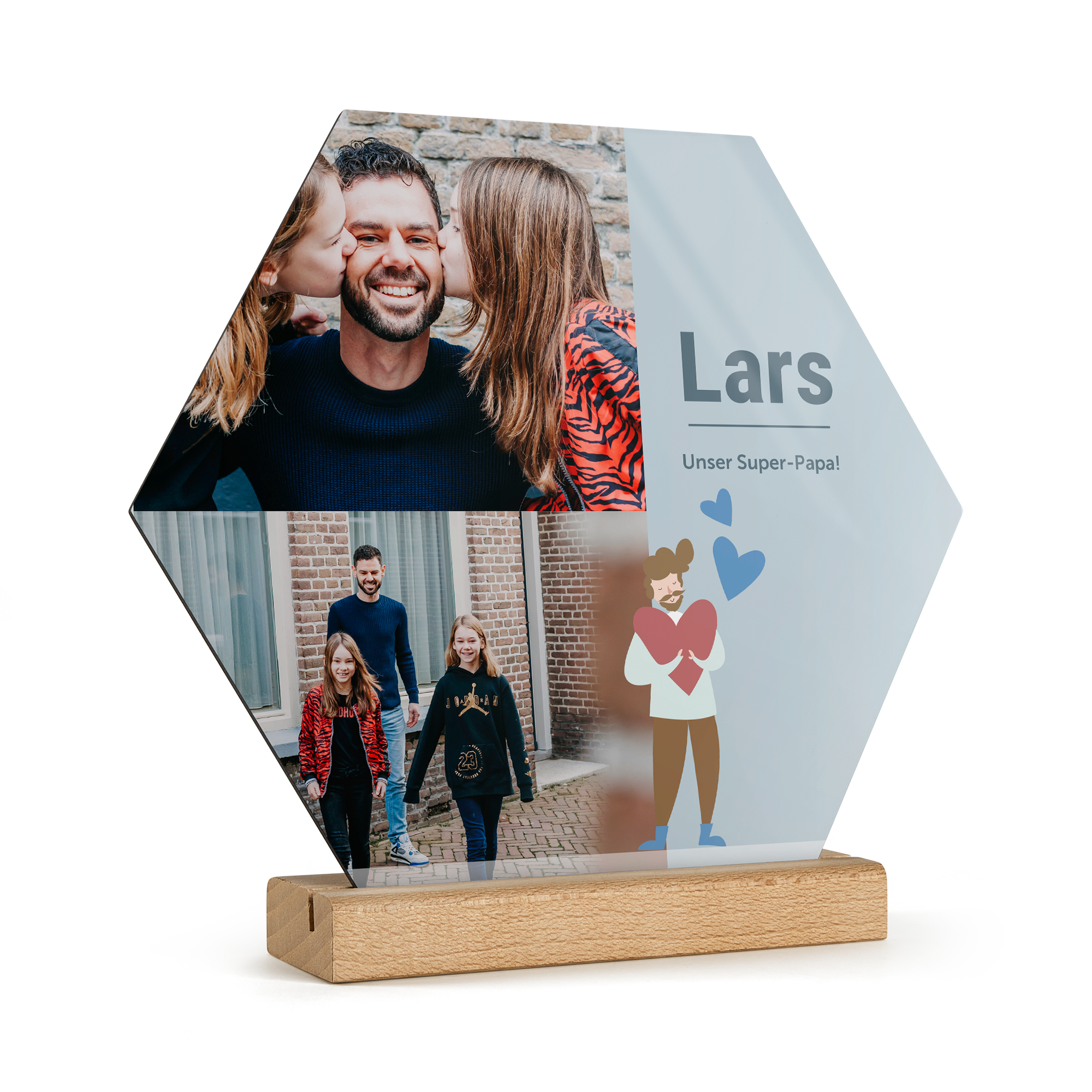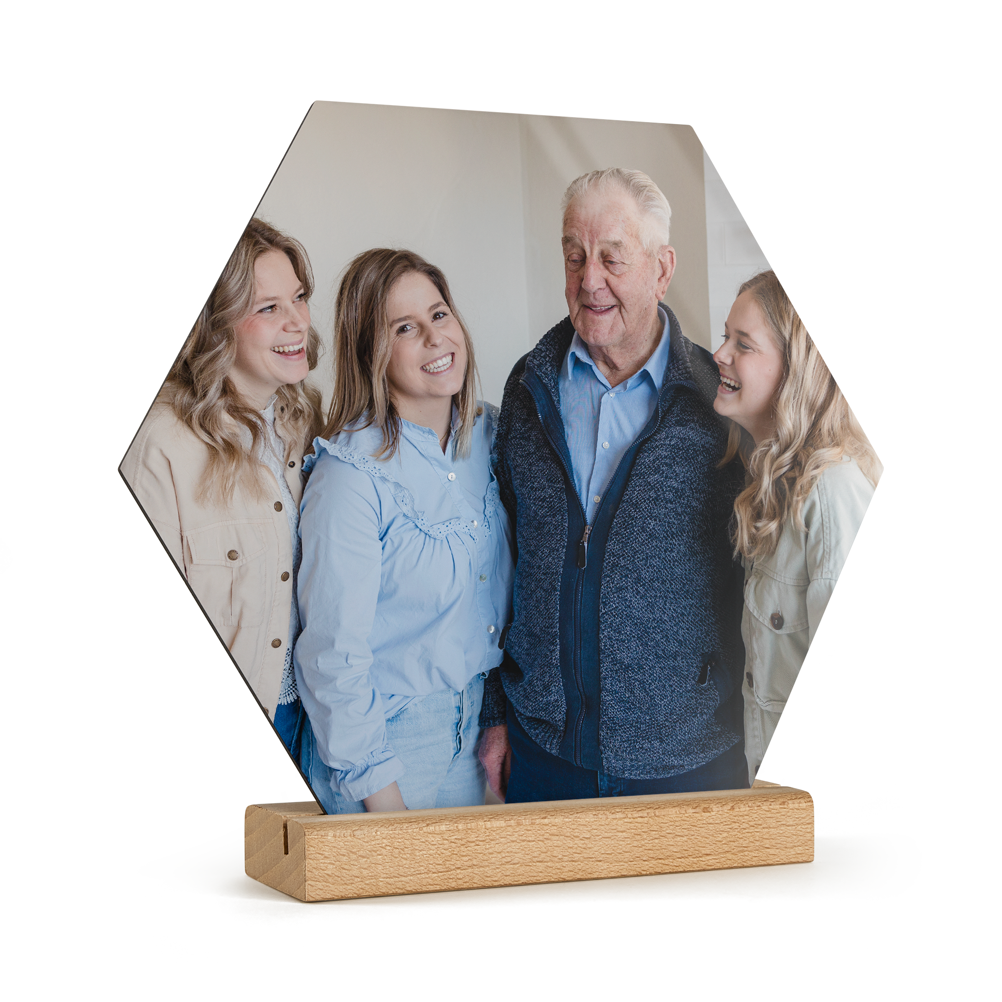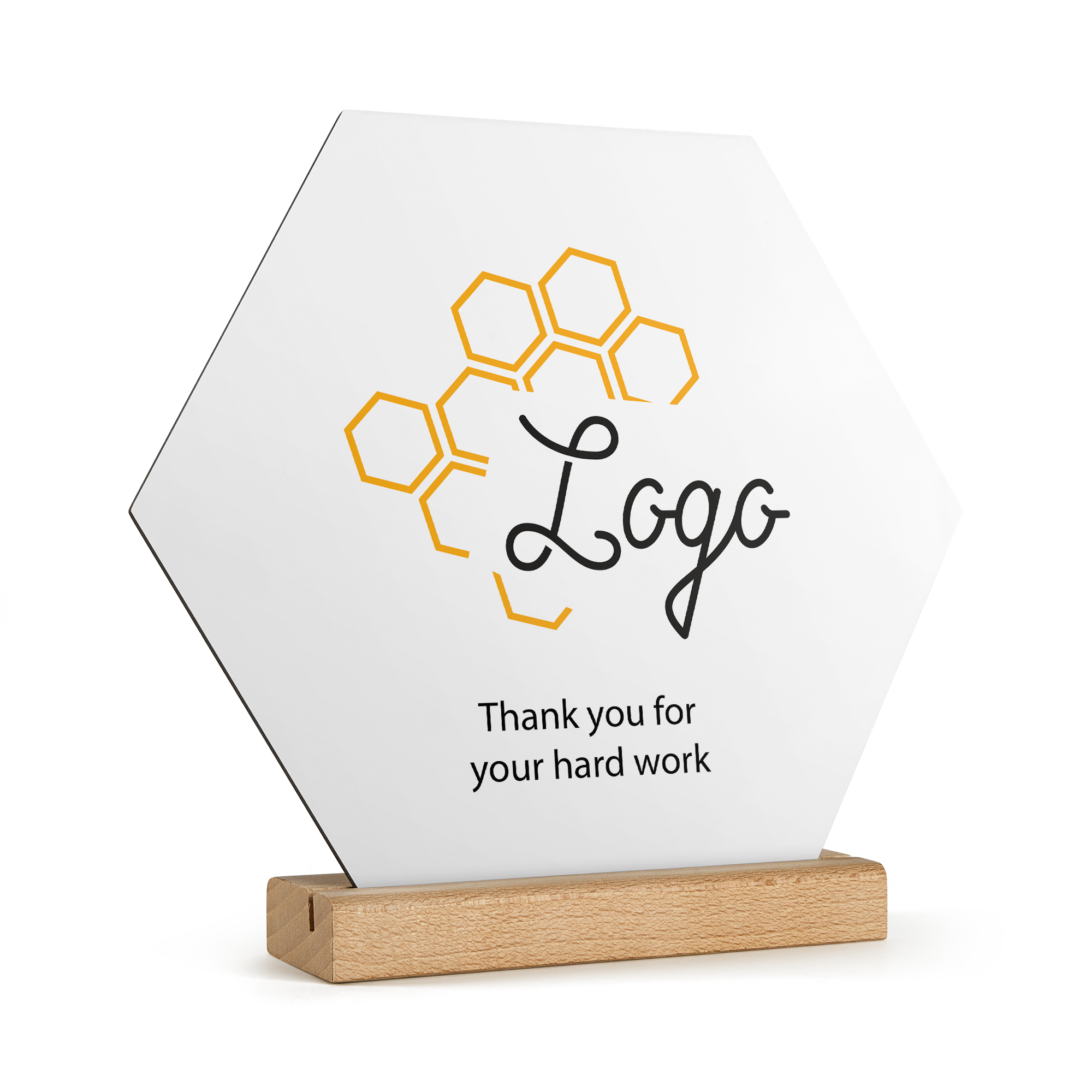 Mais informações sobre o painel de madeira:Forma: hexágonoMaterial: Madeira compensada de alta qualidadeAcabamento: Revestimento brilhanteDimensões do painel: 23 x 20 x 20 x 0,3 cmDimensões do suporte: 15 x 5 x 2 x 2 cmPersonalização: com foto, texto e/ou logoImpressão: em cores claras e nítidas