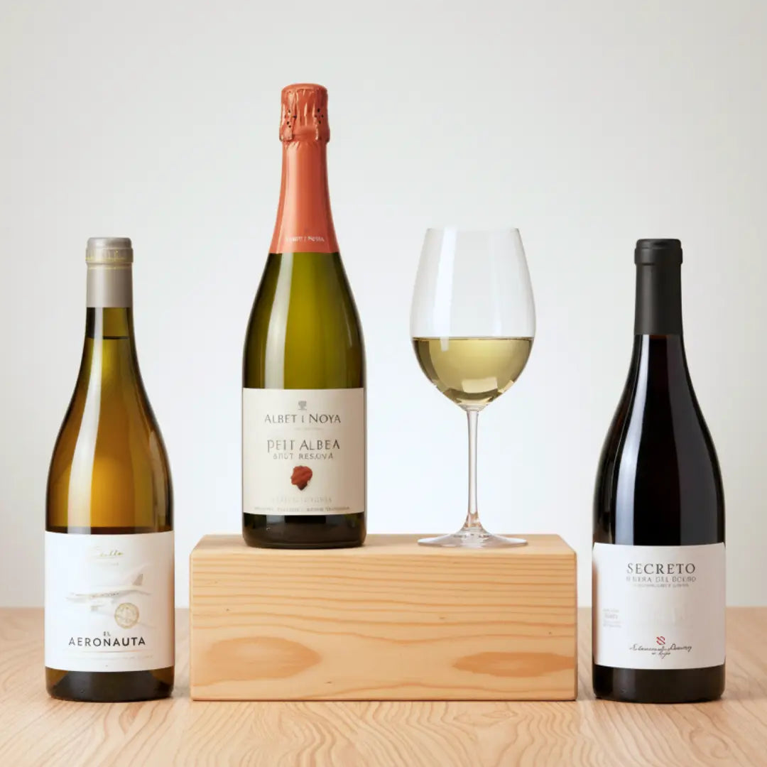 Coleção de Vinhos Selecionados, apresentando um espumante Cava Brut Reserva, um elegante vinho branco e um rico vinho tinto, cada um selecionado por sua qualidade e caráter excepcionais.