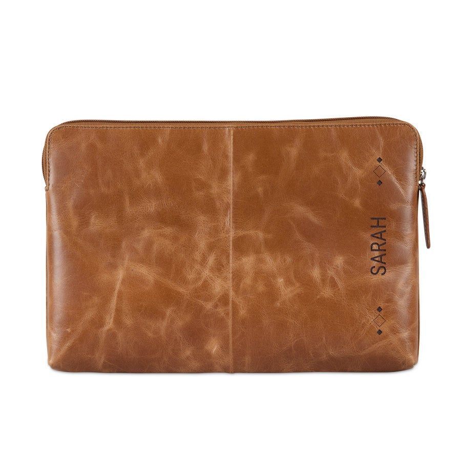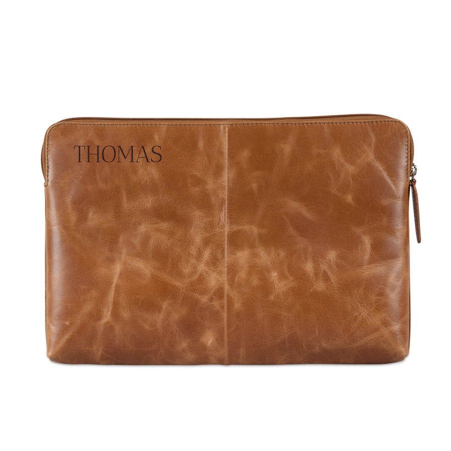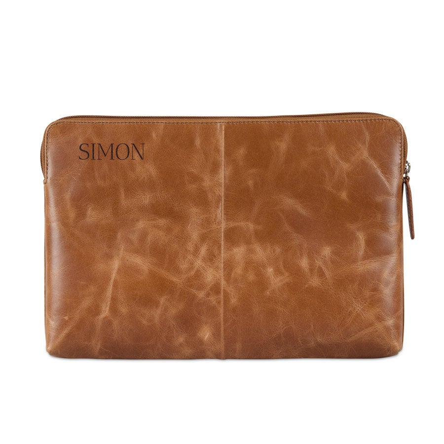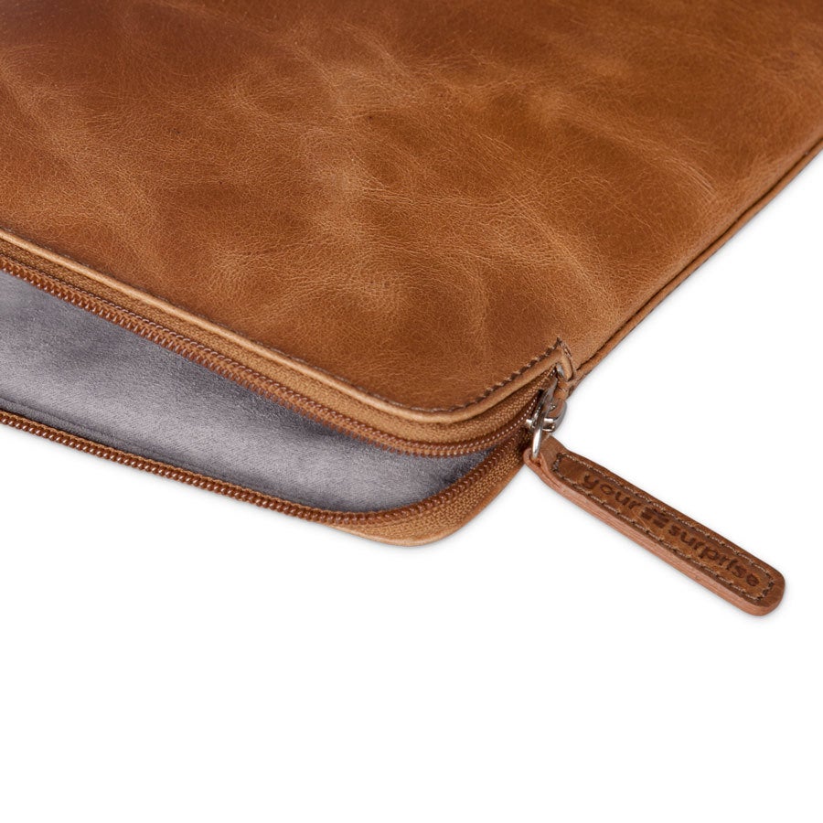 Mais informações sobre a capa de couro para laptop com gravação:Tipo: Capa de 11 polegadas Dimensões da capa: 32 x 22 cm Dimensões máximas do laptop: 30 x 20 cmMaterial: Couro de búfalo de grão integral curtido vegetal Acabamento: Com um forro macio para proteção extra Cor: marrom (brandy) Acabamento: gravação a laser de alta qualidade Personalização: Com um nome e/ou texto Extra: O couro é um produto natural. Isso significa que seu presente pode diferir ligeiramente da foto de exemplo.