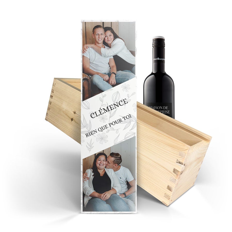 Delicioso vinho Maison de la Surprise em uma elegante caixa de madeira, apresentando a foto, logo e/ou texto de sua escolha. Crie o seu agora!