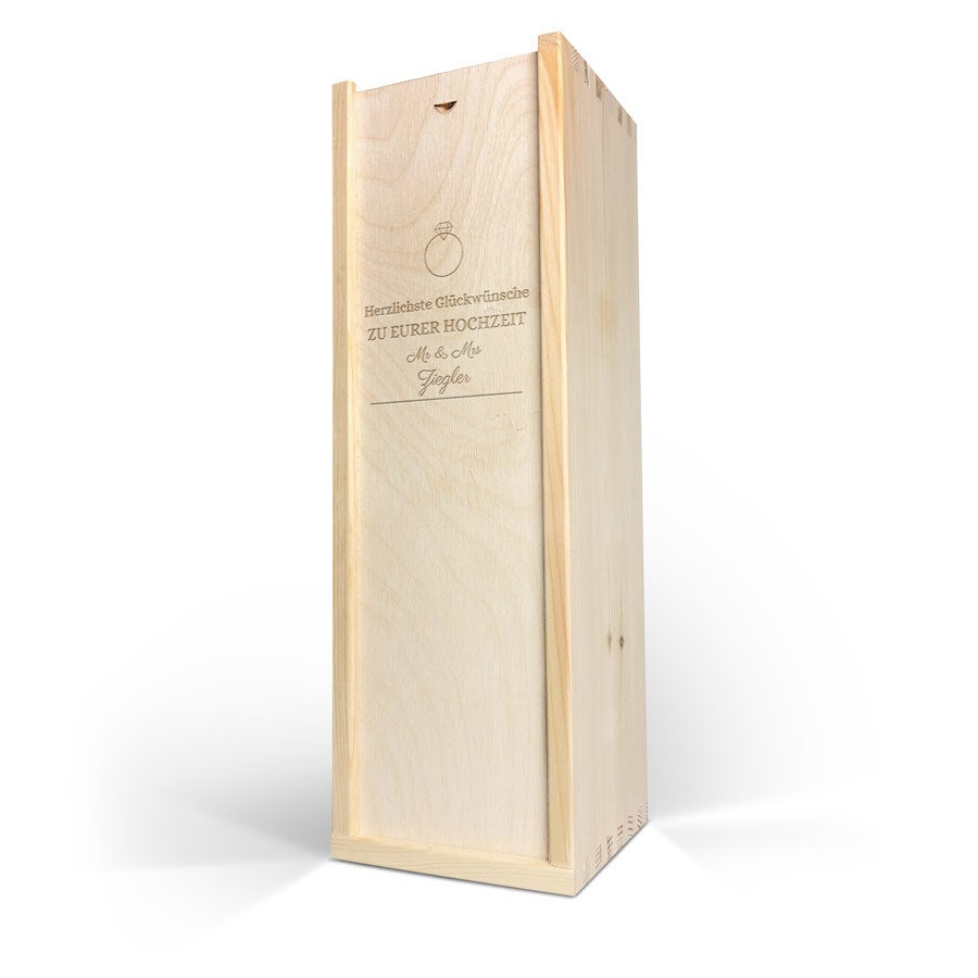 Vinho delicioso Maison de la Surprise em uma luxuosa caixa de madeira, com o nome e/ou texto de sua escolha. Crie a sua agora!