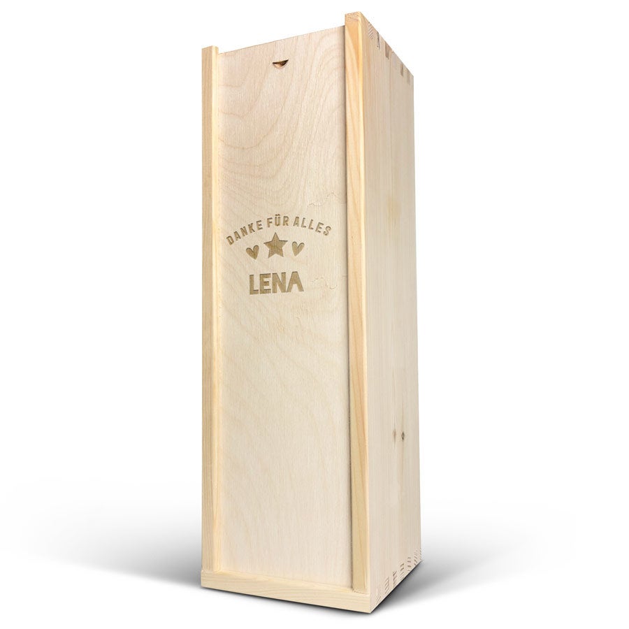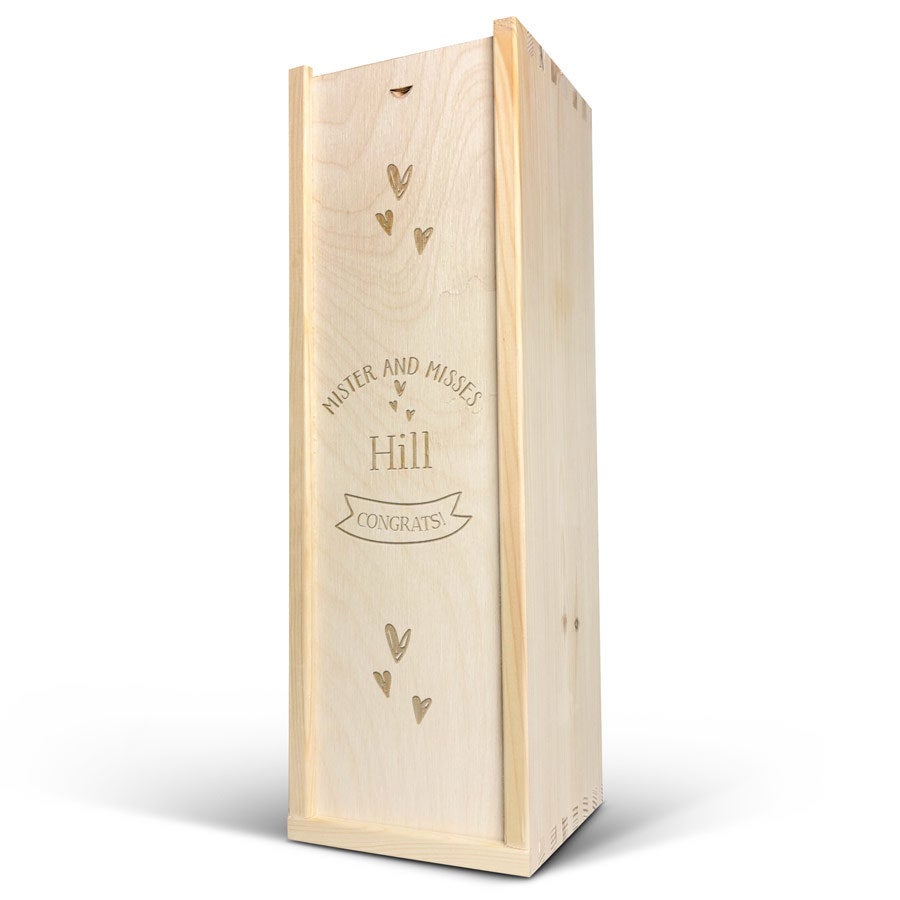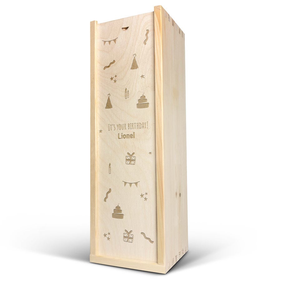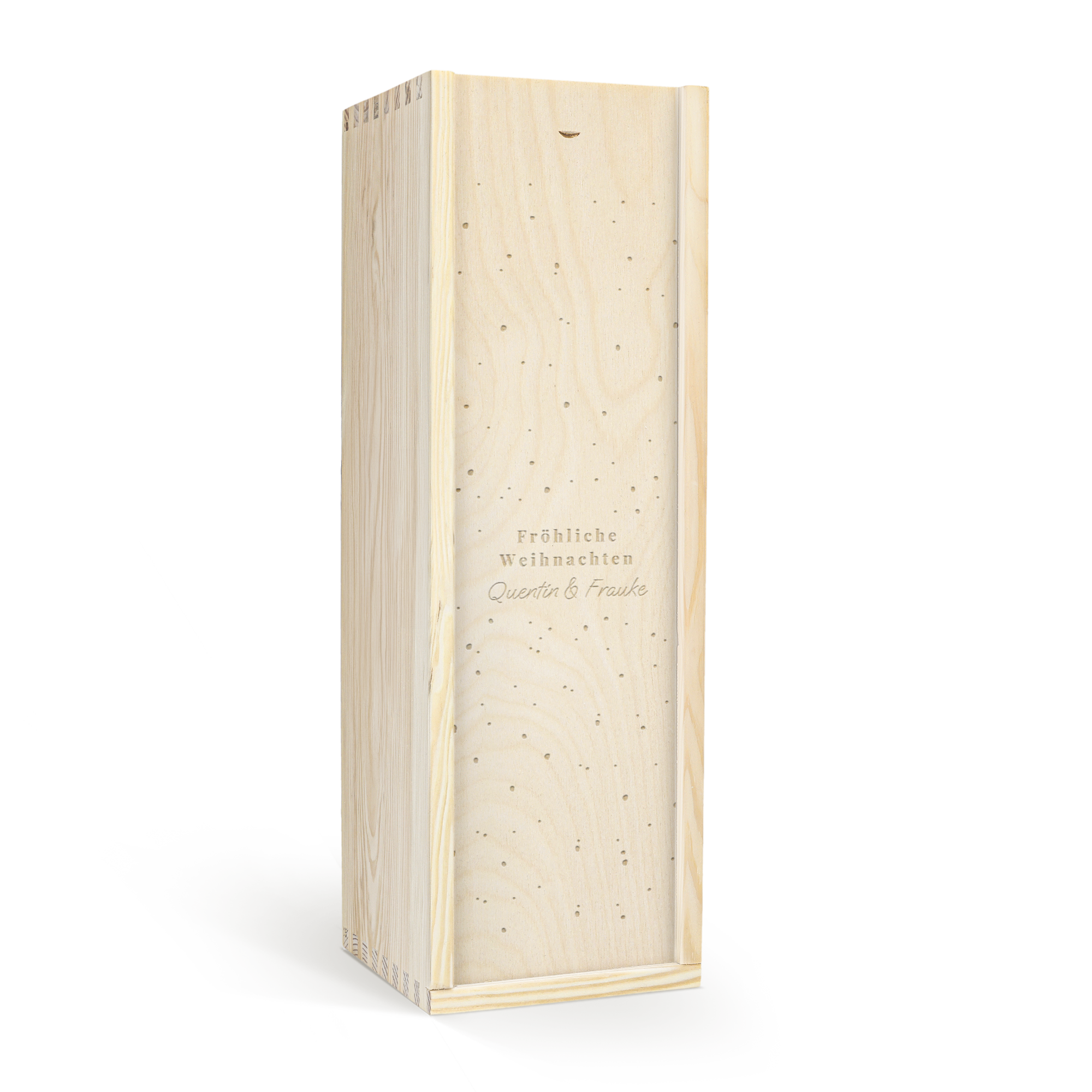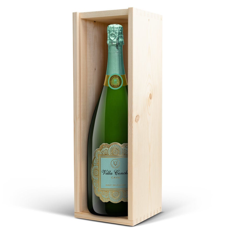 Uma deliciosa garrafa de cava Villa Conchi em uma caixa de presente de madeira com o seu design. Perfeita para fotos e em cores vibrantes!