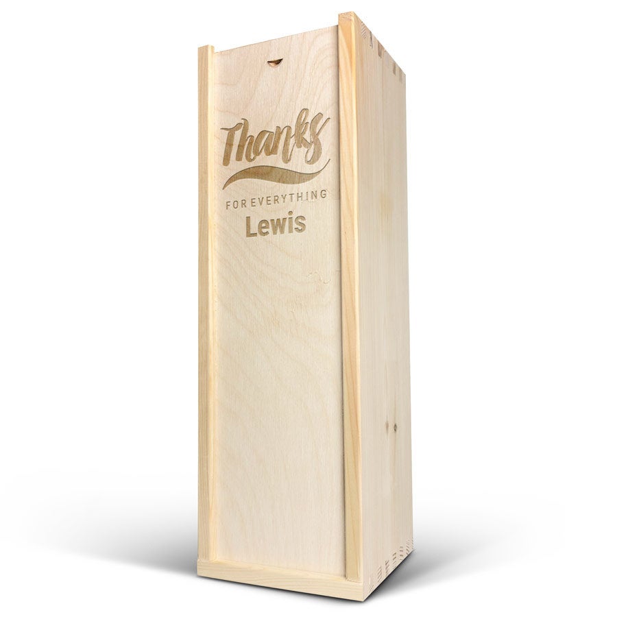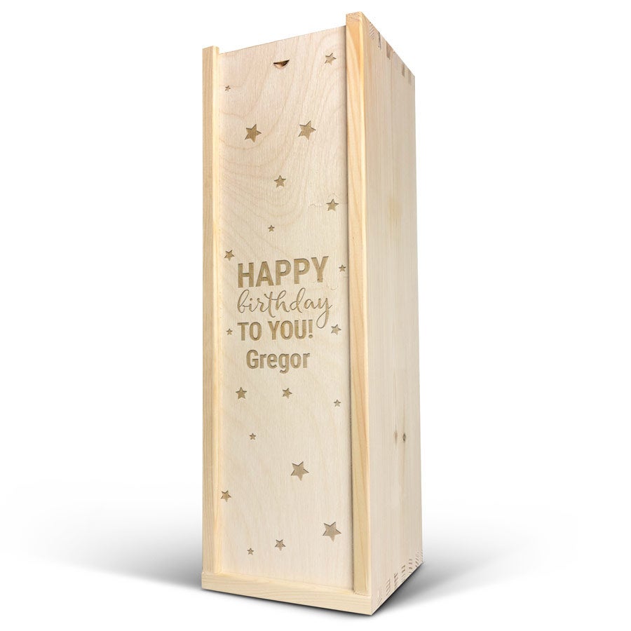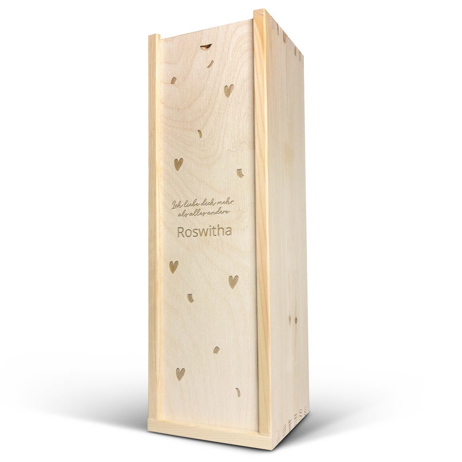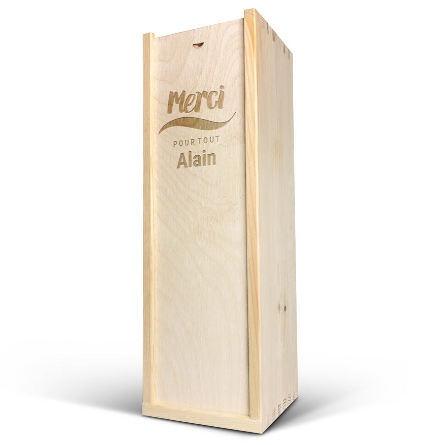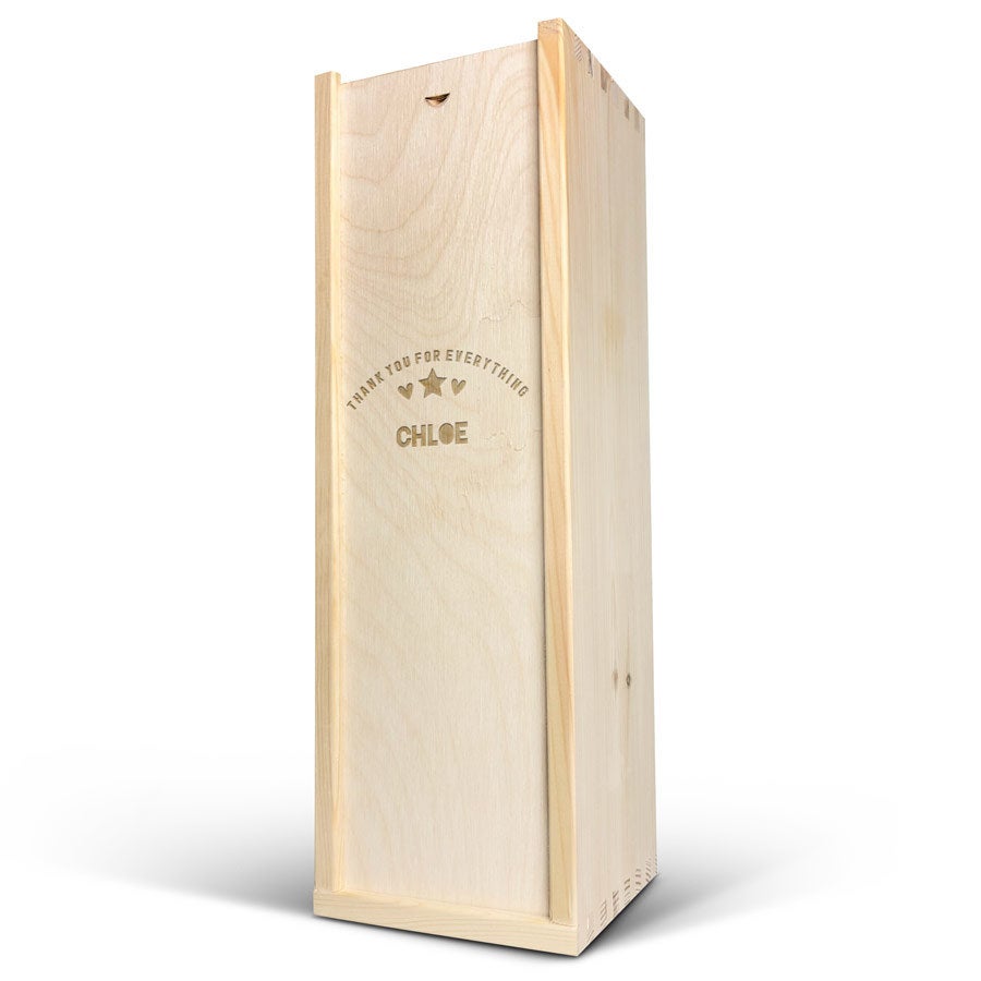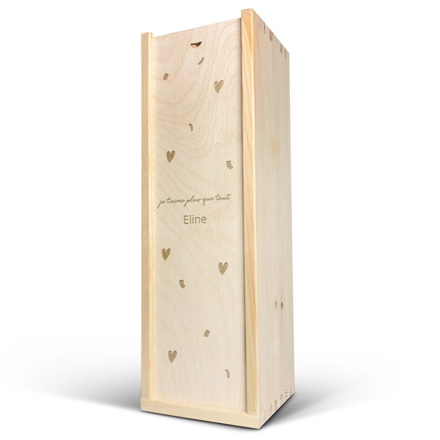 Uma deliciosa garrafa de cava Villa Conchi em uma caixa de presente de madeira com o seu design. Perfeita para fotos e em cores vibrantes!