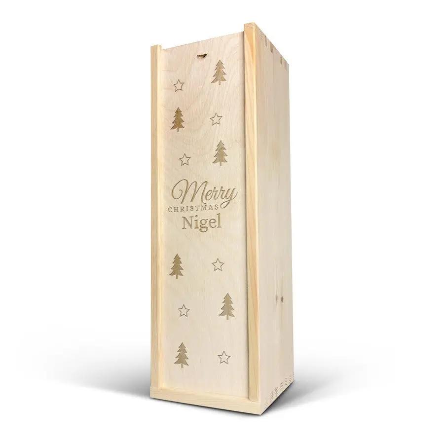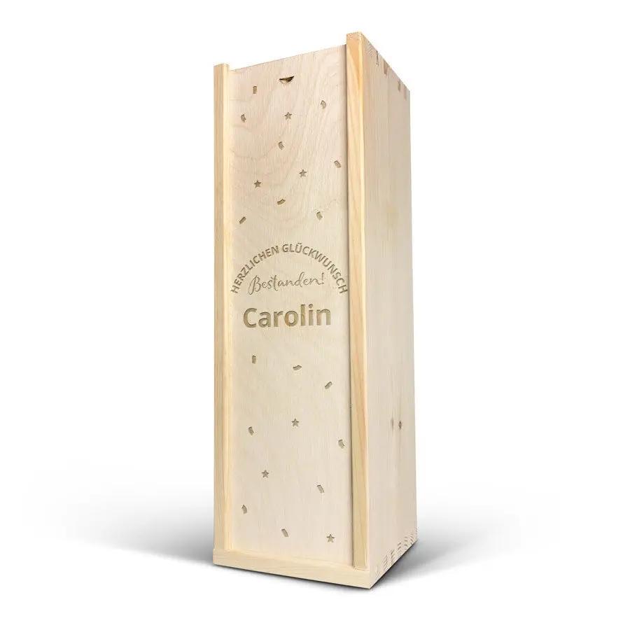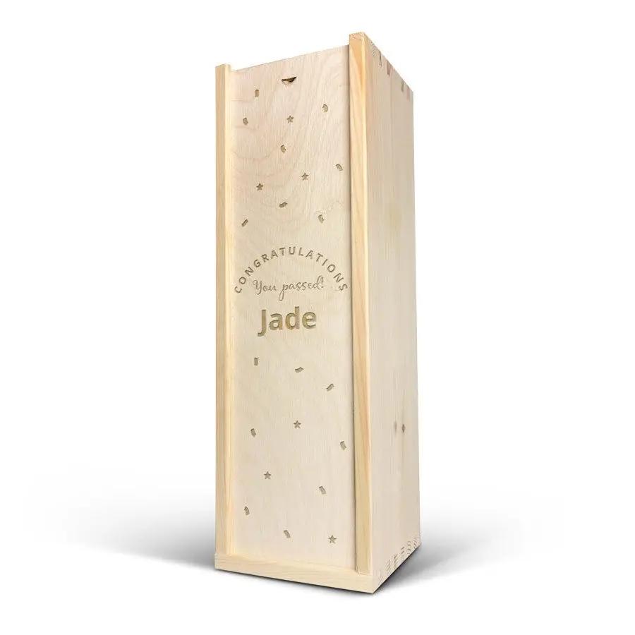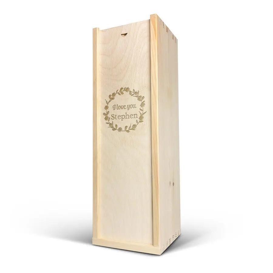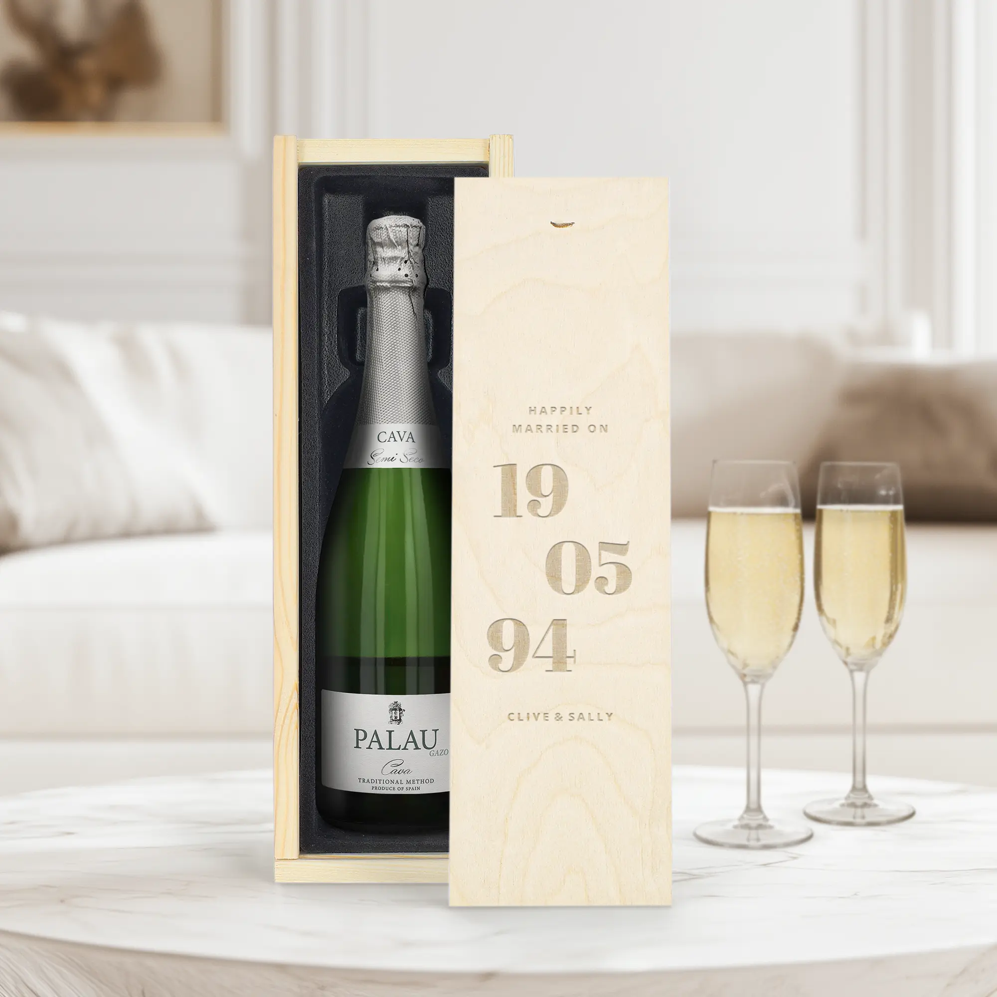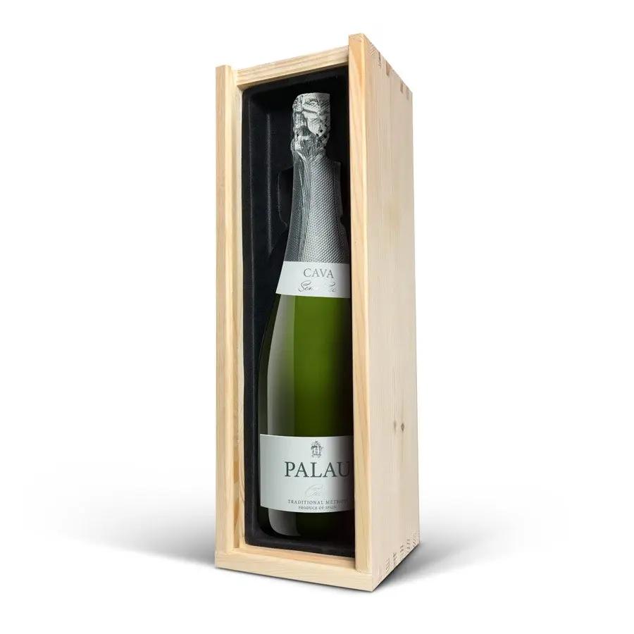 Uma deliciosa garrafa de cava Palau Semi-Seco em uma luxuosa caixa de madeira gravada com seu nome e/ou texto. Um presente original!