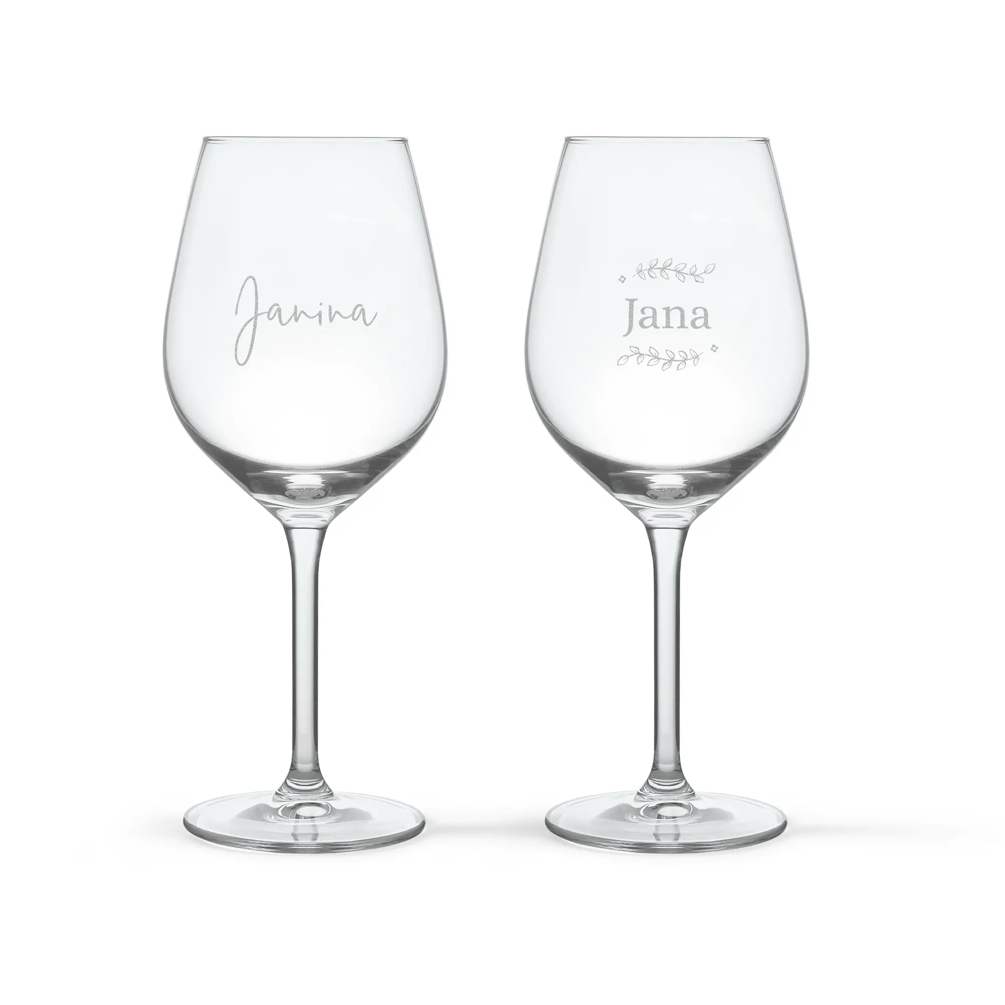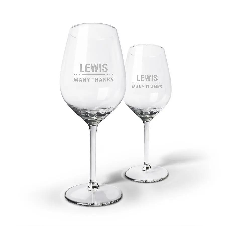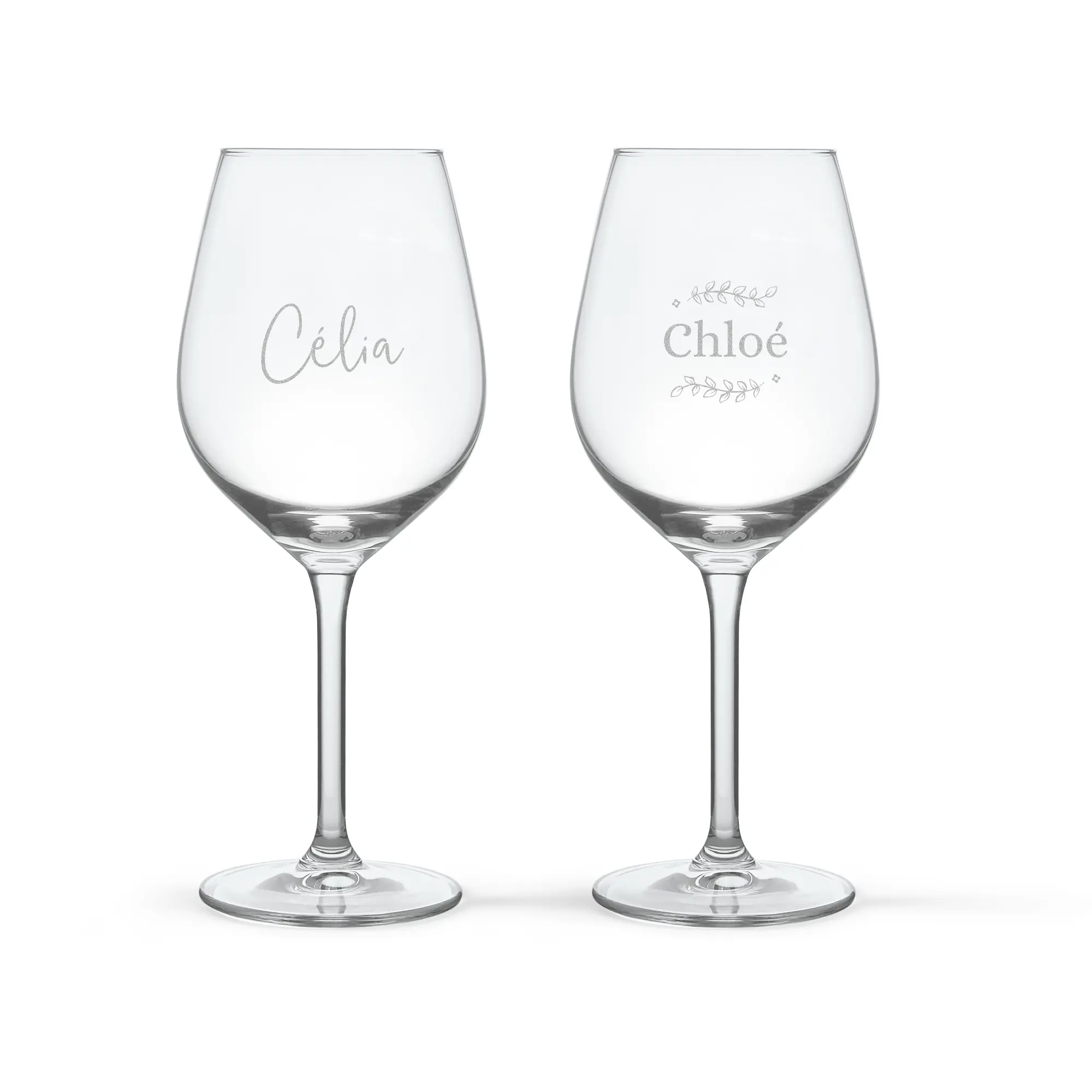 Vinho delicioso Maison de la Surprise em uma caixa de madeira deluxe, com 2 taças de vinho gravadas com o nome e/ou texto de sua escolha.