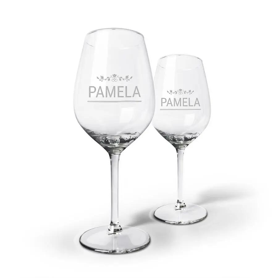 Mais informações sobre as taças de vinho:Quantidade: 2Marca: Royal LeerdamDimensões: 20,5 x 8,5 x 8,5 cmAltura: 20,5 cmCapacidade: 370 mlPersonalização: com nome e/ou textoMétodo de personalização: gravação a laser de alta qualidadeLocalização da personalização: em um lado de cada taçaMais informações sobre a caixa de madeira deluxe:Dimensões da caixa: 36,5 x 30,6 x 11 cmDimensões da tampa: 35,6 x 28,4 x 0,3 cmInformações adicionais: A caixa de madeira é feita de madeira certificada pelo FSCMais informações sobre o vinho:Marca: Maison de la SurpriseConteúdo: 750 mlPaís de origem: FrançaTipo: tintoUva: MerlotCaracterísticas: O Merlot Maison de la Surprise possui notas de frutas vermelhas e um toque de baunilha. Combina bem com aves e carnes assadas.