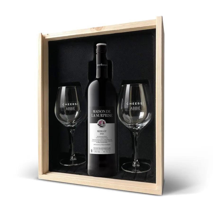 Conjunto de presente de vinho com taças - Maison de la Surprise Merlot - Taças gravadas