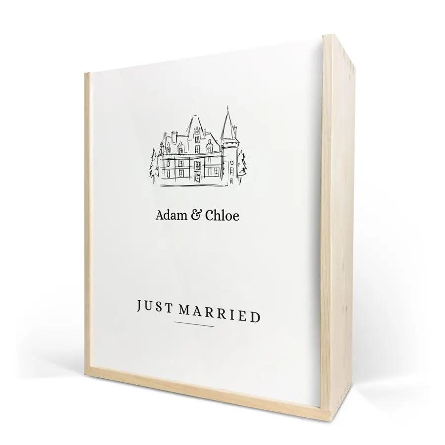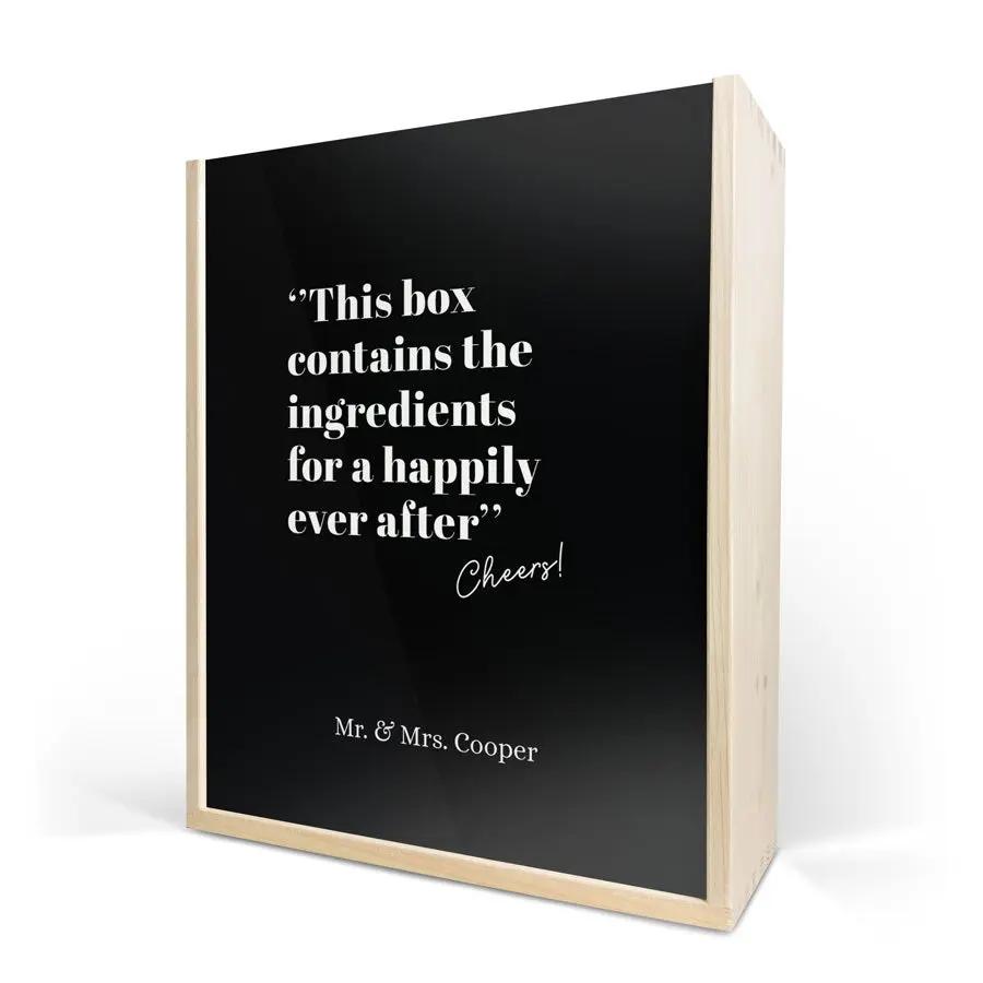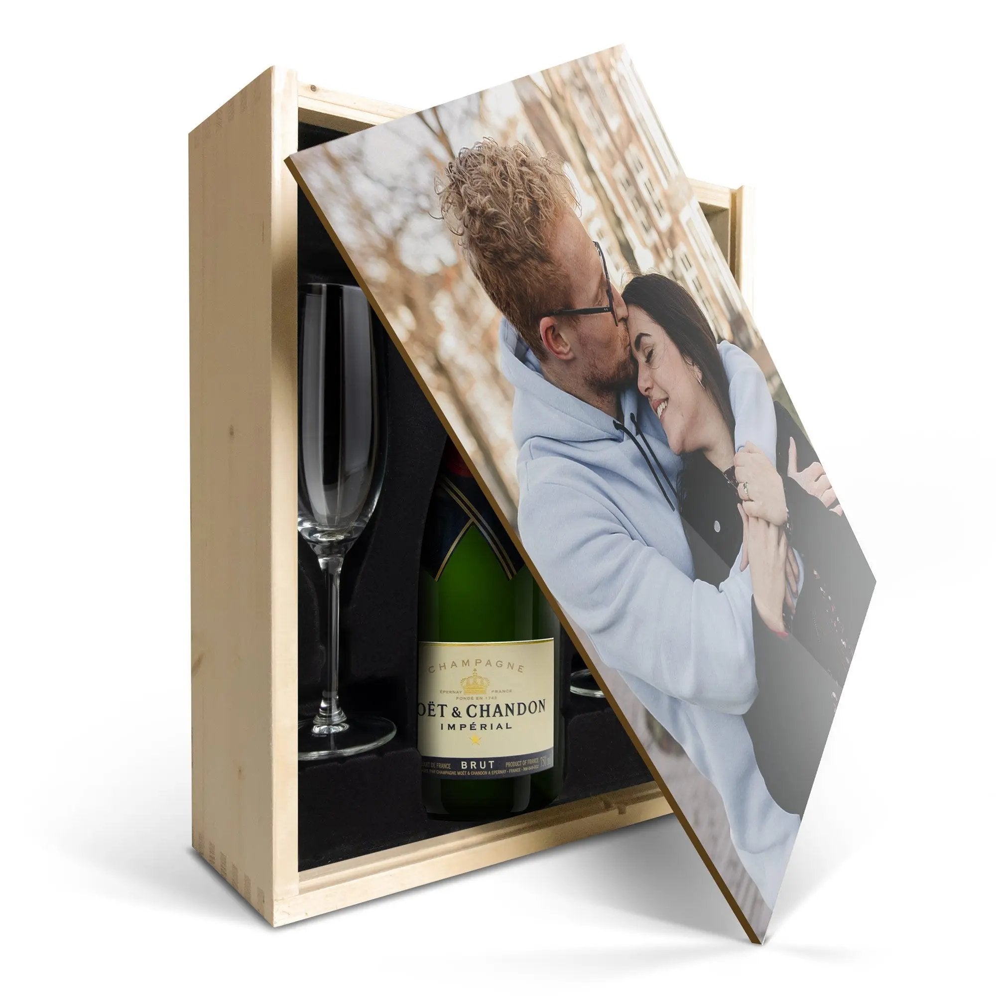 Uma requintada garrafa de champanhe Moët & Chandon com dois copos. Em uma luxuosa caixa de madeira personalizada, com seu design. Saúde!