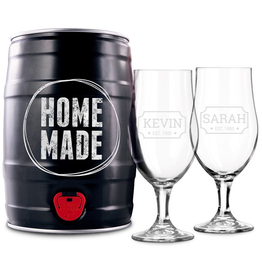 Mais informações sobre os copos de cerveja: Número: 2 peças Marca: Royal Leerdam Diâmetro: 9,5 cm Altura: 20 cm Volume: 16,5 oz Personalização: Com um nome e/ou texto Local da personalização: em um lado do copo Gravação: imagem gravada a laser de alta qualidade Extra: você pode gravar cada um dos copos de cerveja Mais informações sobre o barril de fermentação Tipo de cerveja: Lager Material: alumínio Dimensões: 26,5 x 18 x 25,3 cm Teor alcoólico: 5-6,5% Conteúdo do barril de fermentação: O barril de fermentação vem com um manual prático Ingredientes: 1 saco de extrato de malte de cevada -23 oz-, (malte de cevada, água, ácido láctico), 1 garrafa de aroma de lúpulo -0,3 fl oz-, 1 sachê de fermento seco (fermento seco, emulsificante sorbitano monostearato)