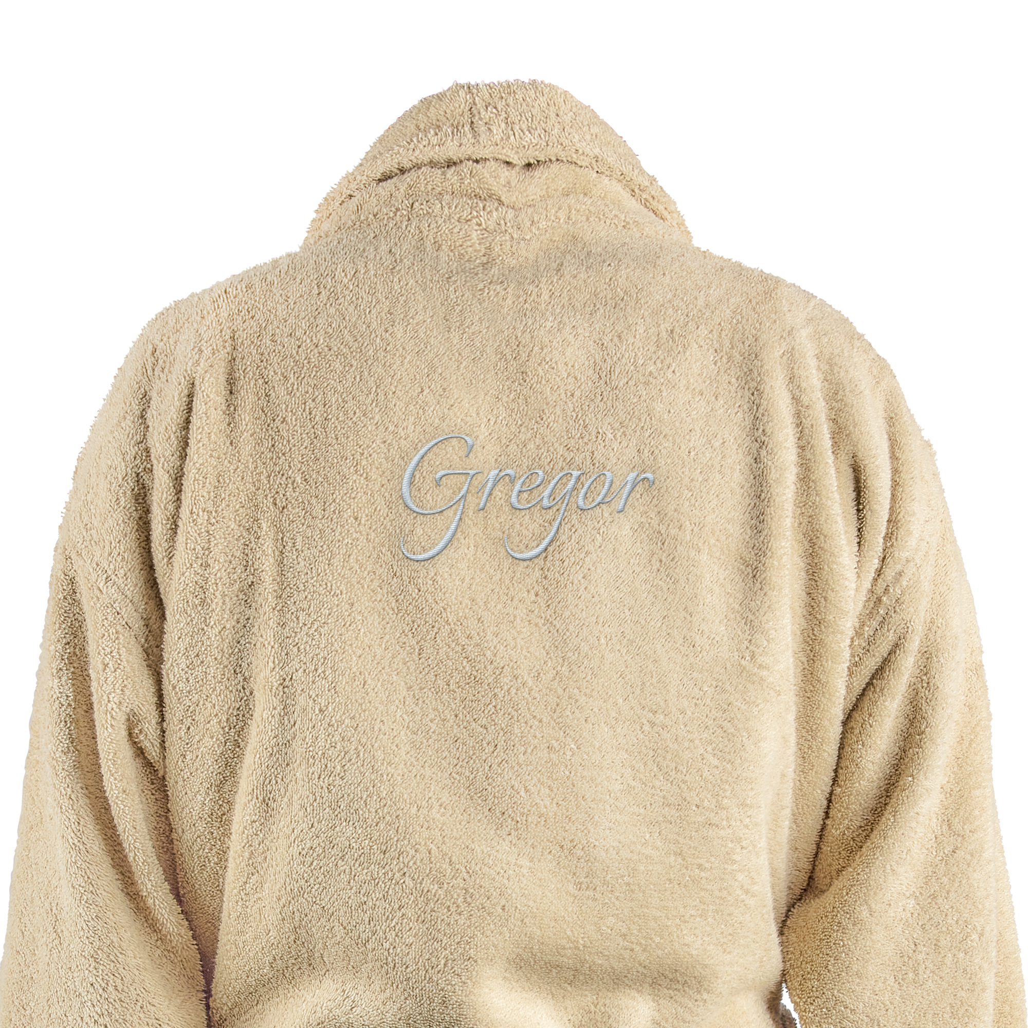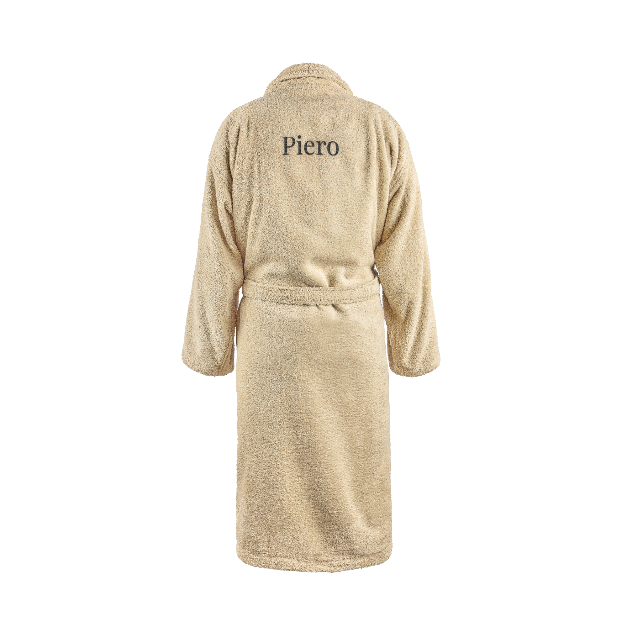 Mais informações sobre o roupão:Cor: begeTamanho: L/XLMaterial: 100% algodão macioQualidade: 380 gr/m2Modelo: básicoComprimento: 120 cmLargura do ombro: 21 cmLargura das costas: 65 cmComprimento da manga: 56 cmPersonalização: com nome ou texto nas costasMétodo de personalização: lindo bordadoInformações adicionais: tecido antiestático e respirávelInstruções de lavagem: lavar a 40°C