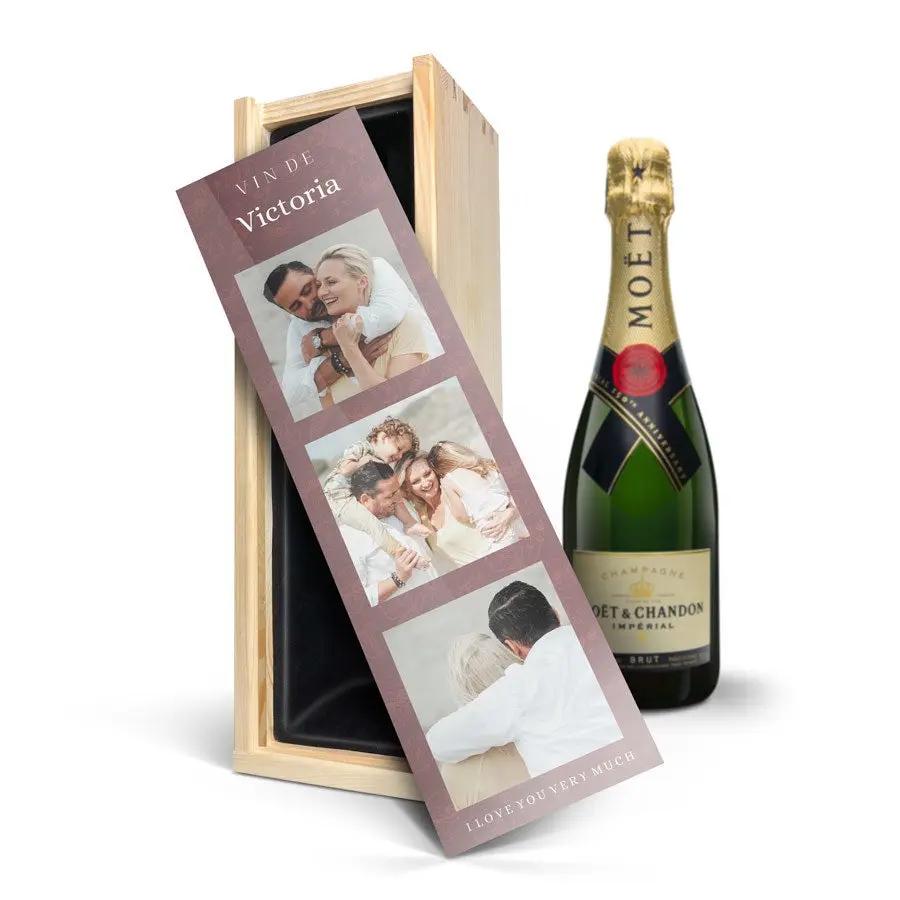 Uma deliciosa garrafa de verdadeiro champanhe Moët & Chandon em uma caixa de madeira gravada com seu nome ou texto. Vários tamanhos de garrafa disponíveis!