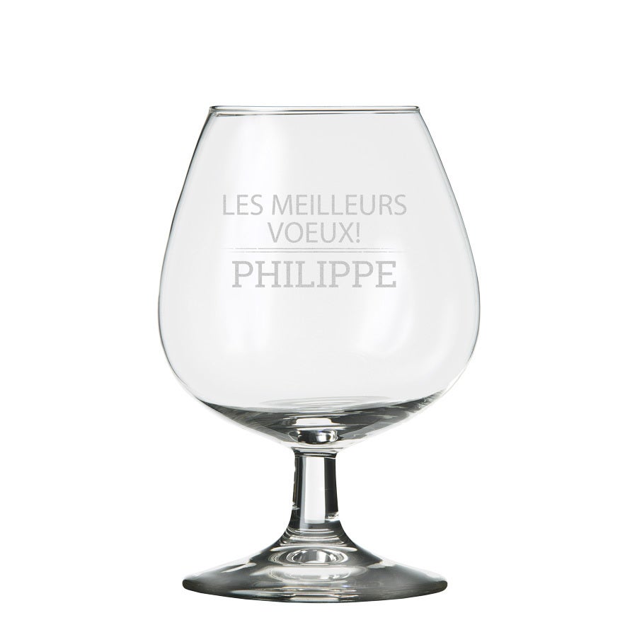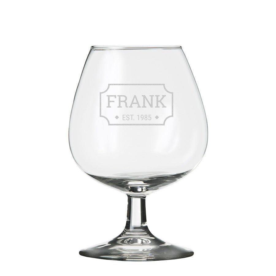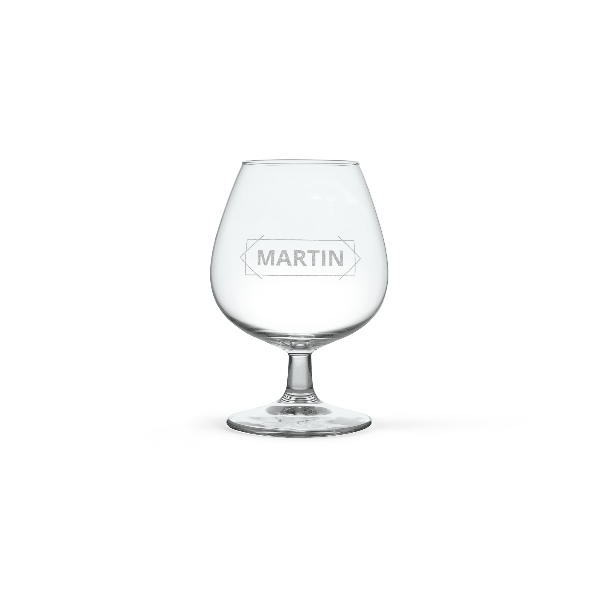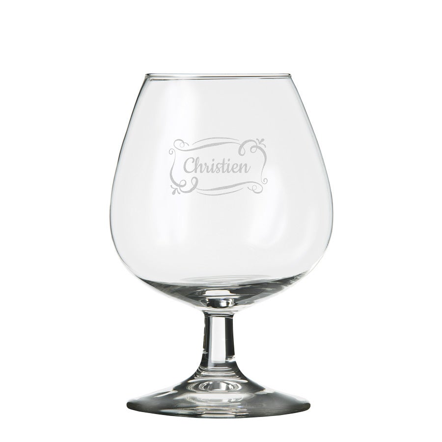 Mais informações sobre o copo de conhaque: Diâmetro: 7,5 cm Altura: 12,5 cm Capacidade: 37cl Personalização: Com um nome e/ou texto Gravação: branca, o resultado final pode variar da imagem de pré-visualização Extra: Lavável na máquina de lavar louça Peça também uma garrafa de conhaque personalizada.