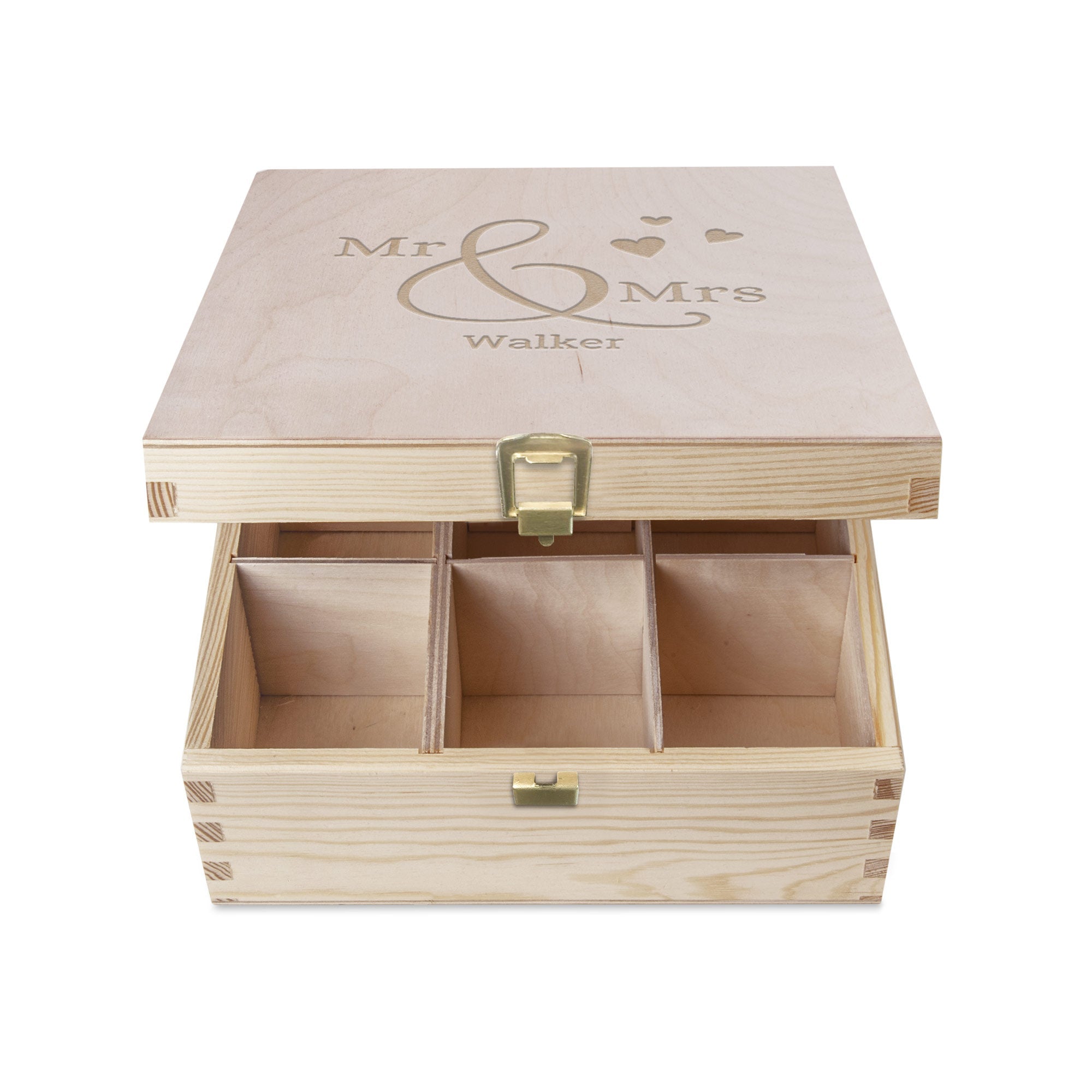 O melhor presente para o seu amante de chá favorito. Luxuosa caixa de chá de madeira com copo de chá gravado. Verdadeiramente pessoal com o nome ou texto de sua escolha!