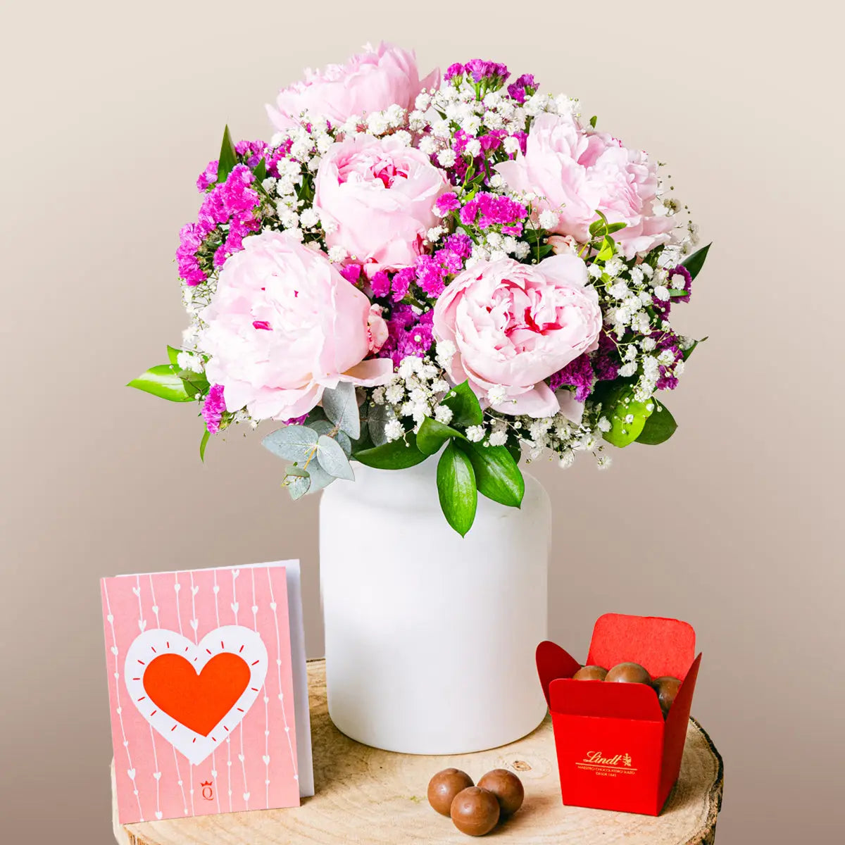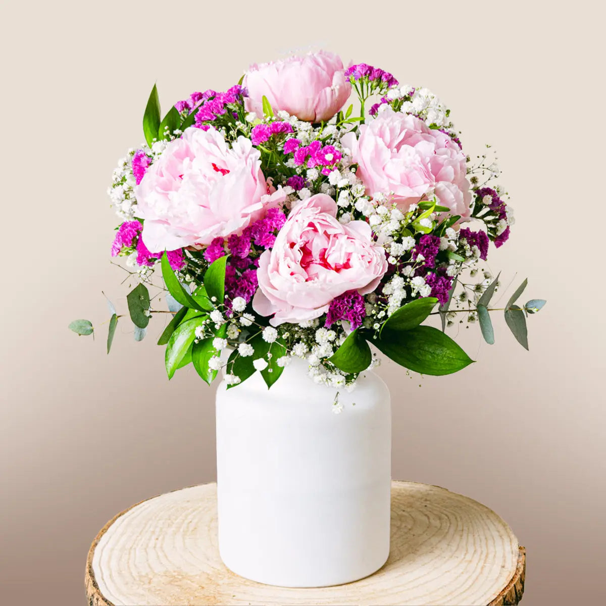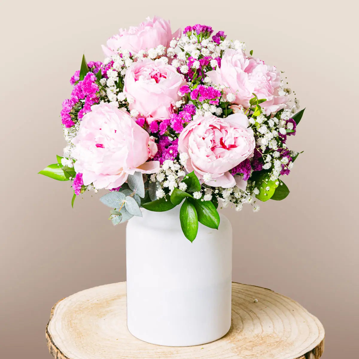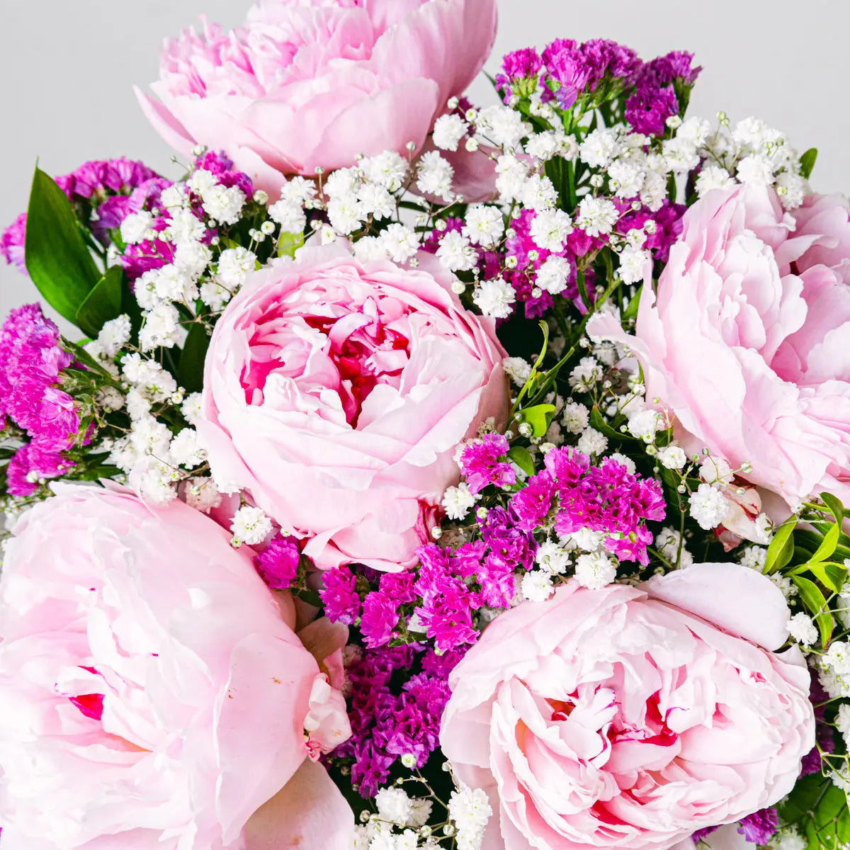 Este lindo e romântico arranjo é composto por peônias rosas, gipsófilas e fúcsia-estática. As peônias rosas conferem um tom doce e romântico, enquanto a gipsófila e a fúcsia-estática adicionam um toque de cor e diversão. As peônias, com suas flores grandes e profundas, juntamente com a gipsófila e a fúcsia-estática, criam um buquê único e exclusivo. Ideal para uma ocasião especial, pois é uma bela maneira de expressar seu amor.