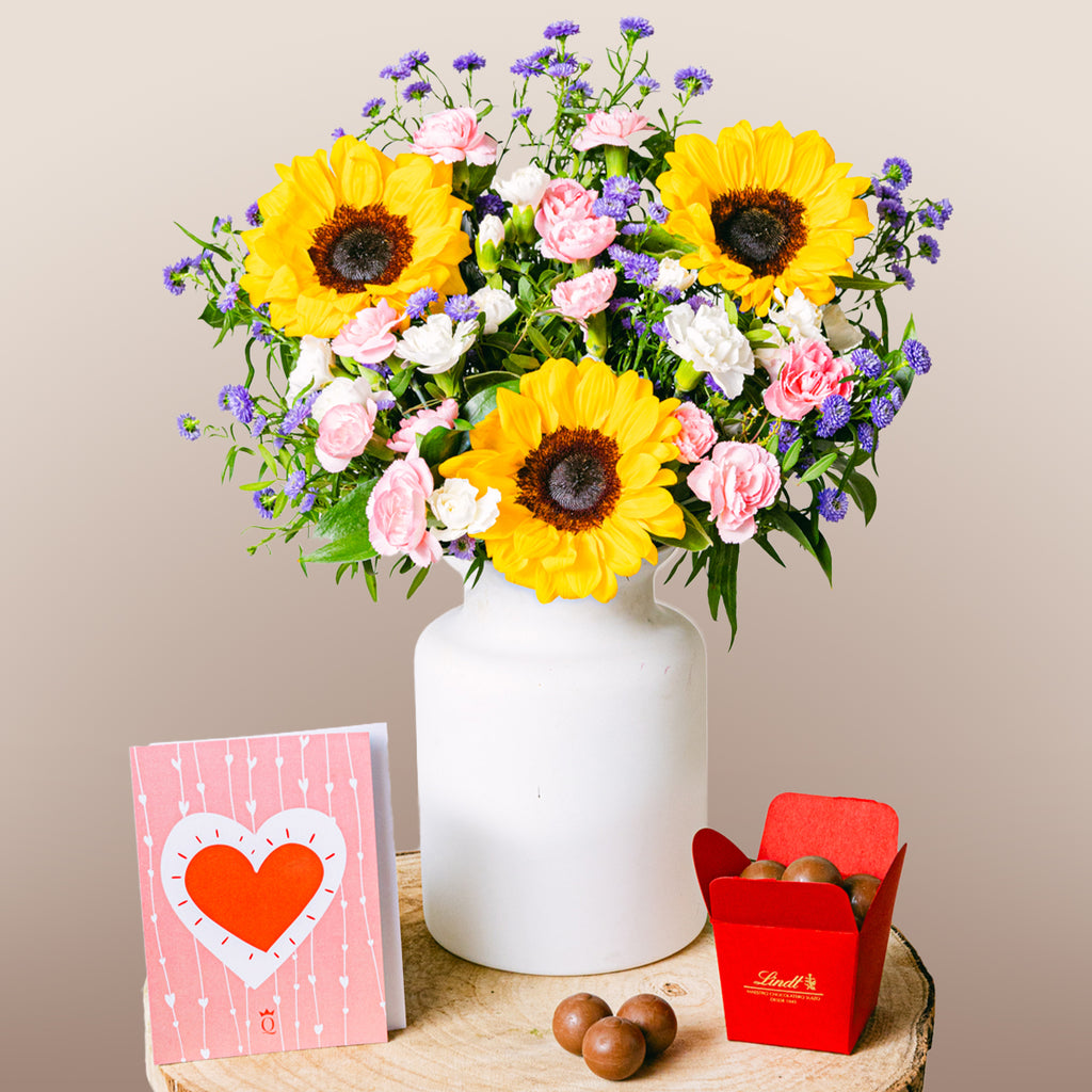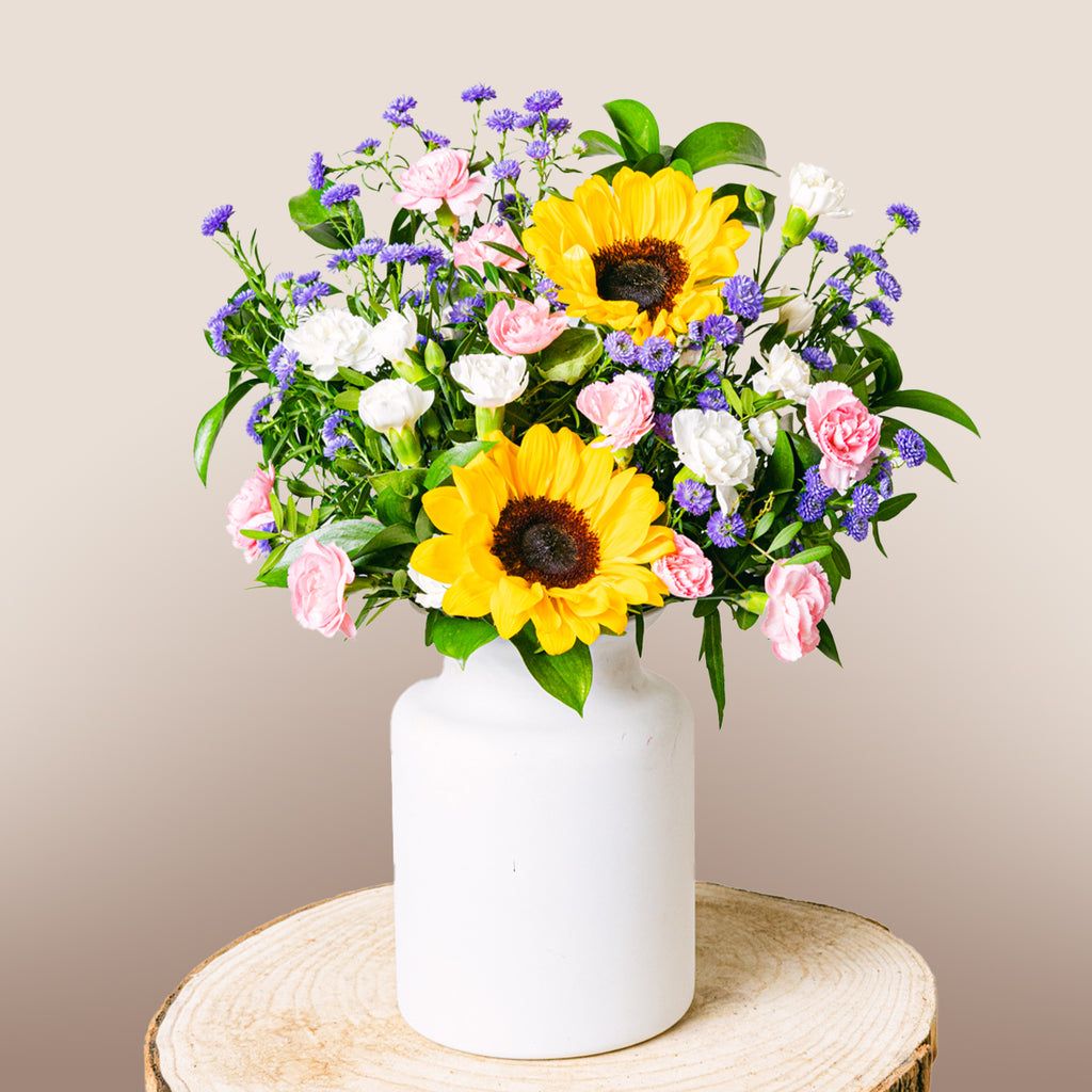 Convide aquela pessoa especial para vivenciar um pôr do sol colorido na sala de estar. Graças ao amarelo do girassol, ao roxo do limonium e ao tom avermelhado do lentisco, nosso buquê Vibrant Sunset evoca um lindo pôr do sol de verão. Perfeito para... dizer parabéns ou para lembrar aquela pessoa especial o quanto ela te faz feliz.