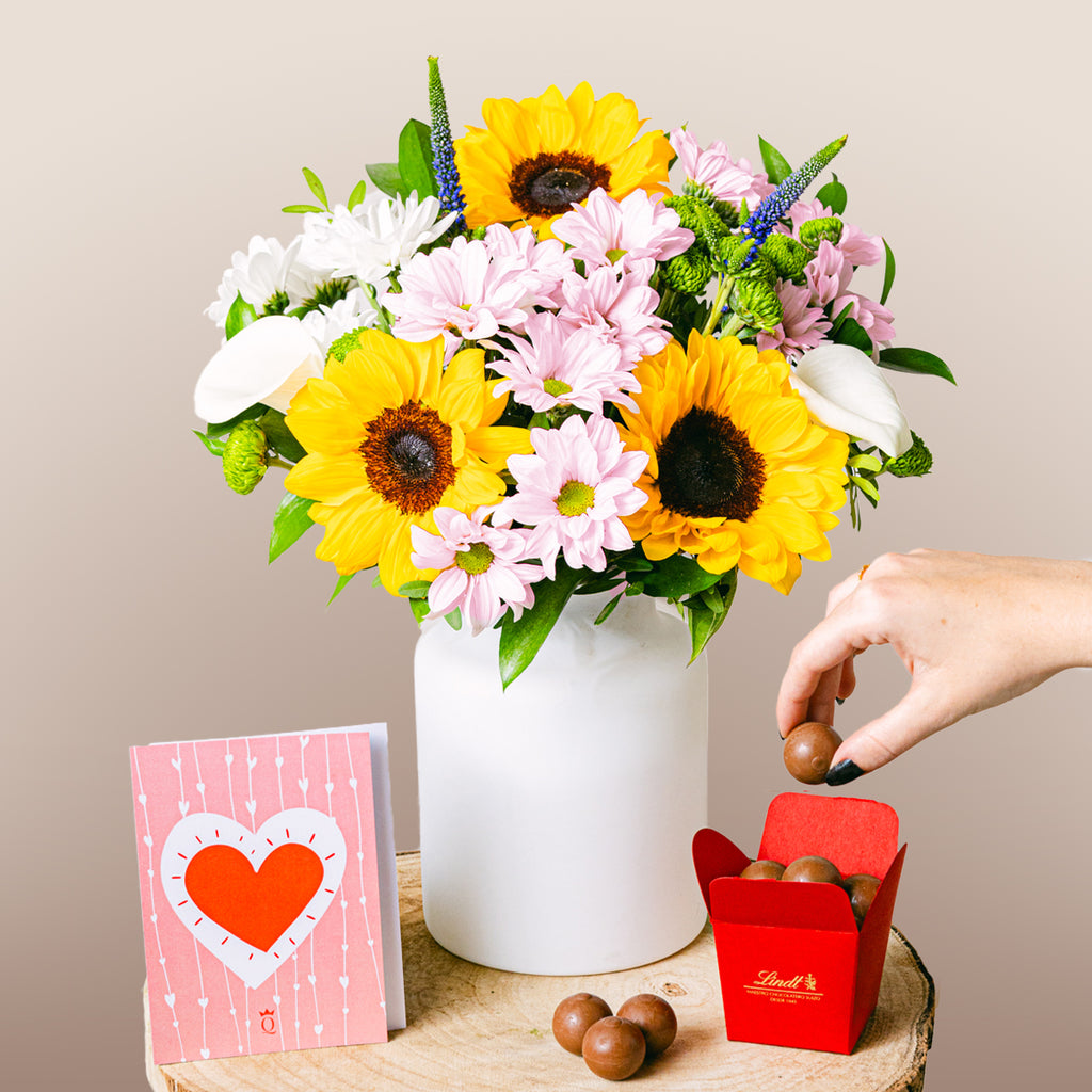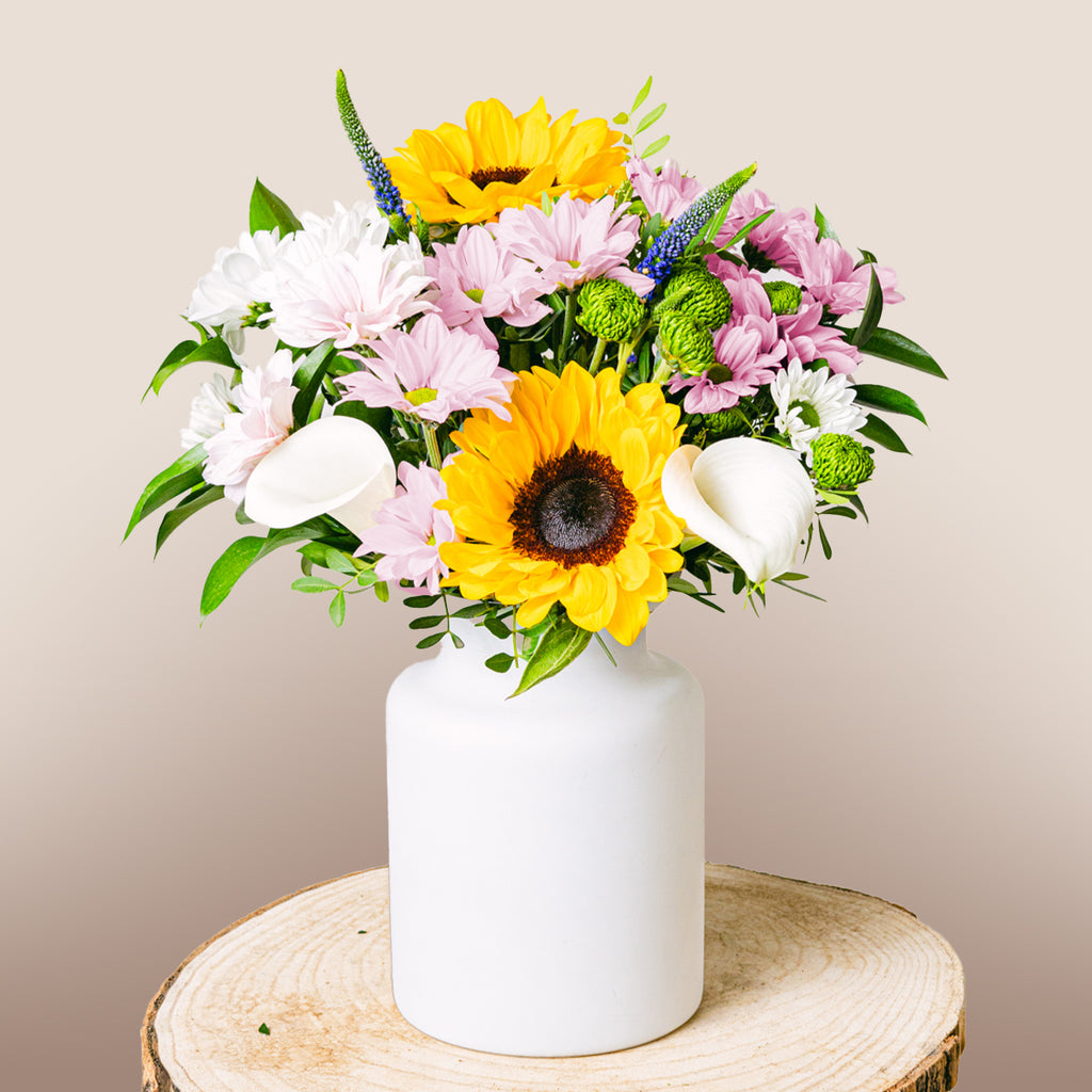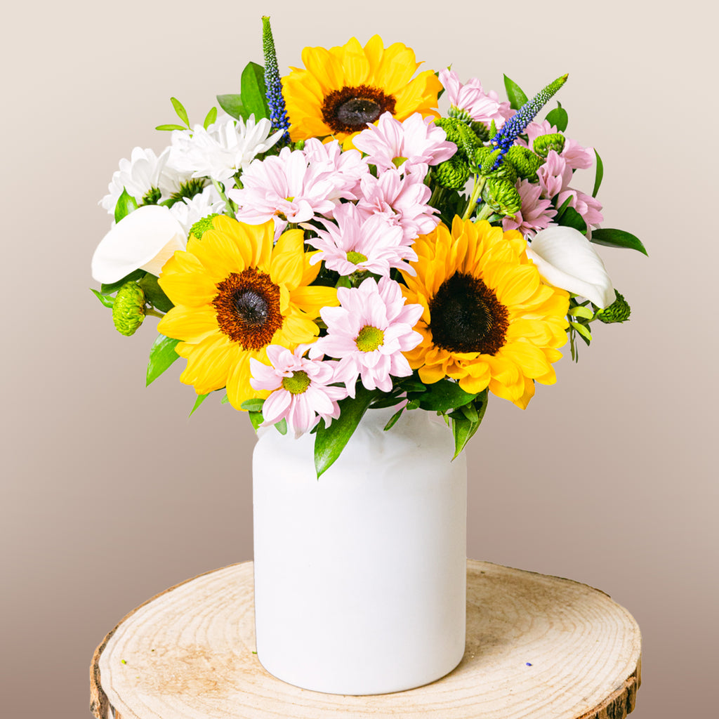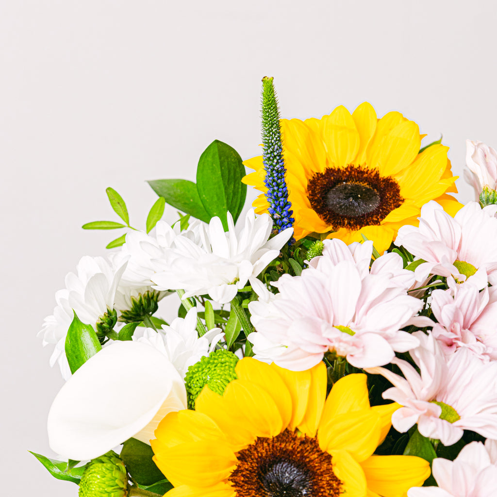 Sunny Lily, um buquê que captura o calor dos girassóis e a pureza dos copos-de-leite, combinados com crisântemos coloridos e a delicada verônica branca. Surpreenda-os com este alegre arranjo de flores frescas. Perfeito para... encher um escritório sem graça com luz.